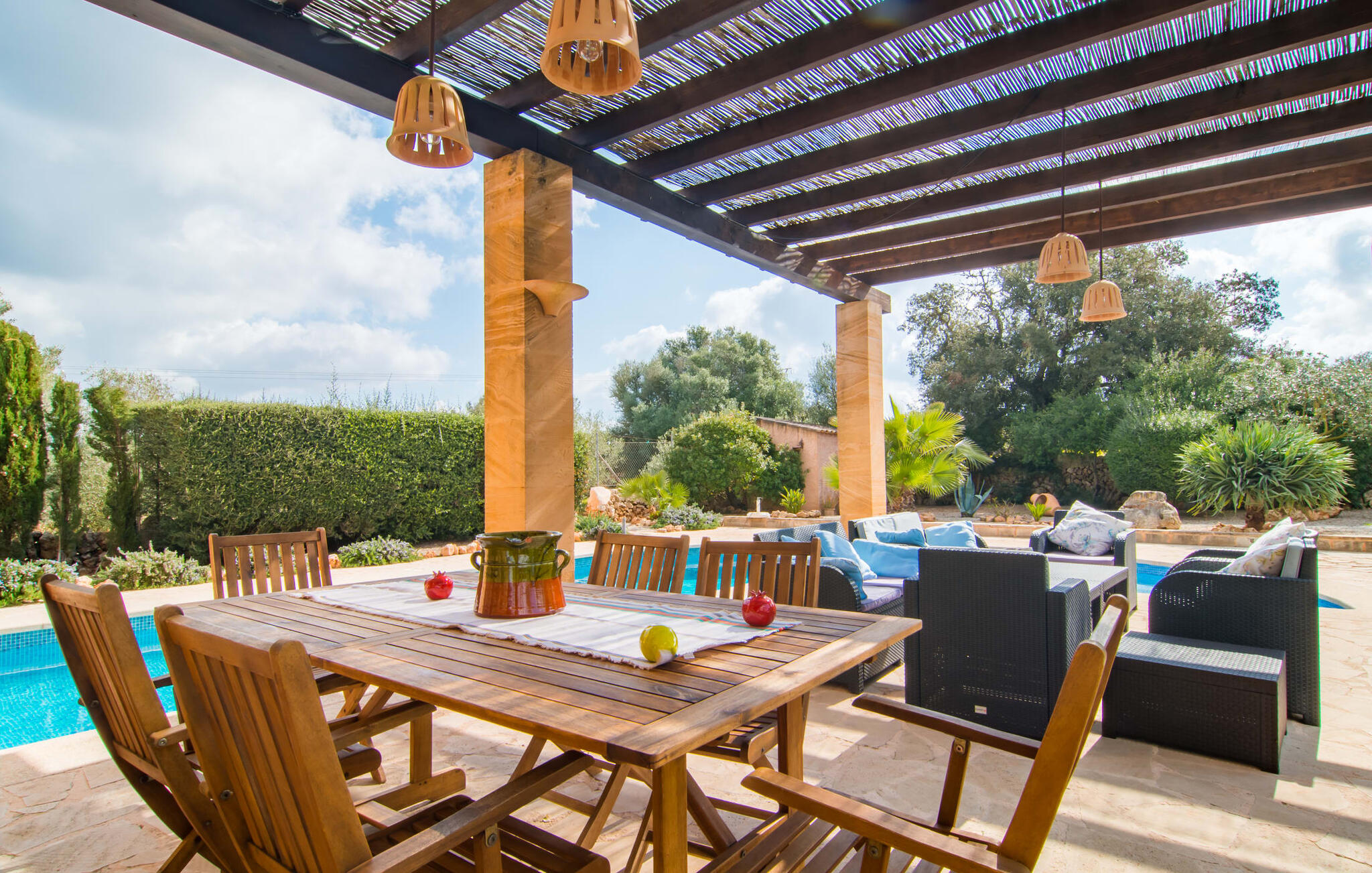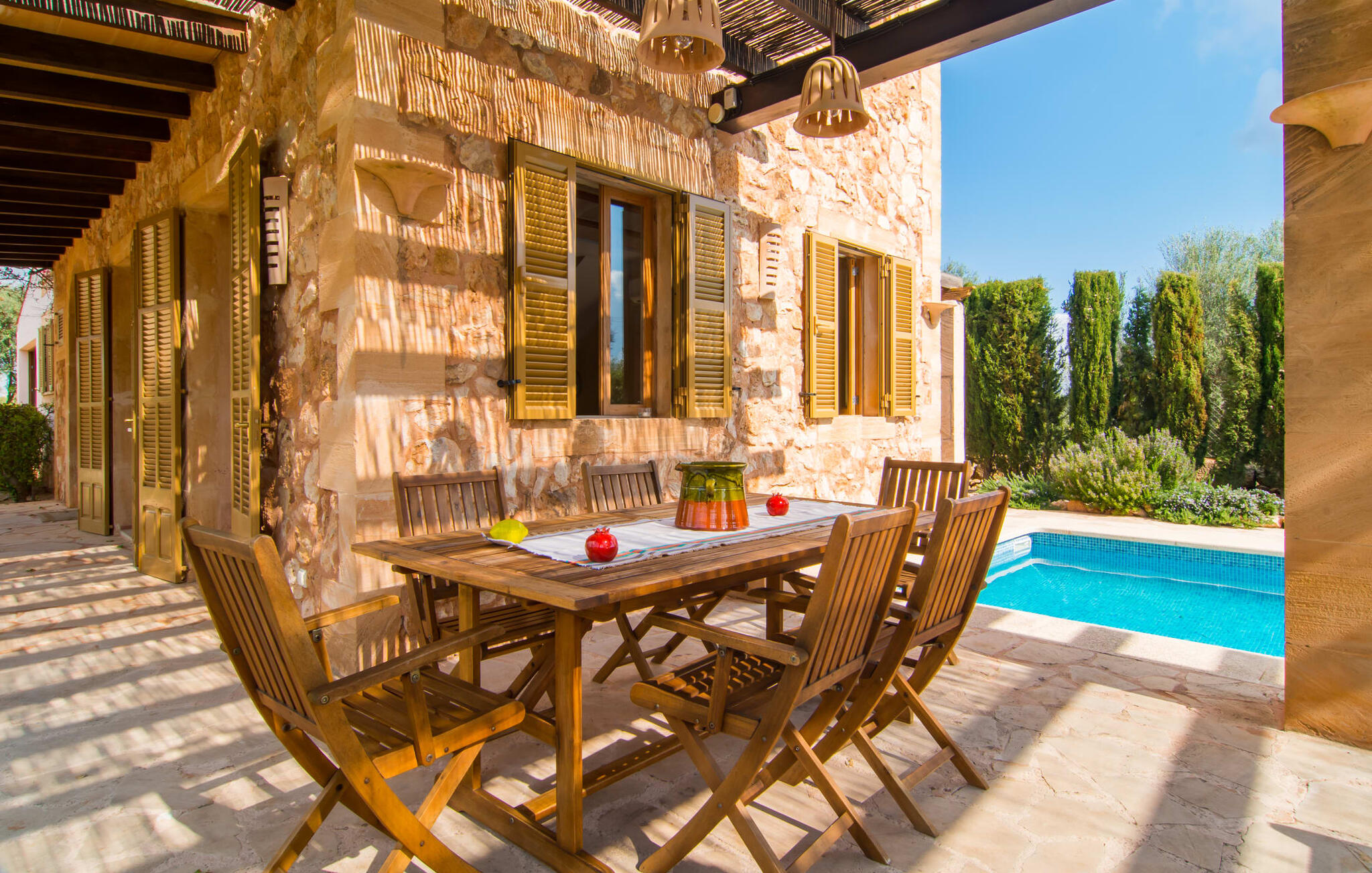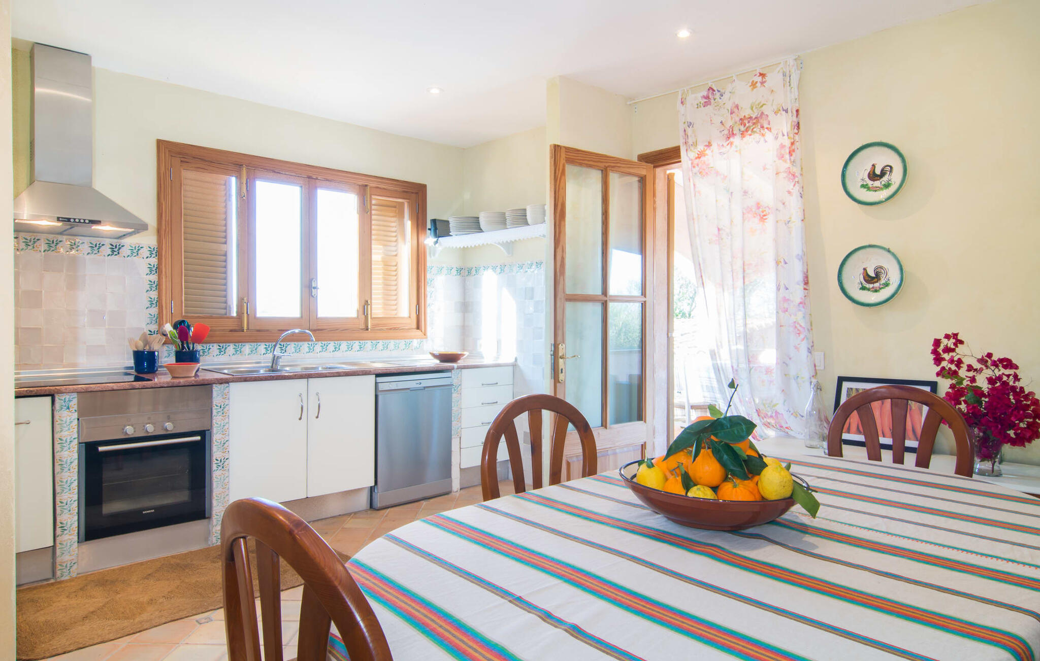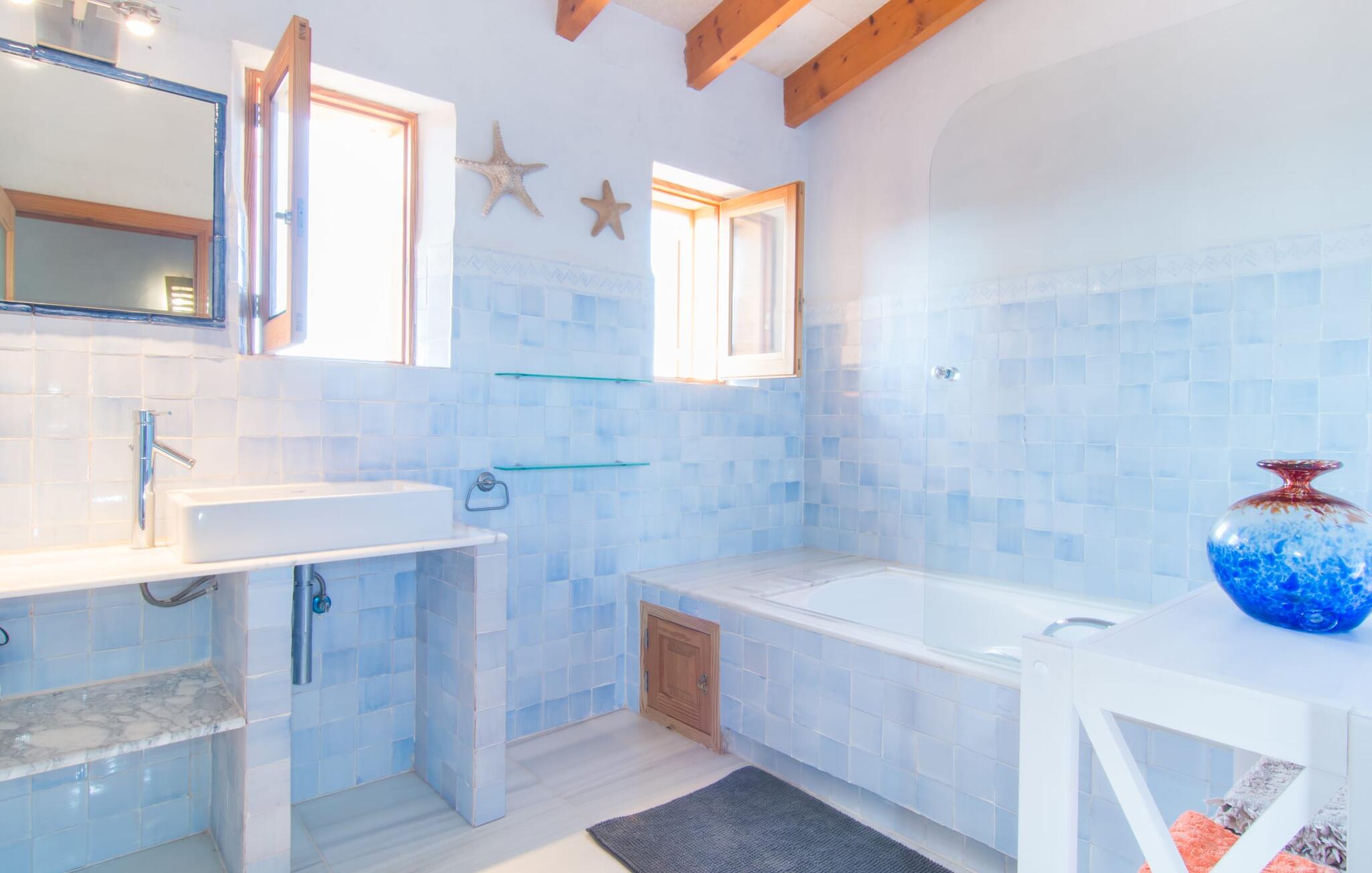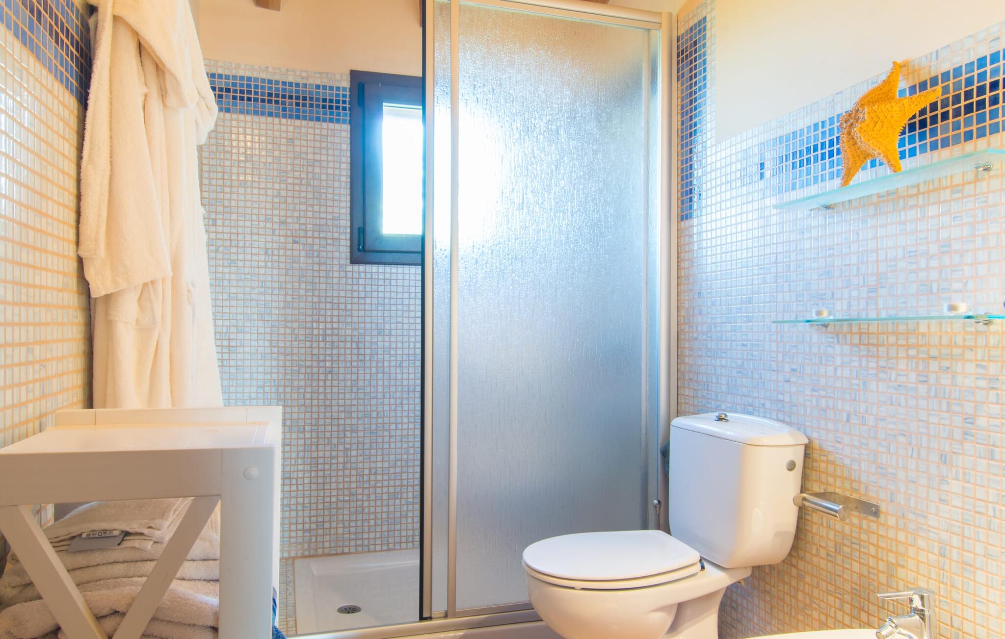 Net als een vrucht die levert wat de buitenkant belooft, stelt de binnenkant ook niet teleur: Mallorcaans, nuchter, zonnig en bloemig. Een frisse bries lijkt door het huis te waaien en luchtige gordijnen geven de ruimte een lichte touch. De ruime, open woon-, kook- en eetruimte wordt omringd door gezellige, felblauwe banken die je uitnodigen om je onder te dompelen in een filmavondje. Natuurlijk kun je ook wegdromen in de aangenaam eenvoudige slaapkamers met massief houten bedden; de slaapkamers zijn ingericht met een keuze uit donkerder of lichter gekleurd meubilair en een van de slaapkamers boven heeft directe toegang tot een beschut balkon met prachtig uitzicht over de bomen naar de bergen daarachter. Als je hier slaapt, kun je de deur open laten. De badkamers, een op de begane grond en een op de bovenverdieping, worden gedeeld door twee slaapkamers. Het enige dat nog genoemd moet worden is de moderne, goed uitgeruste keuken met een eigen plekje in de zon, aan de muren waarvan knapperige, verse groenten van de wekelijkse markt in Campos smakelijk hangen: een paradijs voor vegetariërs en liefhebbers van rauwkost, ware het niet dat de fantastische gemetselde barbecue voor de deur er om schreeuwt gebruikt te worden. Het zou zonde zijn om niet... ¡Buen provencho!