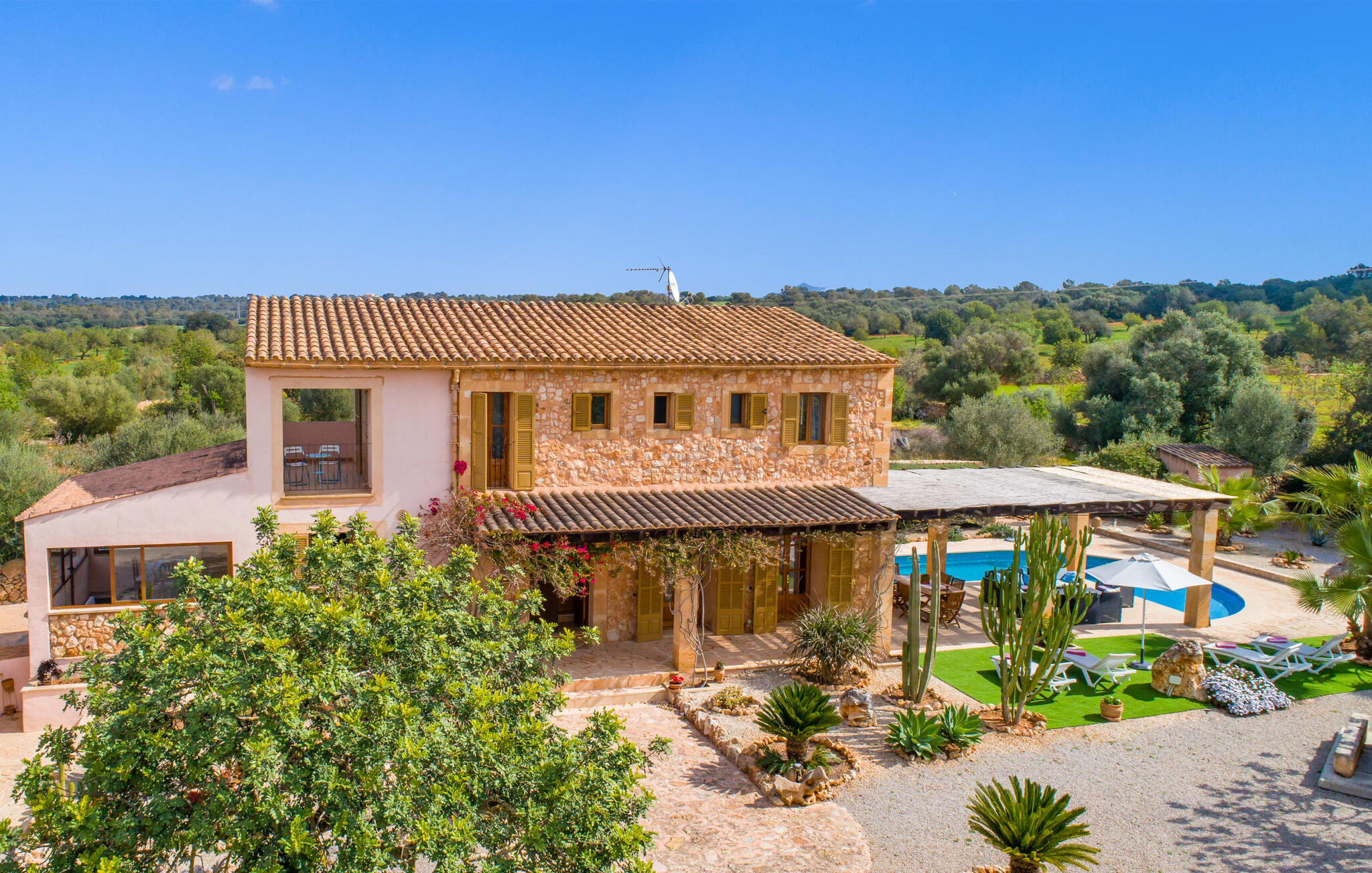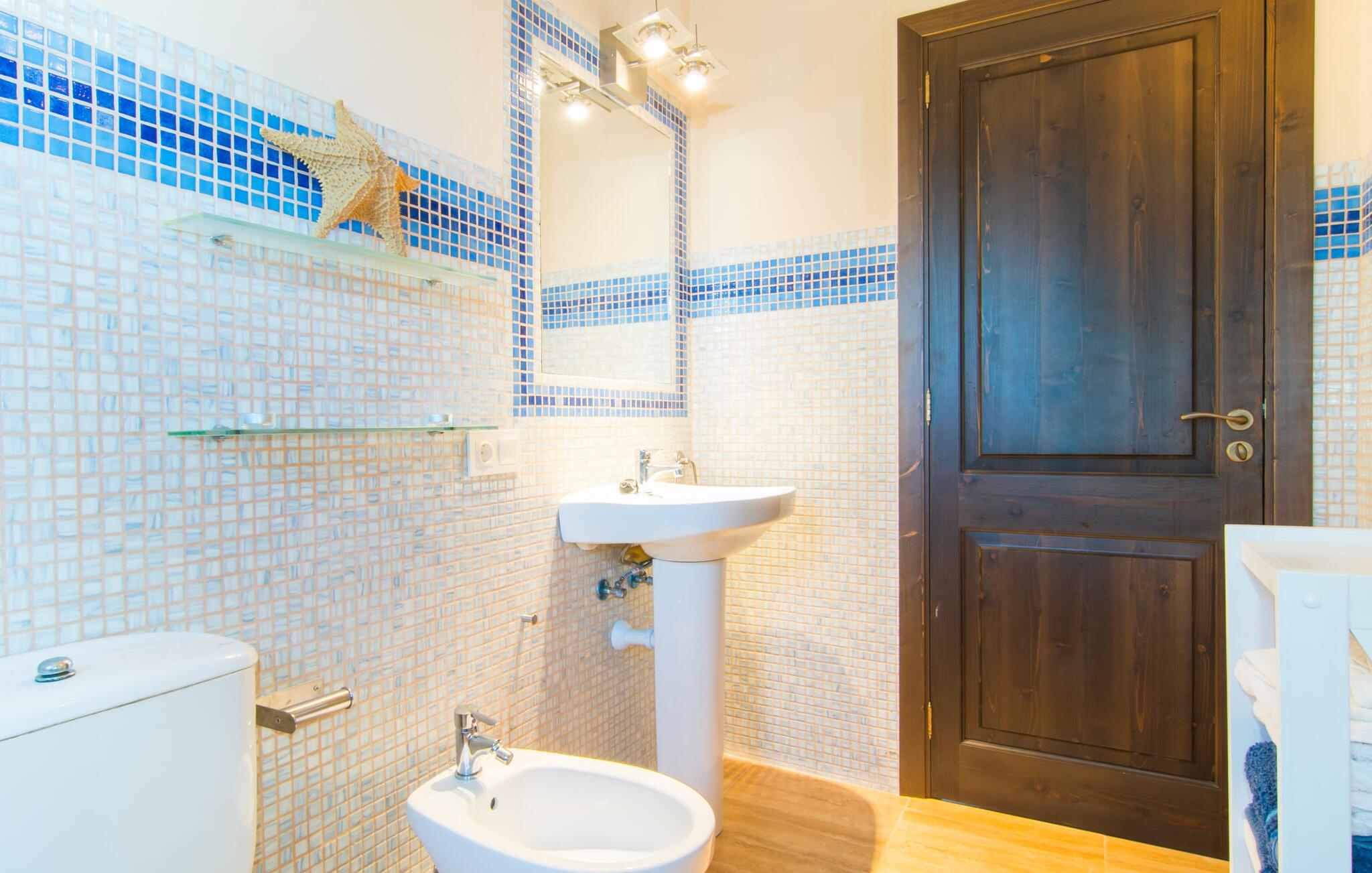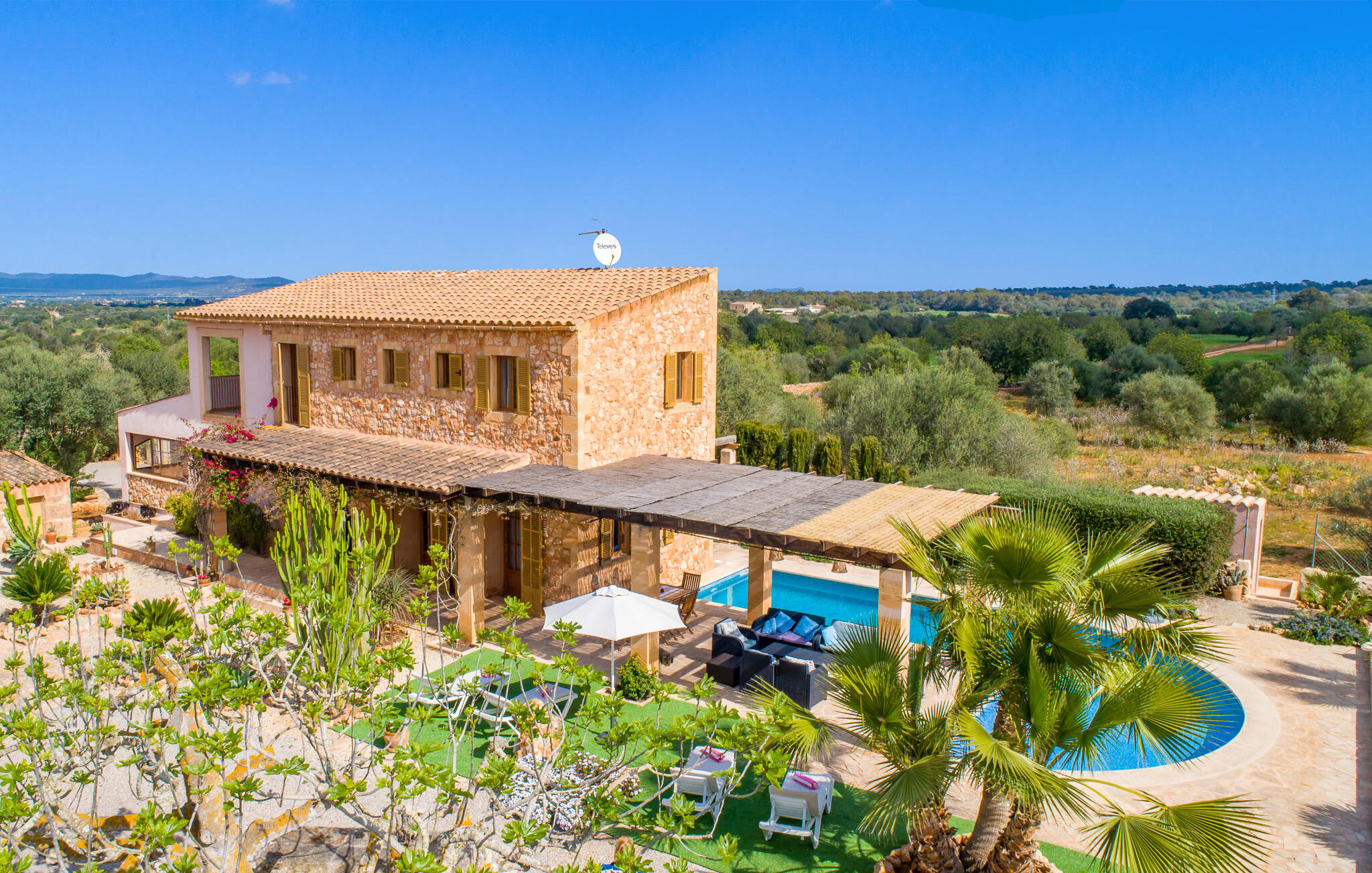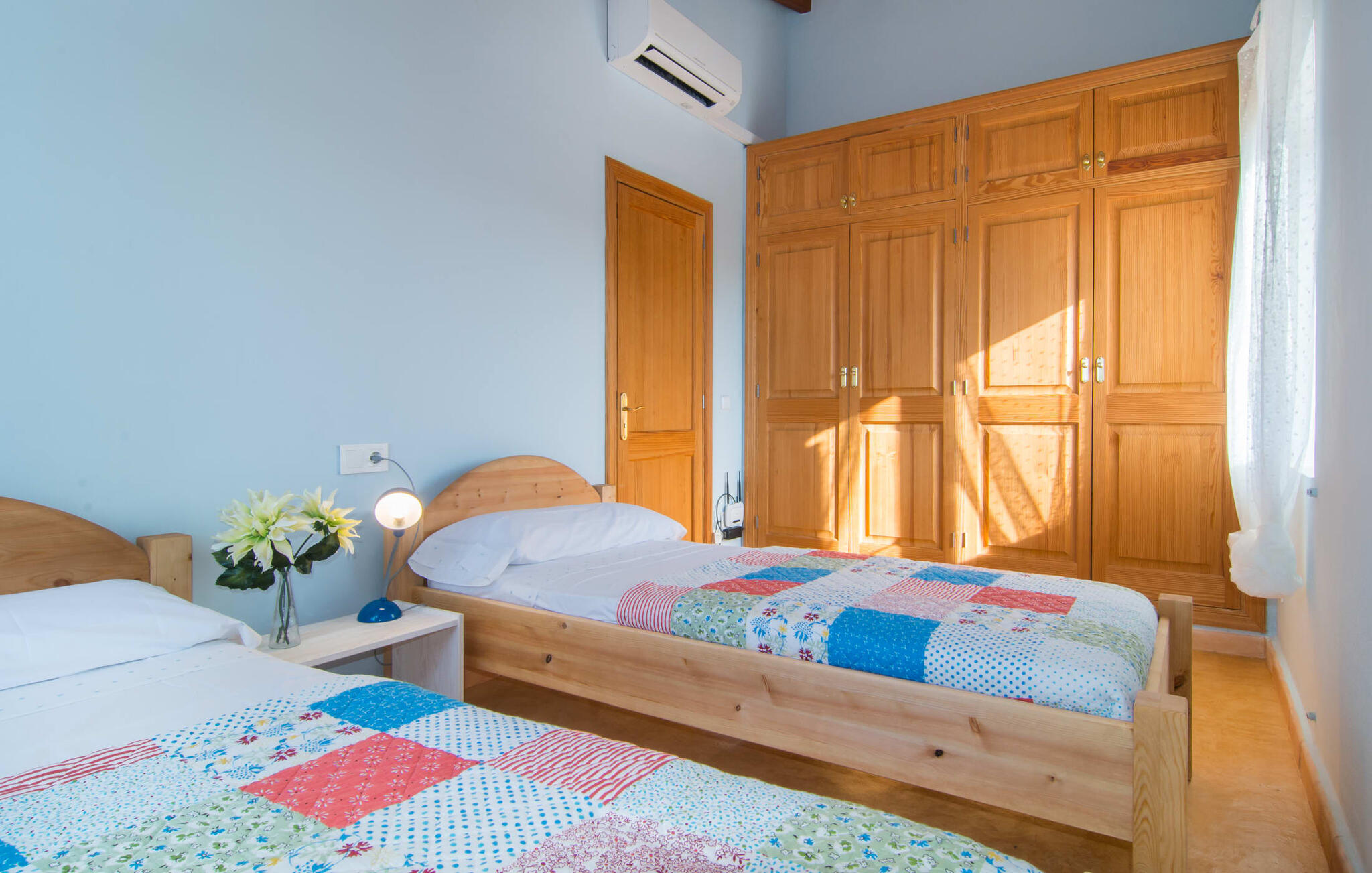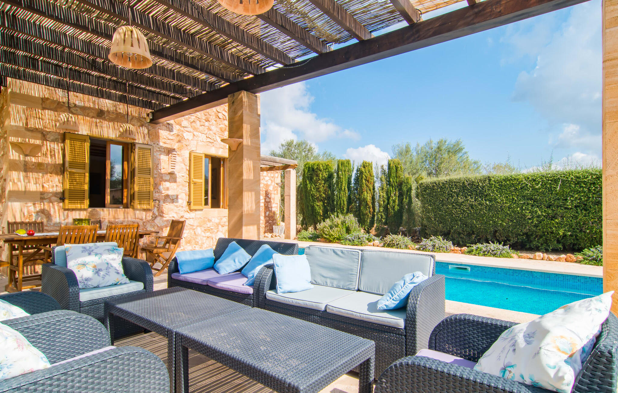 Net als een vrucht die levert wat de buitenkant belooft, stelt de binnenkant ook niet teleur: Mallorcaans, nuchter, zonnig en bloemig. Een frisse bries lijkt door het huis te waaien en luchtige gordijnen geven de ruimte een lichte touch. De ruime, open woon-, kook- en eetruimte wordt omringd door gezellige, felblauwe banken die je uitnodigen om je onder te dompelen in een filmavondje. Natuurlijk kun je ook wegdromen in de aangenaam eenvoudige slaapkamers met massief houten bedden; de slaapkamers zijn ingericht met een keuze uit donkerder of lichter gekleurd meubilair en een van de slaapkamers boven heeft directe toegang tot een beschut balkon met prachtig uitzicht over de bomen naar de bergen daarachter. Als je hier slaapt, kun je de deur open laten. De badkamers, een op de begane grond en een op de bovenverdieping, worden gedeeld door twee slaapkamers. Het enige dat nog genoemd moet worden is de moderne, goed uitgeruste keuken met een eigen plekje in de zon, aan de muren waarvan knapperige, verse groenten van de wekelijkse markt in Campos smakelijk hangen: een paradijs voor vegetariërs en liefhebbers van rauwkost, ware het niet dat de fantastische gemetselde barbecue voor de deur er om schreeuwt gebruikt te worden. Het zou zonde zijn om niet... ¡Buen provencho!