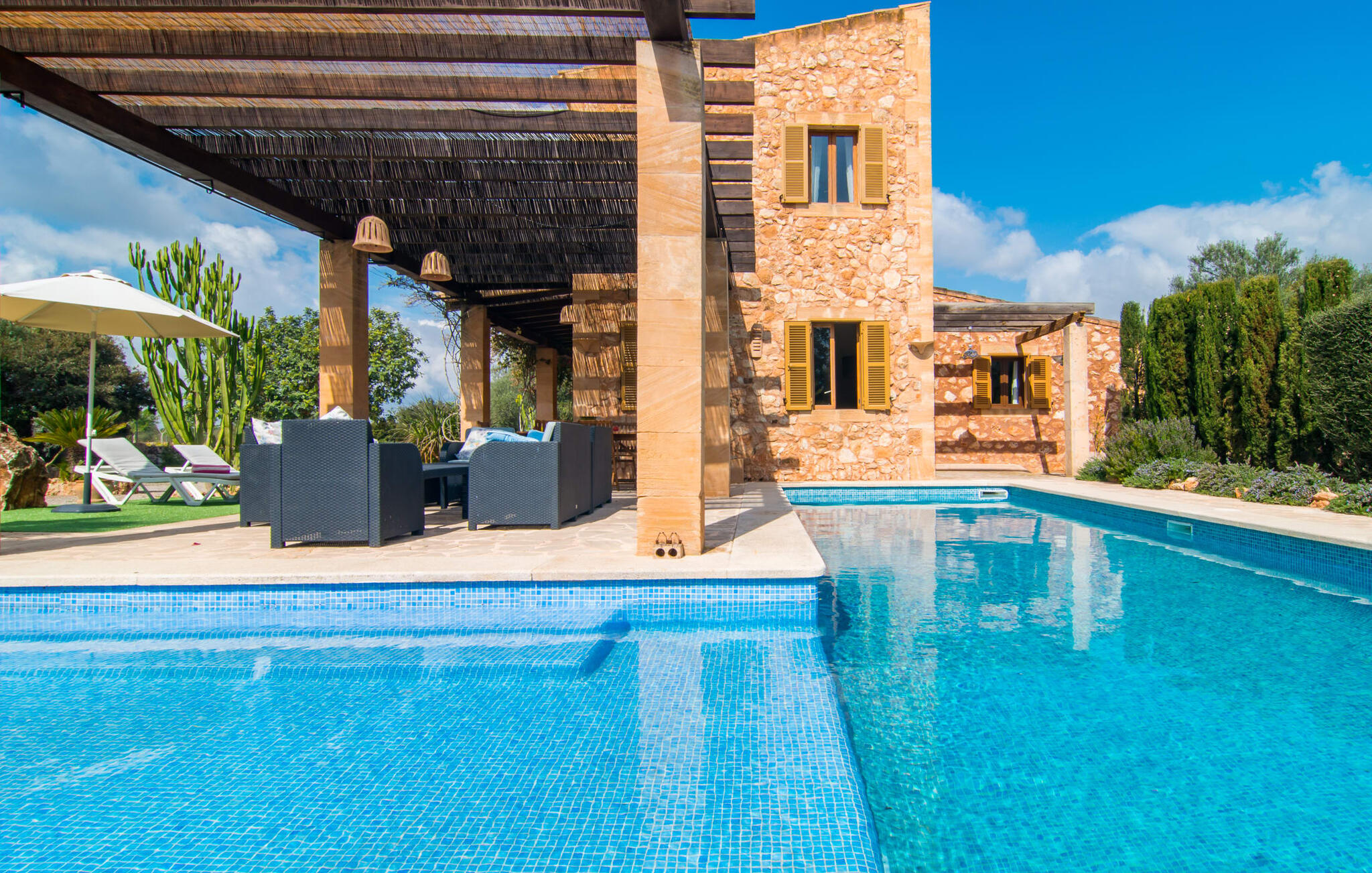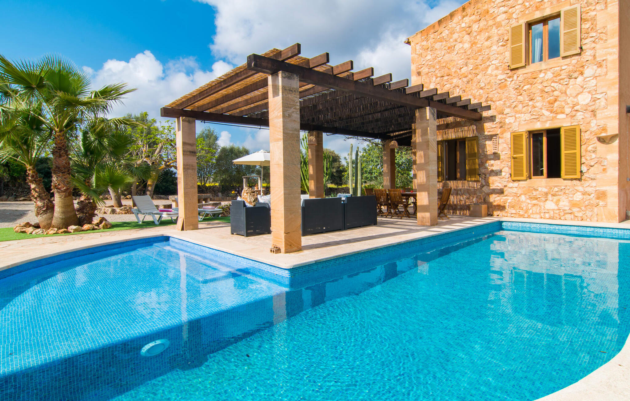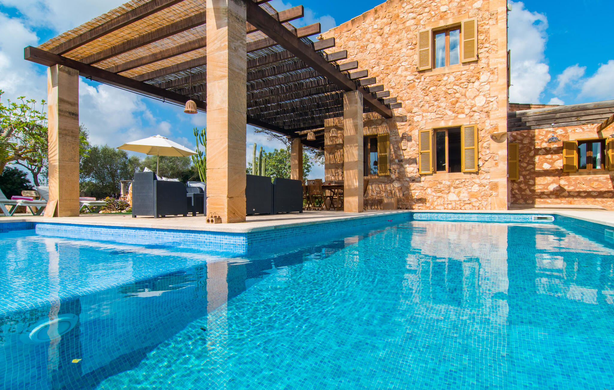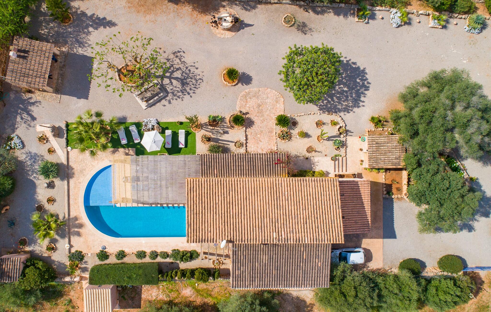 Je zou bijna geloven dat deze saffraankleurige mediterrane villawijk met zijn olijf-, vijgen- en johannesbroodbomen, palmbomen, cipressen en cactussen is ontstaan uit de vruchtbare grond van Campos zelf. Nieuw gebouwd in 2015, zo eerlijk, ongecompliceerd en zongerijpt als een goede wijn, een beetje sprankelend op sommige plekken en vol karakter, wekt zelfs de eerste smaak het verlangen naar meer. Een uniek halvemaanvormig zwembad rond het overdekte terras biedt al het water dat je nodig hebt voor je dagelijkse duik - een echte blikvanger! Hier kun je de dag gezellig afsluiten met een laat ontbijt, een tijdschrift of een glas wijn terwijl de kinderen veilig rondspetteren. Je zou bijna kunnen spreken van een vakantie in een zwembad in plaats van bij het zwembad en je zou in de verleiding kunnen komen om vanuit een van de ramen direct in het koele water te springen (maar doe dat alsjeblieft niet, het is roekeloos en je zult jezelf bezeren). )... maar Ca Na Carmen zorgt ervoor dat je je hoofd niet verliest.