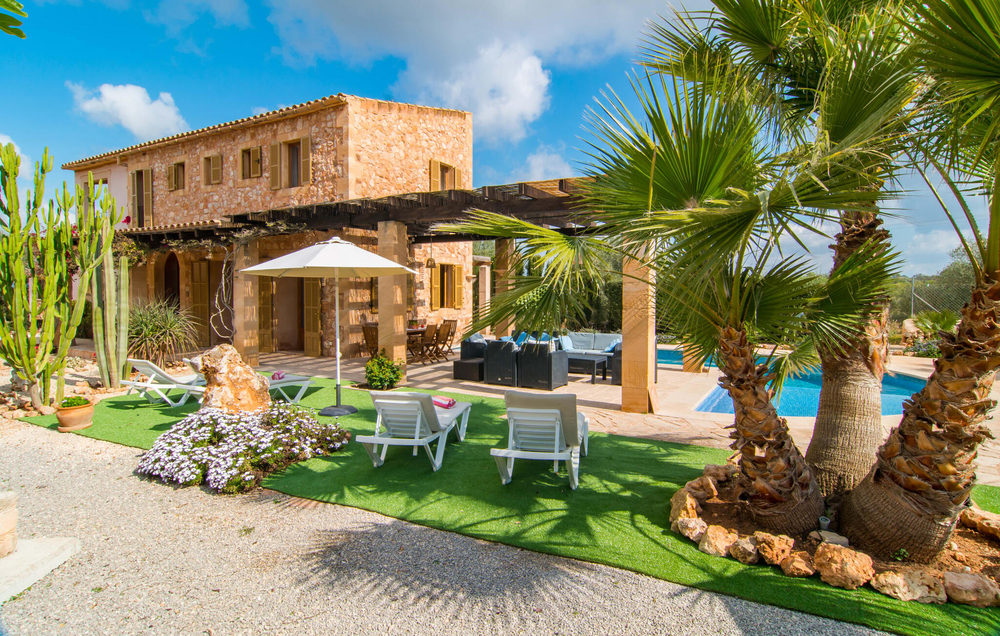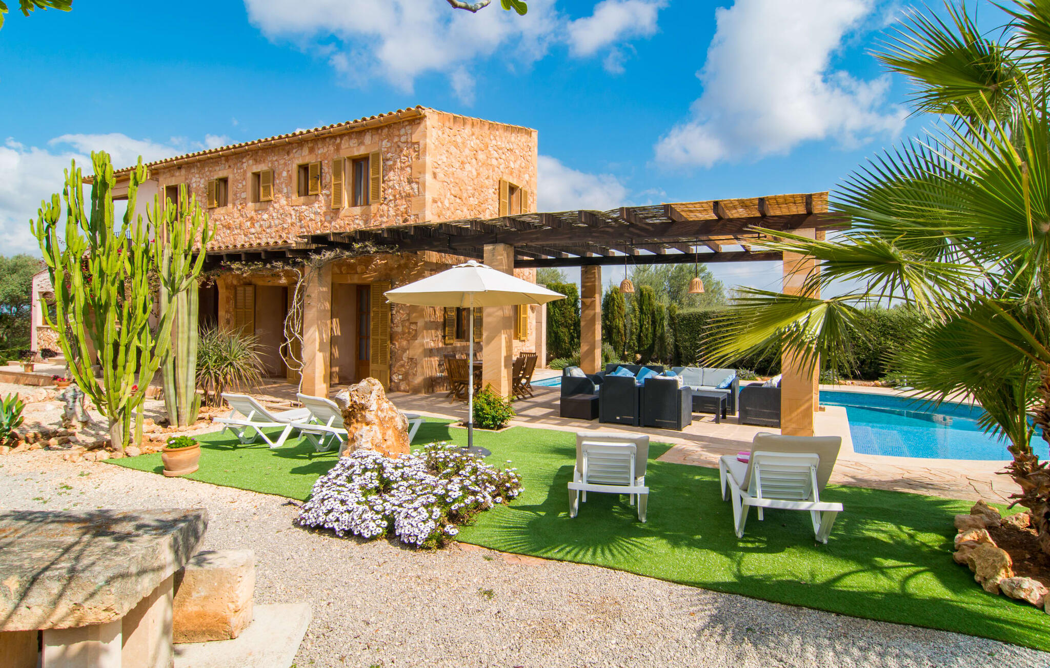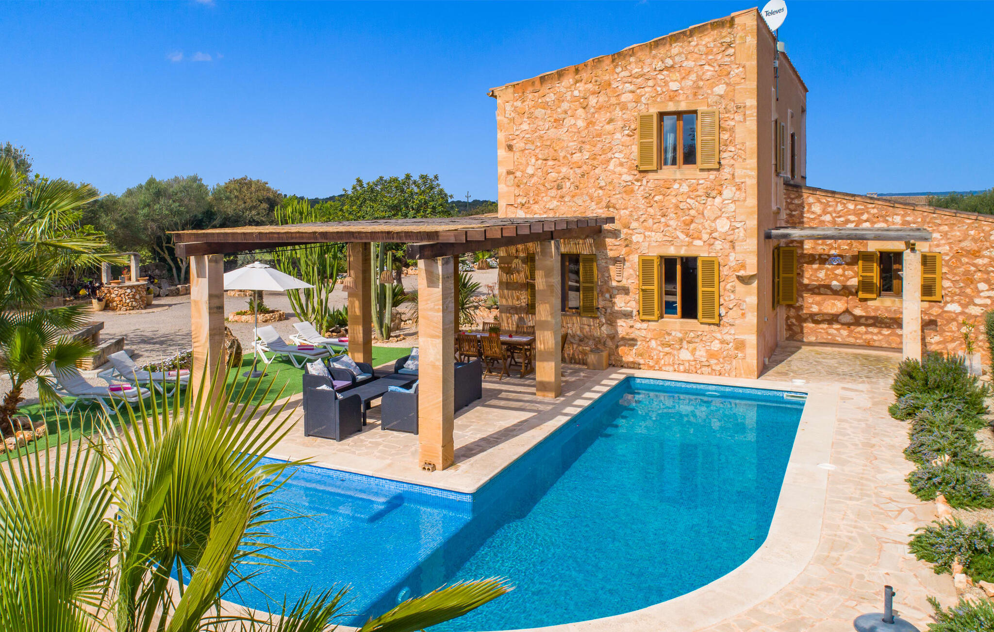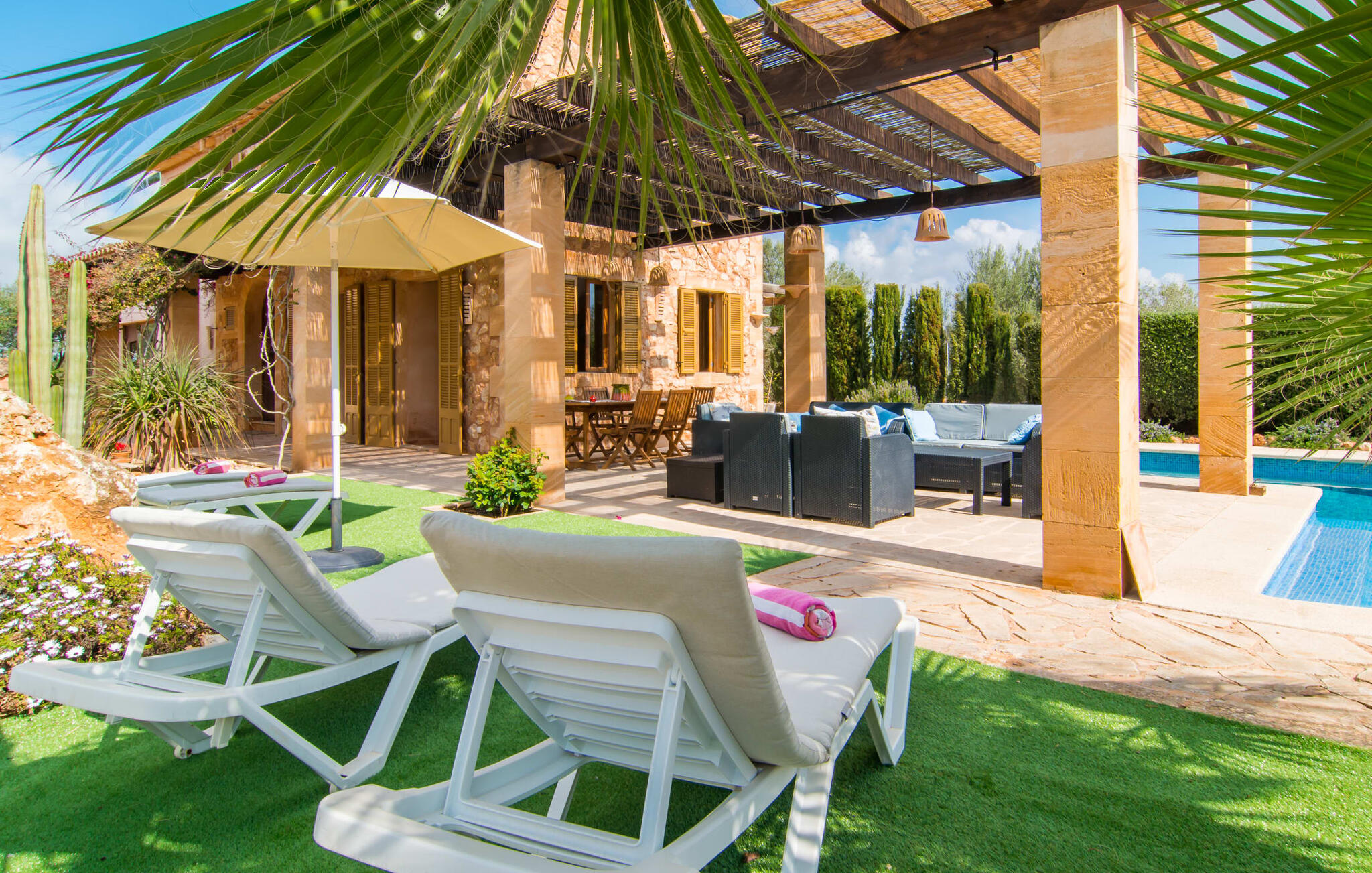 Je zou bijna geloven dat deze saffraankleurige mediterrane villawijk met zijn olijf-, vijgen- en johannesbroodbomen, palmbomen, cipressen en cactussen is ontstaan uit de vruchtbare grond van Campos zelf. Nieuw gebouwd in 2015, zo eerlijk, ongecompliceerd en zongerijpt als een goede wijn, een beetje sprankelend op sommige plekken en vol karakter, wekt zelfs de eerste smaak het verlangen naar meer. Een uniek halvemaanvormig zwembad rond het overdekte terras biedt al het water dat je nodig hebt voor je dagelijkse duik - een echte blikvanger! Hier kun je de dag gezellig afsluiten met een laat ontbijt, een tijdschrift of een glas wijn terwijl de kinderen veilig rondspetteren. Je zou bijna kunnen spreken van een vakantie in een zwembad in plaats van bij het zwembad en je zou in de verleiding kunnen komen om vanuit een van de ramen direct in het koele water te springen (maar doe dat alsjeblieft niet, het is roekeloos en je zult jezelf bezeren). )... maar Ca Na Carmen zorgt ervoor dat je je hoofd niet verliest.