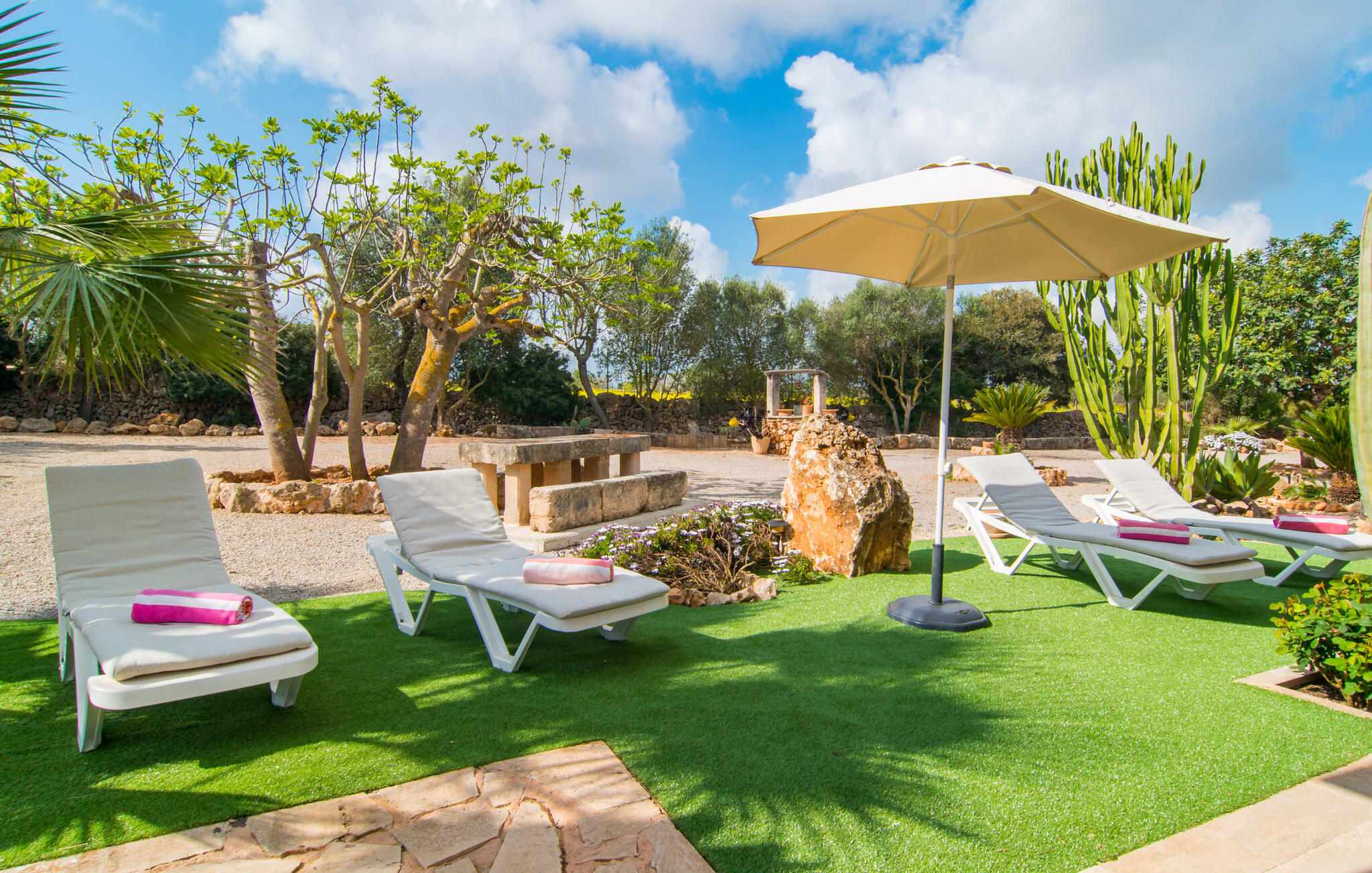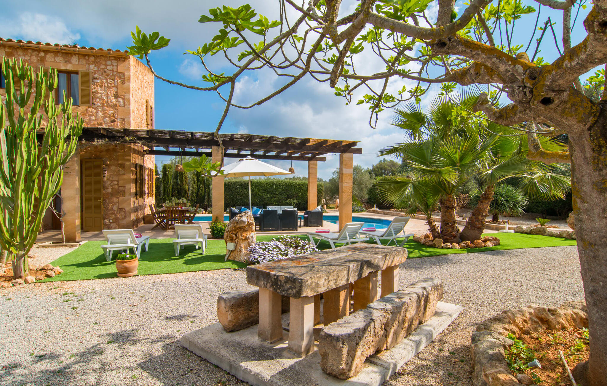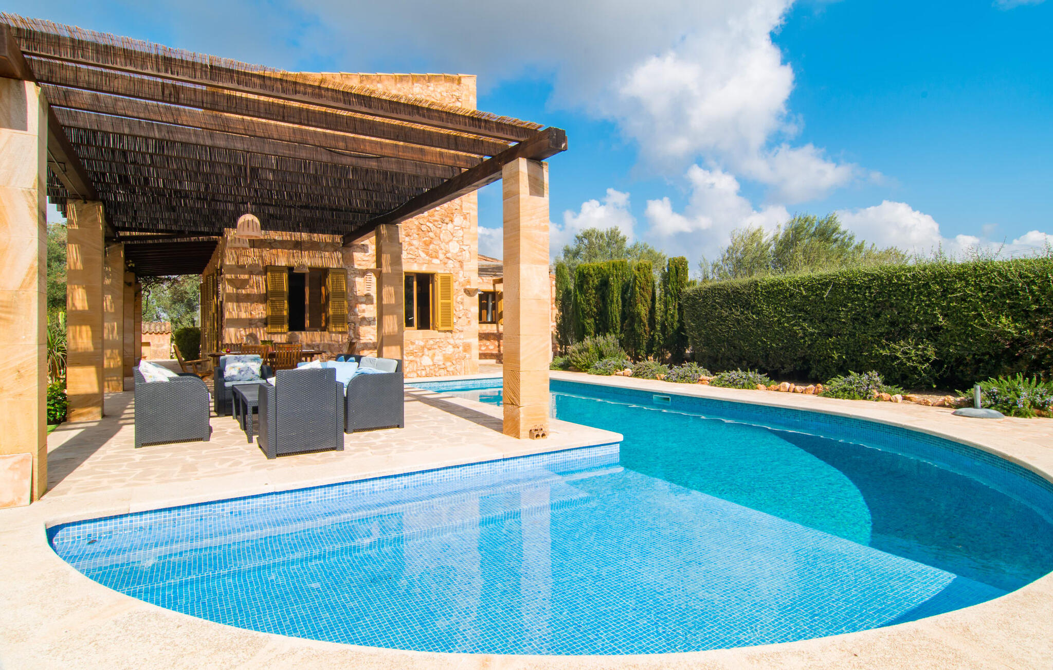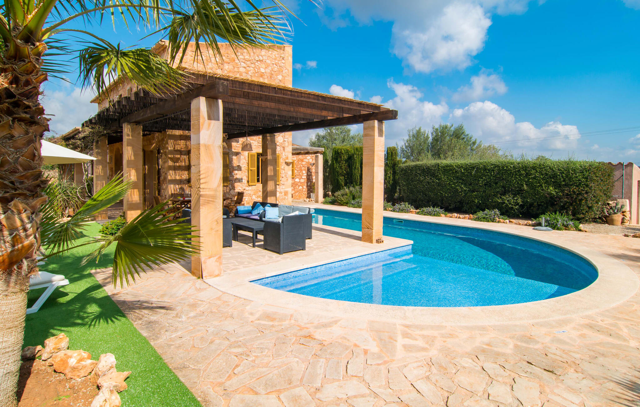 Je zou bijna geloven dat deze saffraankleurige mediterrane villawijk met zijn olijf-, vijgen- en johannesbroodbomen, palmbomen, cipressen en cactussen is ontstaan uit de vruchtbare grond van Campos zelf. Nieuw gebouwd in 2015, zo eerlijk, ongecompliceerd en zongerijpt als een goede wijn, een beetje sprankelend op sommige plekken en vol karakter, wekt zelfs de eerste smaak het verlangen naar meer. Een uniek halvemaanvormig zwembad rond het overdekte terras biedt al het water dat je nodig hebt voor je dagelijkse duik - een echte blikvanger! Hier kun je de dag gezellig afsluiten met een laat ontbijt, een tijdschrift of een glas wijn terwijl de kinderen veilig rondspetteren. Je zou bijna kunnen spreken van een vakantie in een zwembad in plaats van bij het zwembad en je zou in de verleiding kunnen komen om vanuit een van de ramen direct in het koele water te springen (maar doe dat alsjeblieft niet, het is roekeloos en je zult jezelf bezeren). )... maar Ca Na Carmen zorgt ervoor dat je je hoofd niet verliest.