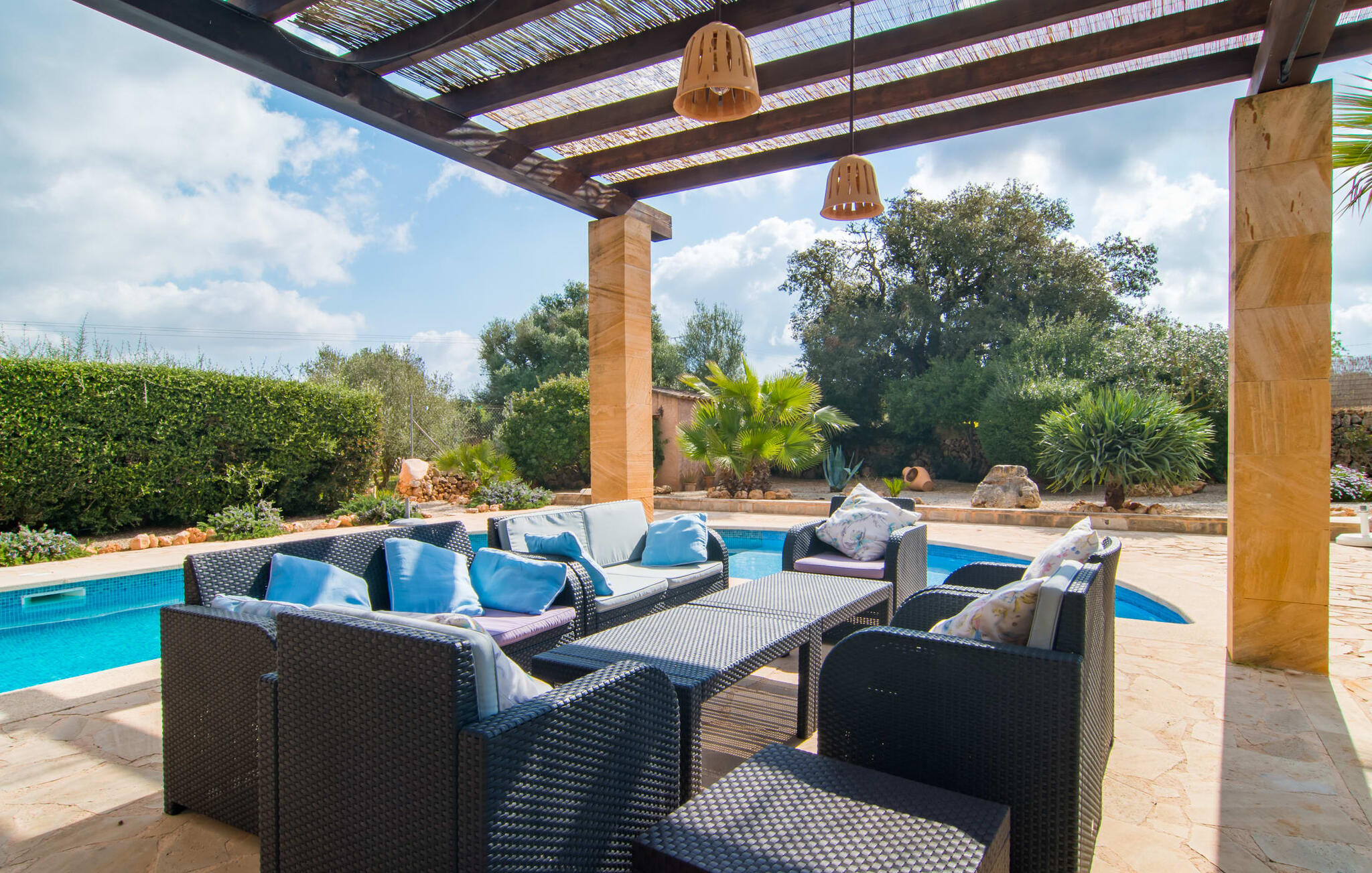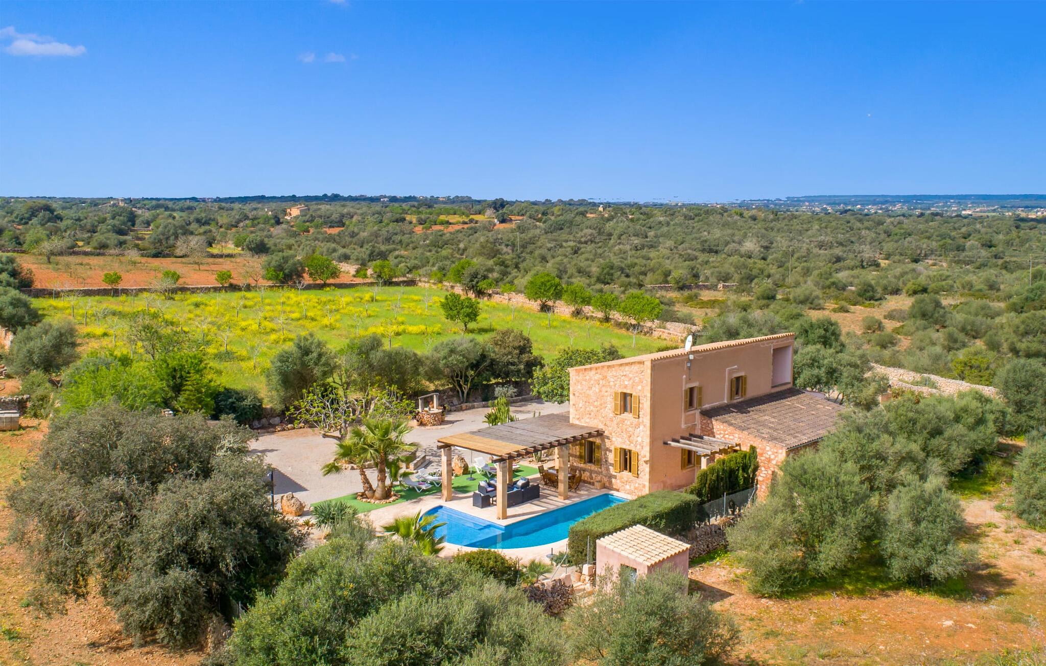 Op een volledig rustige, landelijke locatie en toch maar een paar kilometer langs de Ma-19 van het stadje Campos met winkelmogelijkheden en een supermarkt, wacht de Mediterrane Villa Ca Na Carmen op gasten die het zuiden van het eiland willen verkennen. Santanyi, Ses Salines en Colònia de Sant Jordi op het puntje van het eiland zijn nog niet overspoeld door toeristen en bieden prachtige natuurlijke zandstranden zoals Es Trenc of de kleine Cala Santanyi en indrukwekkende kustwandelingen.