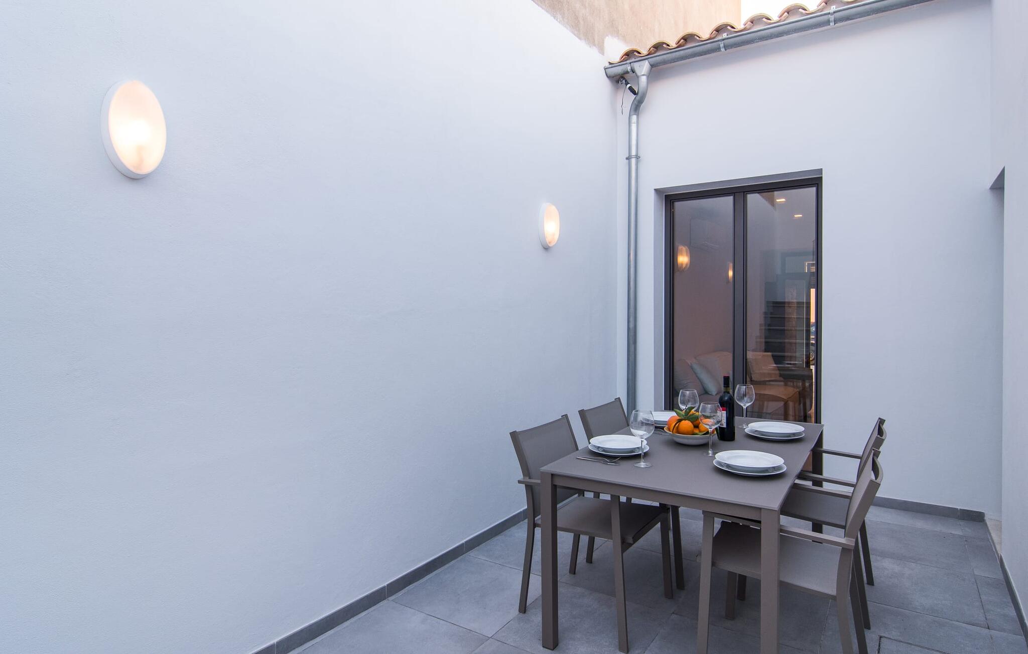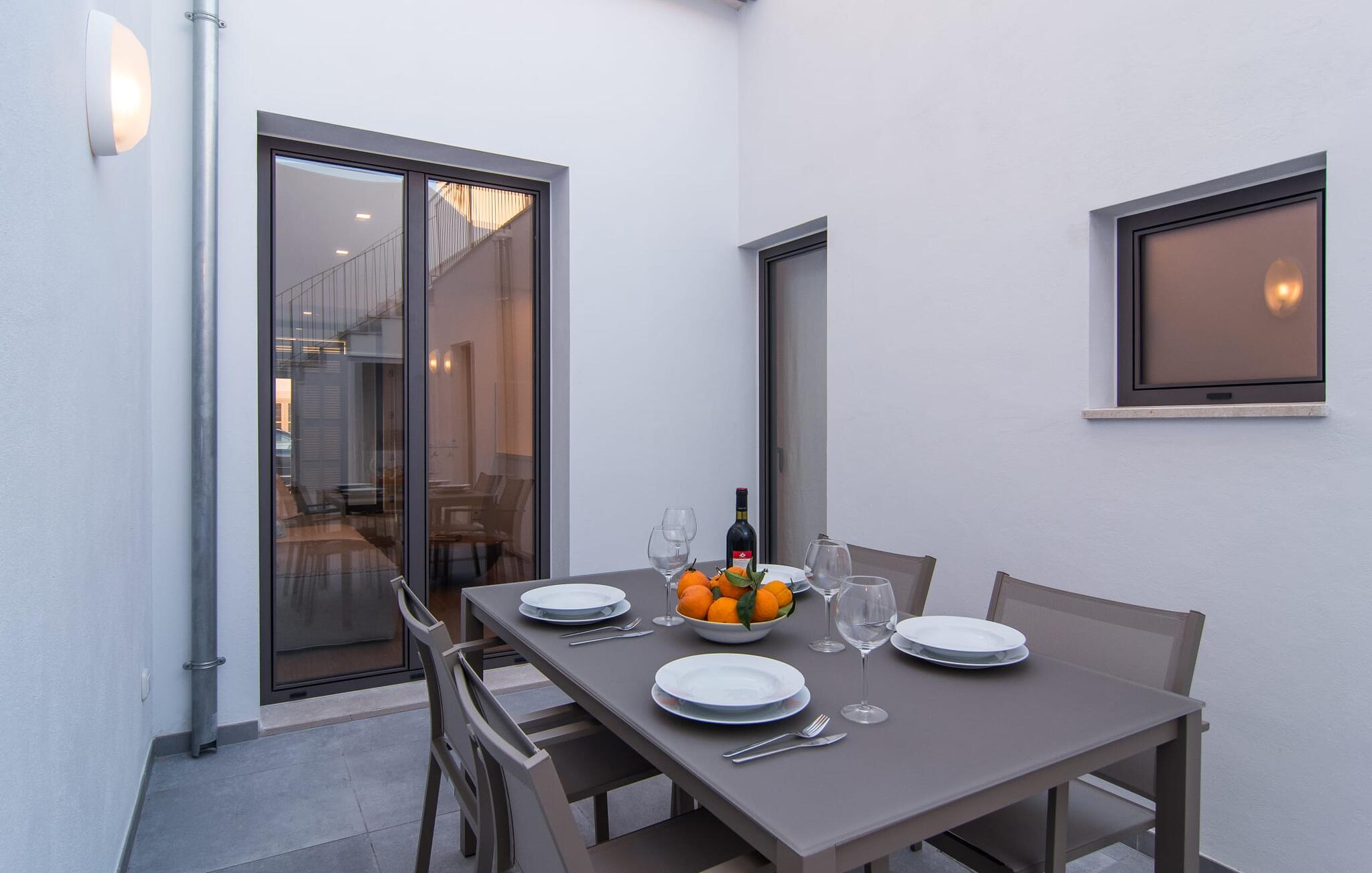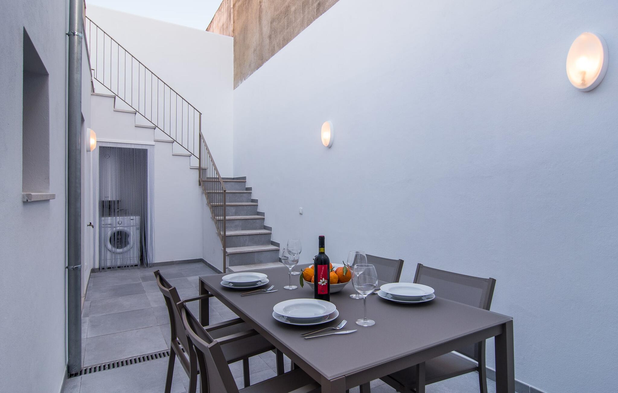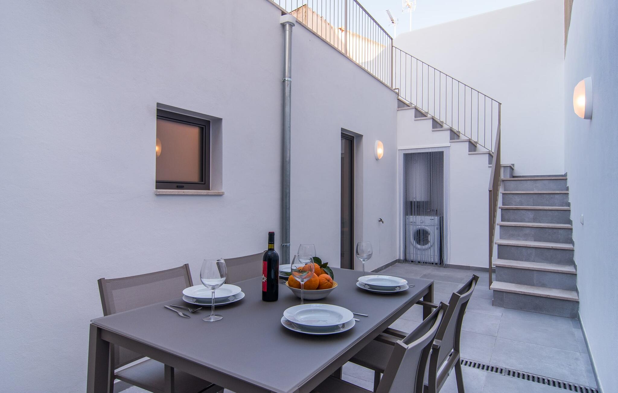 Dicht bij zee, op loopafstand van voorzieningen, een moderne sfeer, een eigen binnenplaats en een overdekt terras - wat wil je nog meer? Als je met z`n tweeën of drieën reist, eventueel met een baby of twee, dan heb je hier waarschijnlijk je ideale accommodatie al gevonden! Met een strategische ligging in een klein straatje, hemelsbreed slechts 200 meter van de zee, kun je `s ochtends in je casual loungewear genieten van je zelfgebrouwen koffie op de minimalistische binnenplaats, die volledig is afgezonderd en aangenaam koel van kleur is, of op het luchtige dakterras terwijl je begint met het plannen van de vakantie-uren die voor je liggen. Wat je ook besluit te doen, dankzij de slimme architectuur en indeling zijn de afstanden sowieso kort. Het lagere terras heeft echter de allure van een tafel en stoelen en nodigt je uit om in alle privacy en onder de open hemel van je maaltijden te genieten; er is zelfs een barbecue.