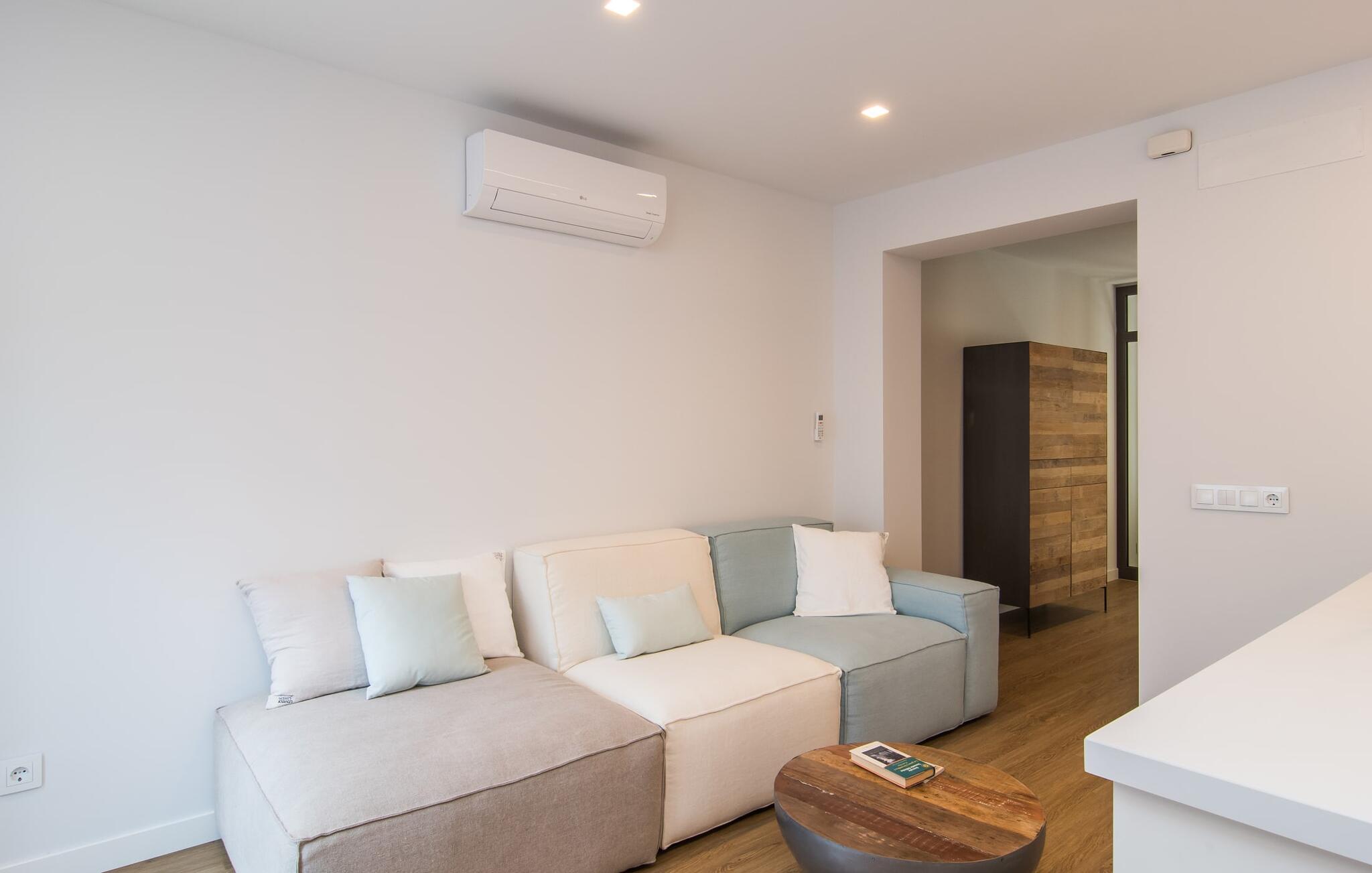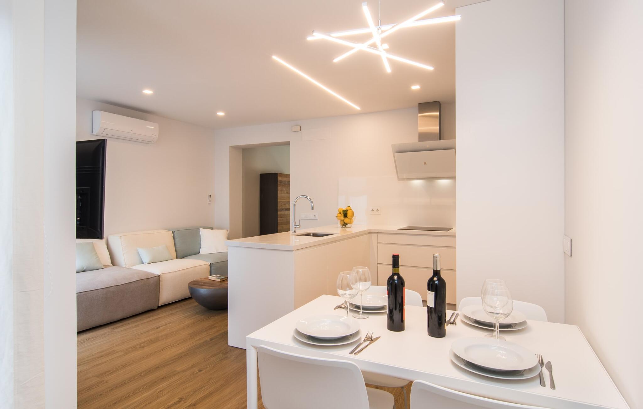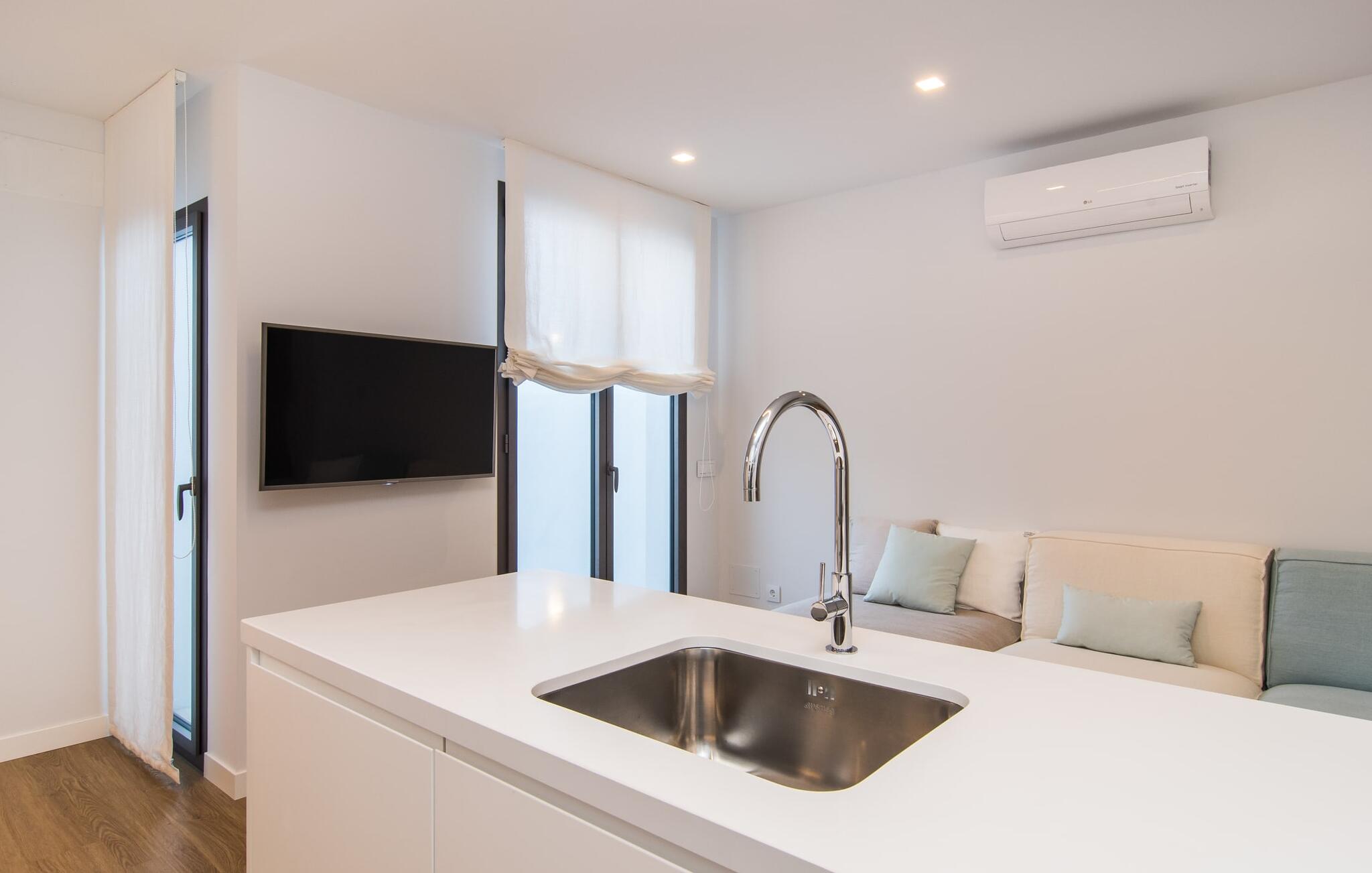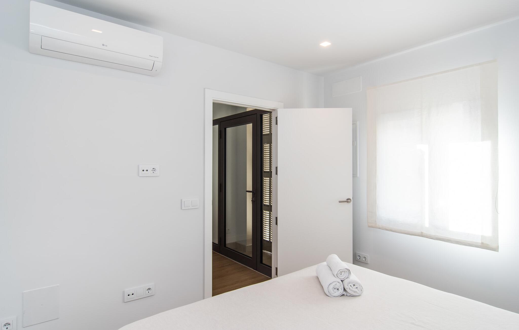 De inrichting is privé en trendy: Veel wit gecombineerd met houtkleuren biedt ruimte voor je persoonlijke vakantiekleuren. Je tijdelijke woonruimte van 70 m² is verdeeld over één niveau, zodat je geen last hebt van traplopen. Je kunt koken, eten en ontspannen in dezelfde ruimte, waar het raam van de patio van vloer tot plafond samen met de slimme verlichting en het witte interieur een lichte en uitnodigende sfeer creëren. Hier kun je ontspannen op de bank, aan tafel zitten en eten, spelen of schrijven of een paar lekkernijen bereiden in de moderne keuken. Dankzij de airconditioning heb je altijd de perfecte binnentemperatuur, zelfs op warme zomerdagen. Dit geldt ook voor de twee stijlvolle slaapkamers, waarvan de ene een tweepersoonsbed heeft van 1,80 x 2 meter en de andere een eenpersoonsbed van 0,90 x 2 meter. Natuurlijk is er ook een zeer moderne badkamer met douche, passend bij de stijl van de rest van het huis.