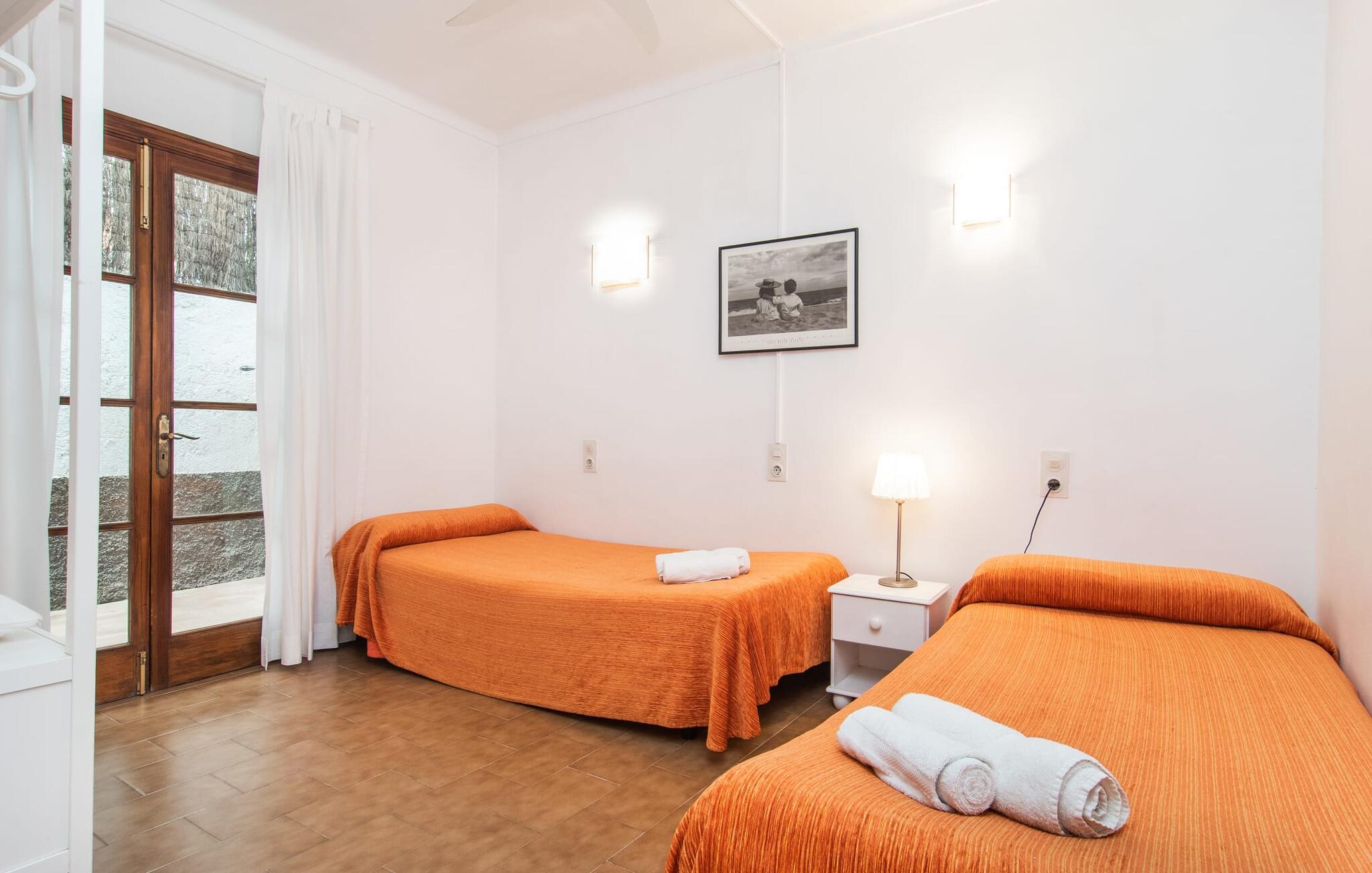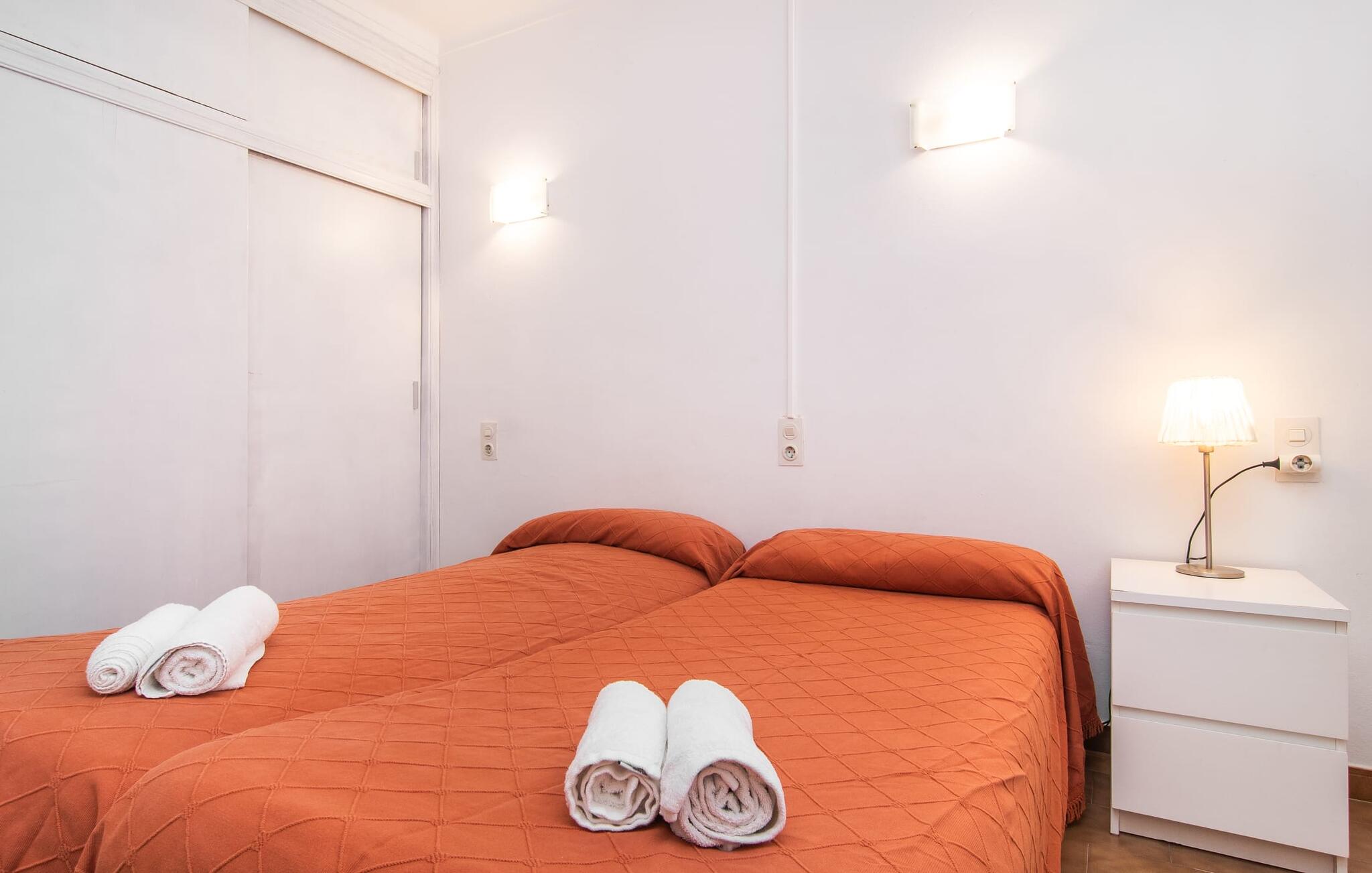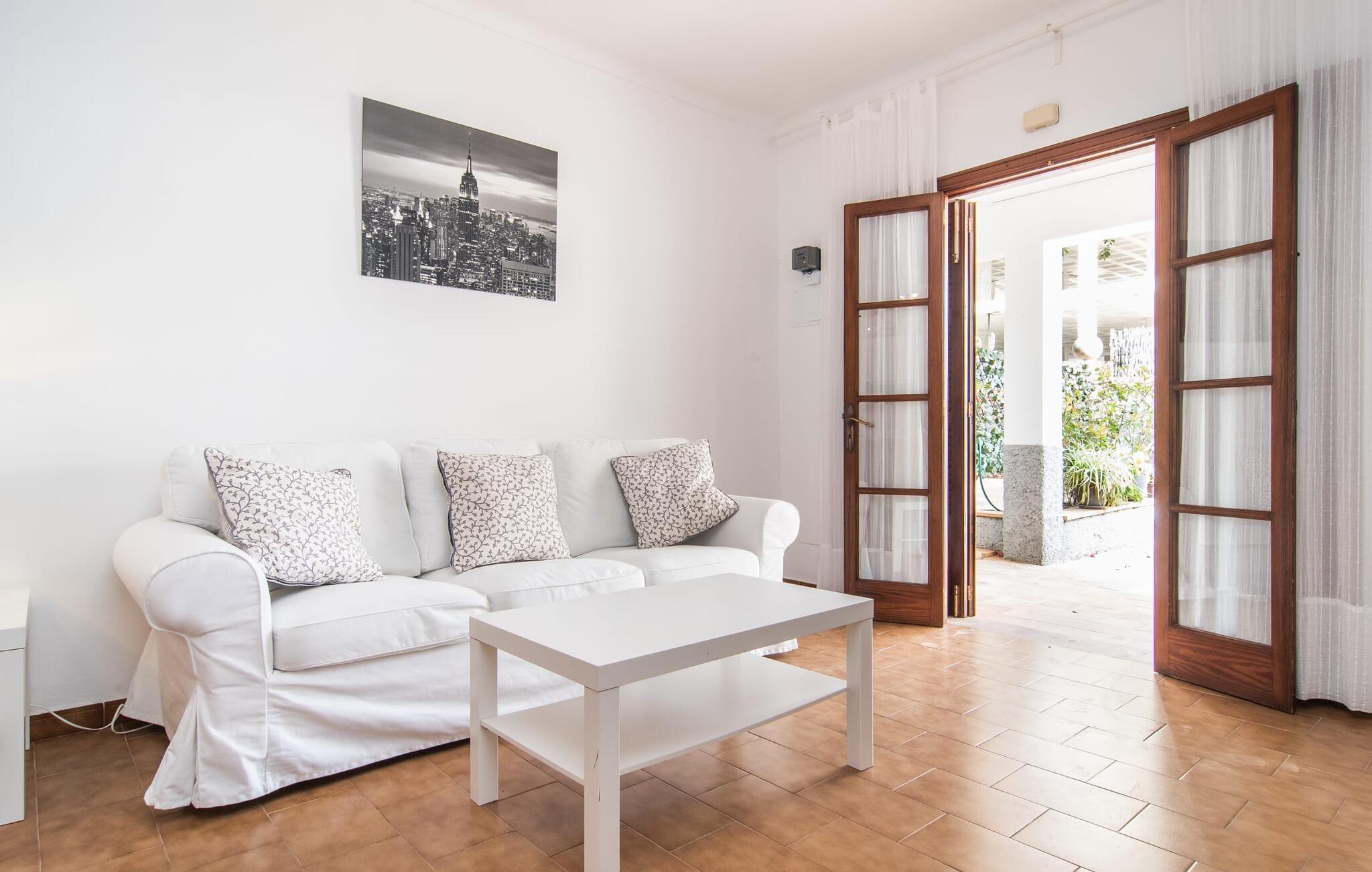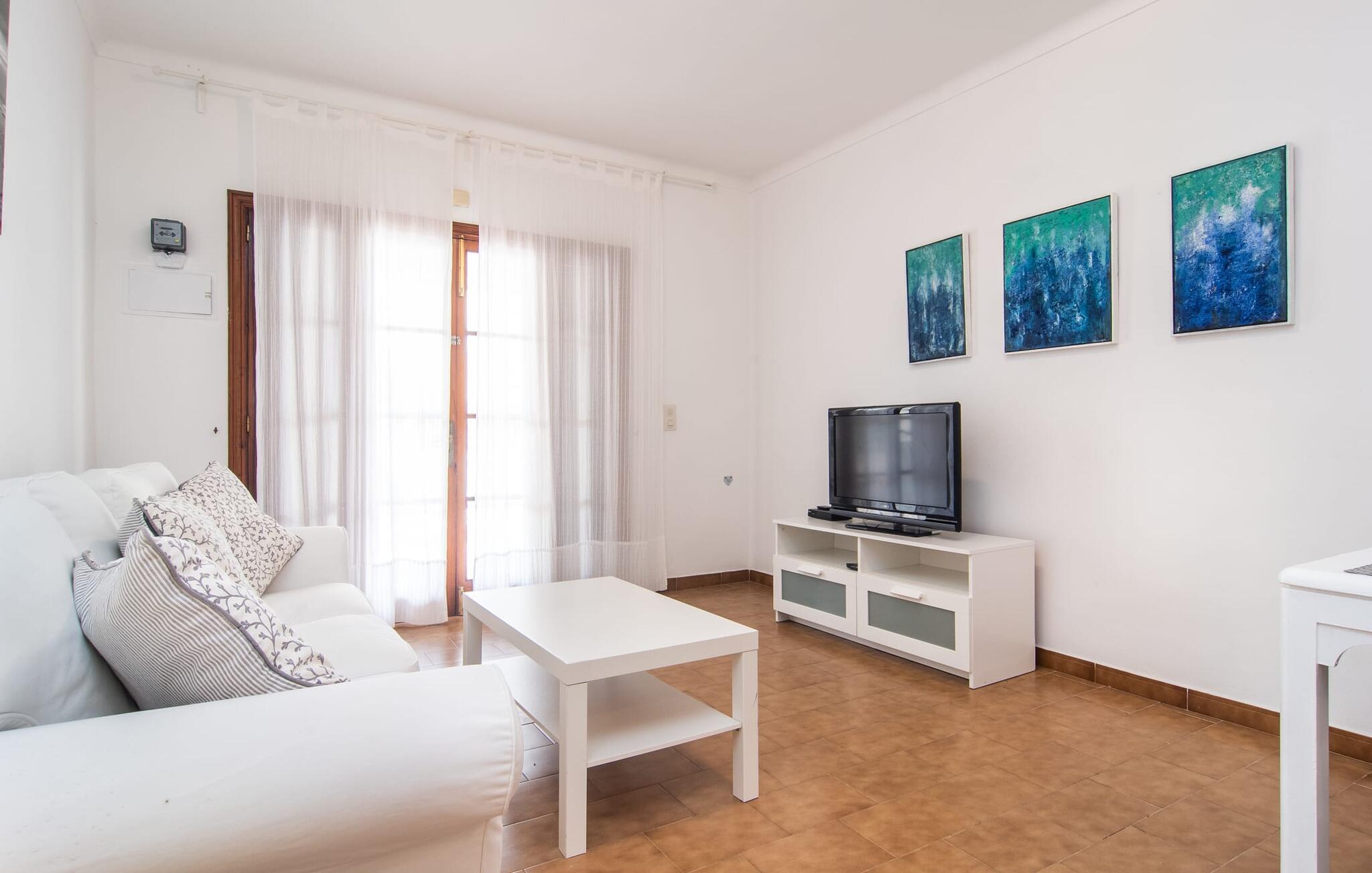 Een raam van vloer tot plafond vormt de overgang tussen buiten en binnen en leidt naar de betegelde open ruimte waar wonen, eten en koken zijn ondergebracht. Een bank en televisie zijn hier net zo vanzelfsprekend als een eettafel voor de maaltijden binnenshuis. Natuurlijk is er ook supersnel draadloos internet beschikbaar. Lichtgekleurde muren en meubels in combinatie met decoratieve muurschilderingen zorgen voor een vriendelijke sfeer. De praktische, volledig uitgeruste keuken is perfect om zelf te koken tijdens je vakantie op Mallorca. Je kunt heerlijk slapen in de twee gezellige slaapkamers, elk uitgerust met een plafondventilator. Een badkamer met douche rondt het wooncomfort af in deze vakantiewoning op ons favoriete eiland. Het vakantiehuis Casa Ángela II Terraza ligt op een stedelijke locatie aan de rand van de wijk Es Pelats. De woonwijk biedt winkel- en eetgelegenheden op loopafstand. De mooie promenade en het havengebied met cafés nodigen uit tot een avondwandeling. Mooie zandbaaien zoals Cala Agulla of Cala Gat bereik je in een paar minuten met de huurauto. Cala Rajada biedt ook aantrekkelijke activiteiten zoals paardrijden of boottochten.