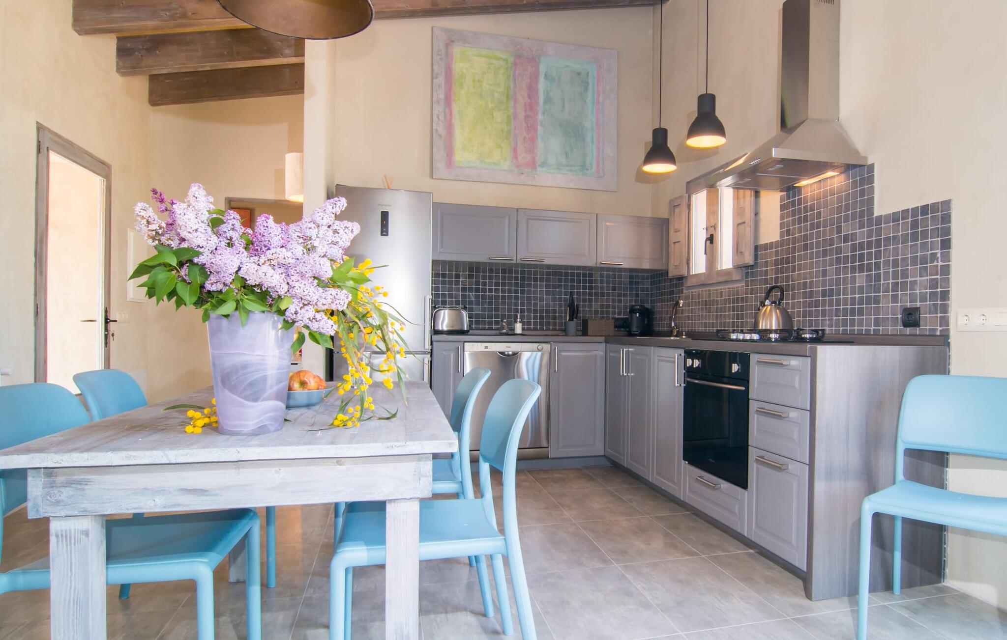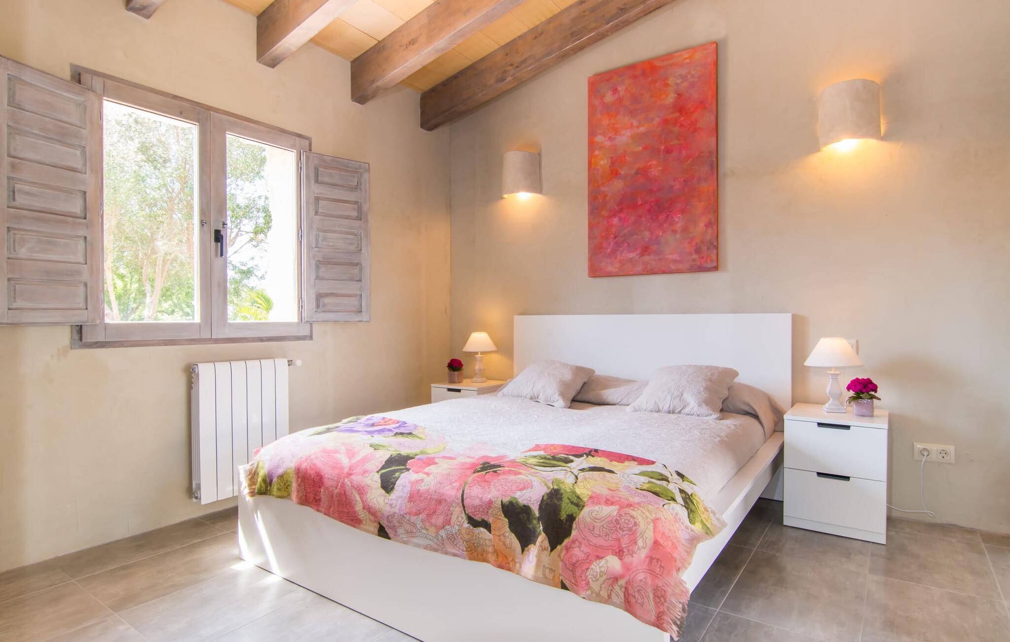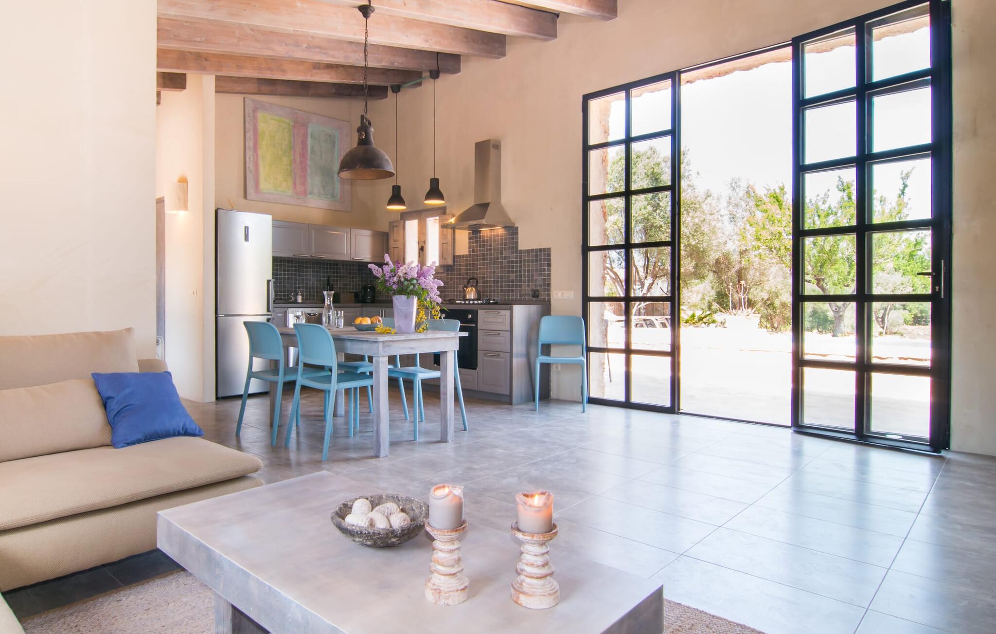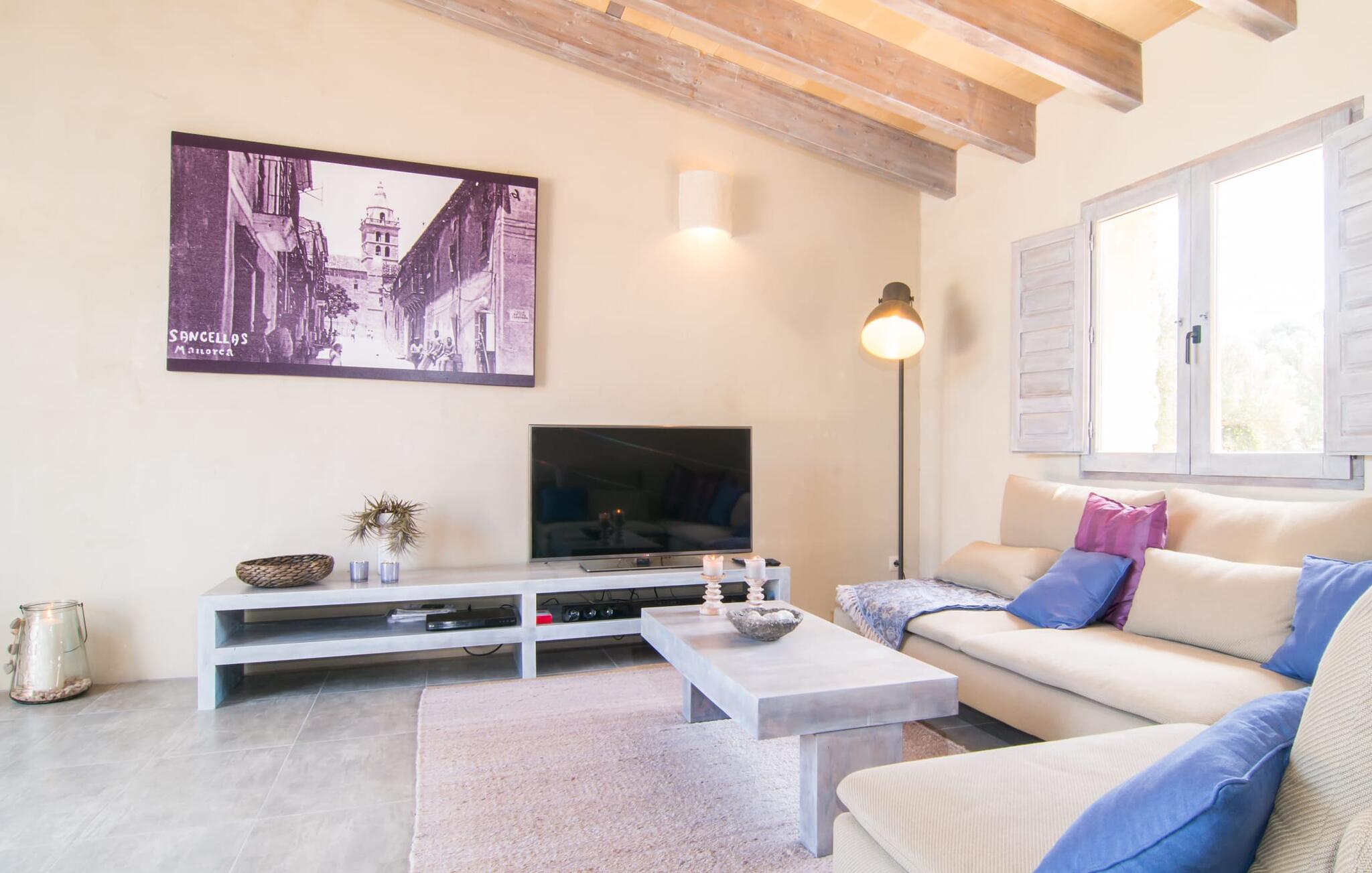De moderne natuurstenen villa ligt op een prachtige landelijke locatie in het midden van het eiland tussen Costitx en Sencelles. Rijd op minder dan 4 km naar de markt in Costitx op zaterdag om boodschappen en andere benodigdheden te kopen in een traditioneel klein stadje in het centrum van de Plà de Mallorca. Palma is ook gemakkelijk te bereiken met de auto, net als het spectaculaire strand van Es Trenc en verschillende andere ongerepte zandstranden.
