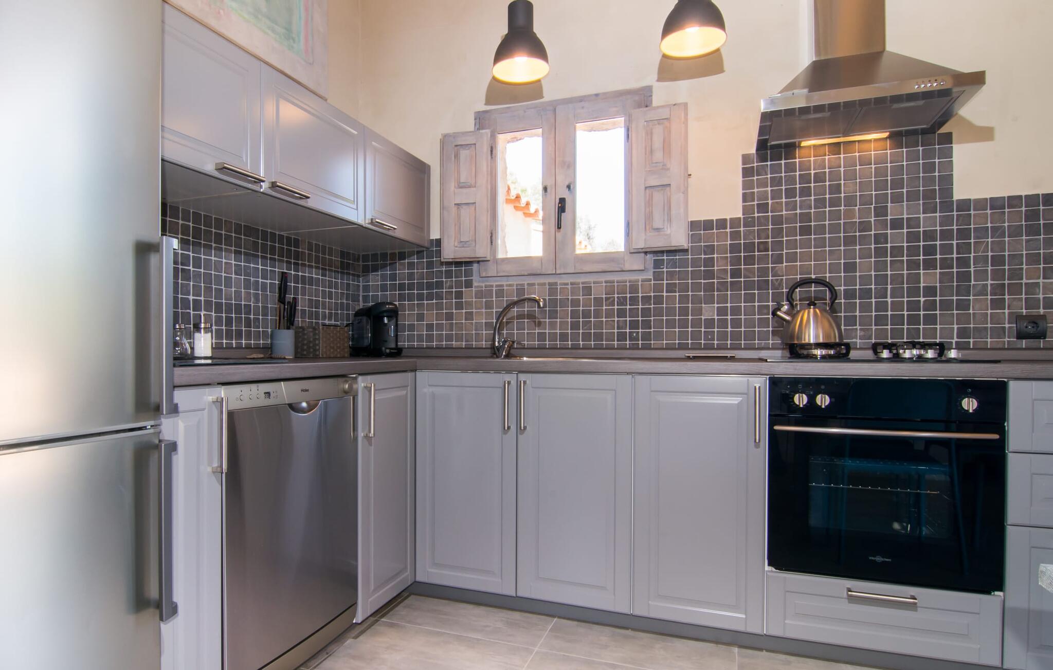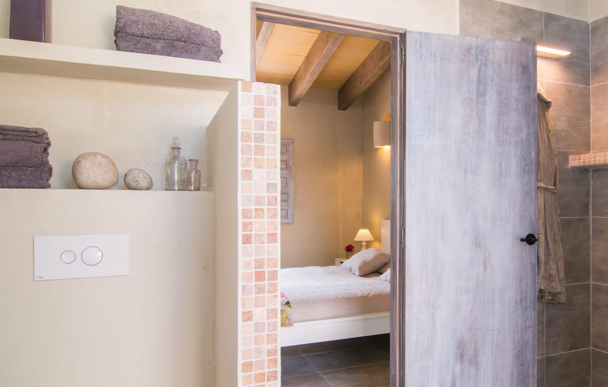 Binnen biedt de open woonkamer een mix van moderne stijl en gezellig comfort. Een comfortabele lounge met een lcd-tv en een open haard, een eethoek met een vintage tafel en moderne stoelen en een volledig uitgeruste keuken zorgen voor een ontspannen verblijf. De ruime slaapkamer heeft een tweepersoonsbed van 1,60 meter breed en 2 meter lang, een grote kledingkast en een eigen badkamer met inloopdouche. Een afgelegen binnenplaats met directe toegang tot het zwembad draagt bij aan de charme van de villa. "Cascada" is ideaal voor volwassenen en biedt het hele jaar door een rustig toevluchtsoord. Er zijn nog vier andere accommodaties op het terrein, die allemaal te boeken zijn via onze website.