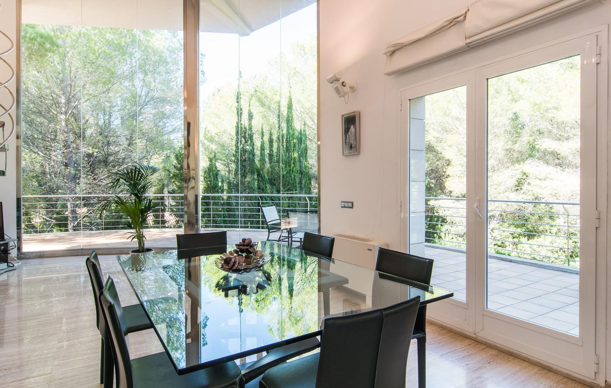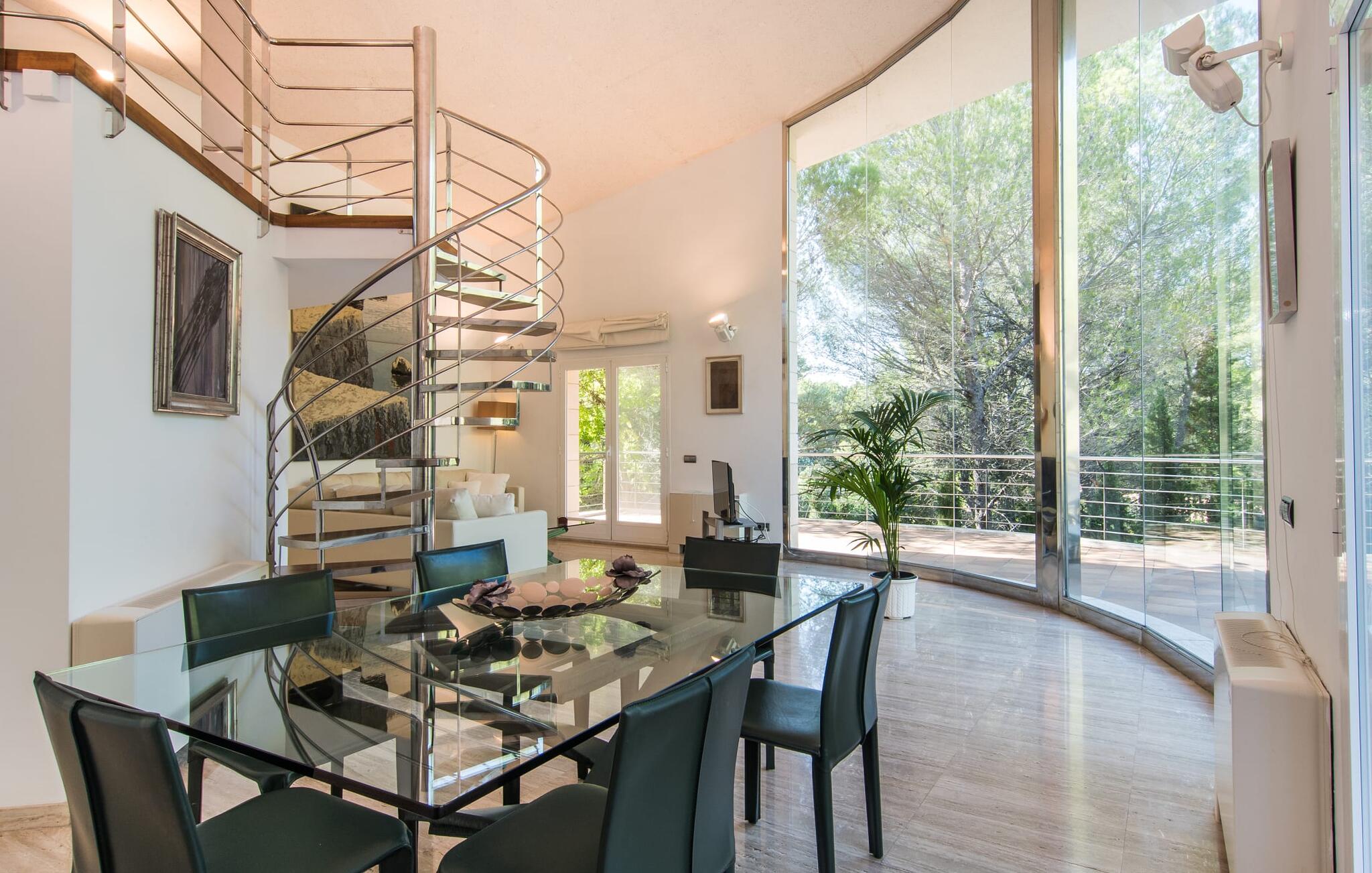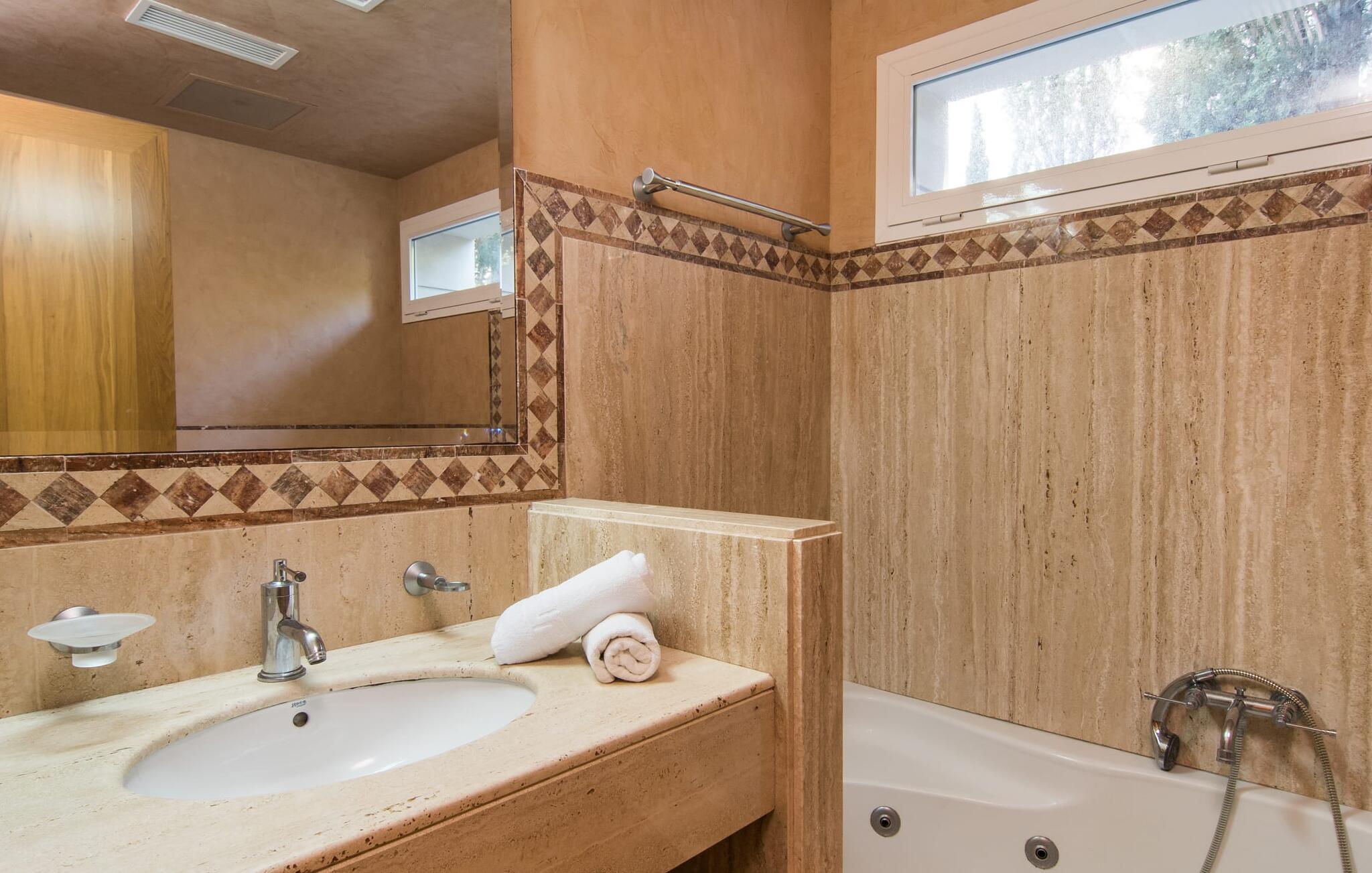 Binnen blijft de villa indruk maken. De ruime keuken met zijn elegante, walnootkleurige aanrecht is perfect voor het bereiden van maaltijden met de hoogwaardige apparatuur. Geniet van je creaties aan de eettafel naast een groot panoramisch raam met uitzicht op het groen. De wenteltrap leidt naar een gezellig balkon en een extra keuken en badkamer op de bovenverdieping. De vier slaapkamers op de begane grond zijn drie tweepersoonsslaapkamers, waarvan een met een eigen badkamer, en een slaapkamer met twee aparte bedden. Met drie badkamers, waarvan twee met bad, biedt villa "Cododrilo" de perfecte mix van comfort en charme voor een ontspannen vakantie.