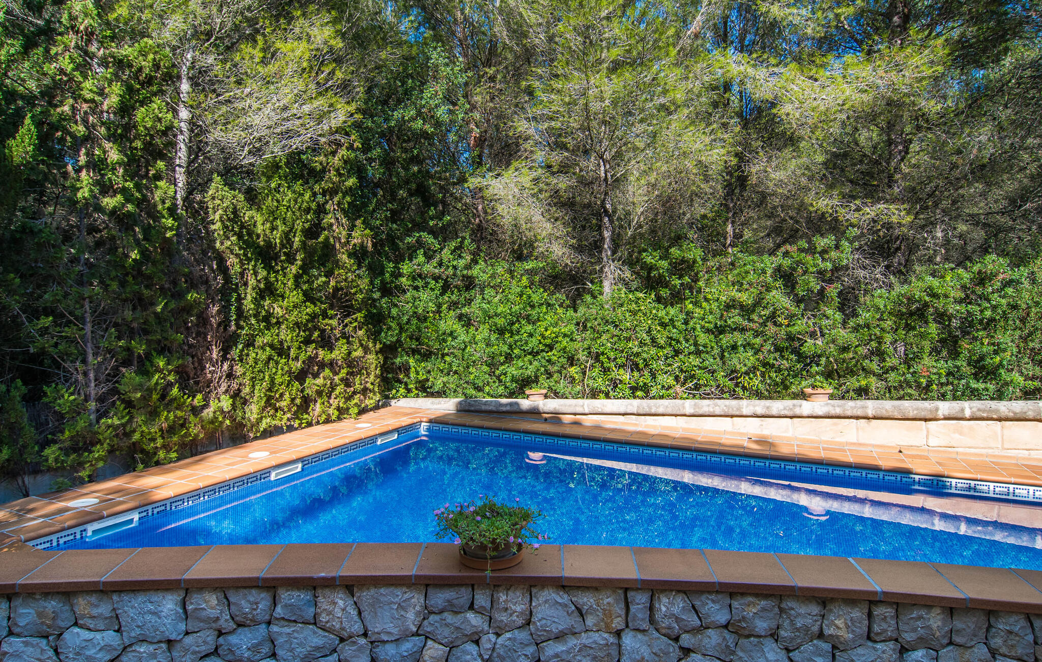 Het zwembad heeft comfortabele ligstoelen waar je kunt genieten van de mediterrane zon, terwijl de terracotta tegels en blauwe zwembadaccenten een uitnodigende sfeer creëren. Geniet van je maaltijden op het verhoogde terras, vul je vitamine D aan of trakteer jezelf op een diner bij kaarslicht na het barbecueën op de grill.