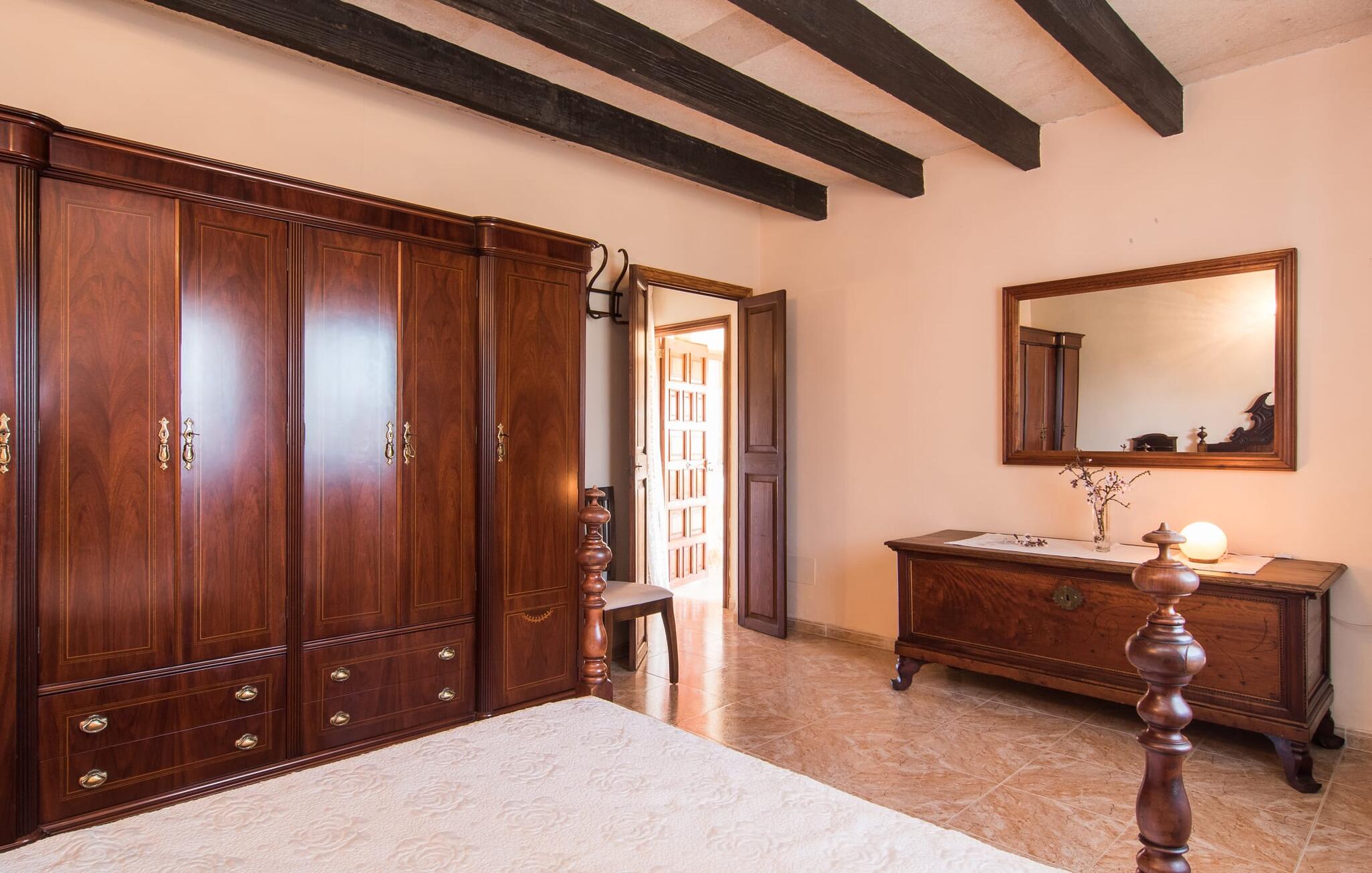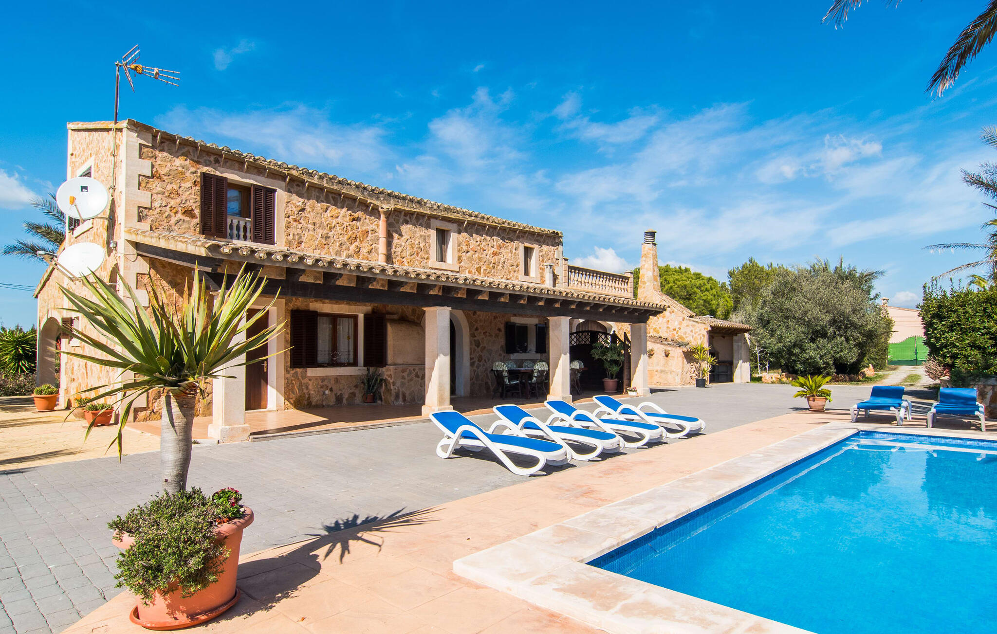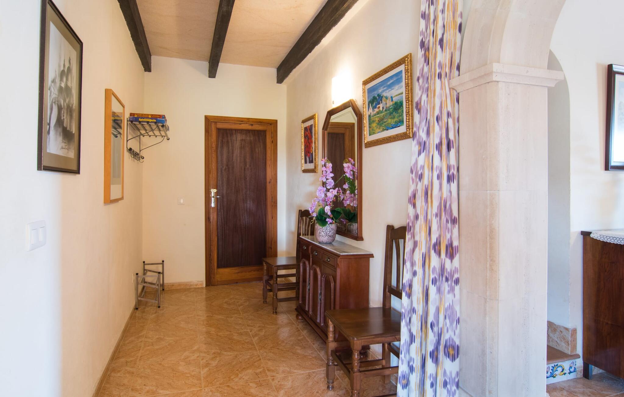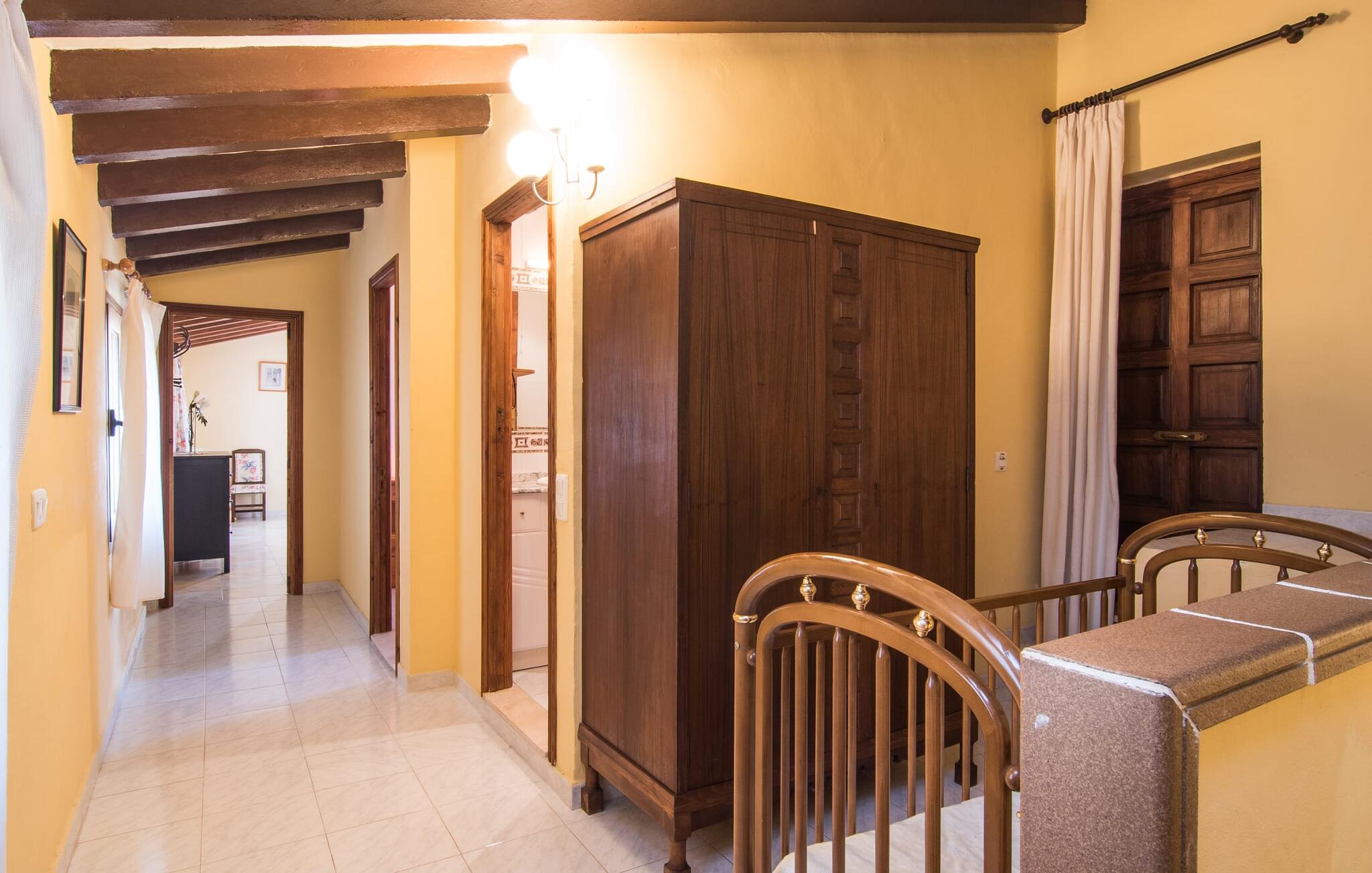Als je kiest voor Villa Es Revolt de Sa Barrala, kun je een allround, down-to-earth huis verwachten met een zeer goed onderhouden, aantrekkelijke buitenruimte. Het zwembad naast de palmboom, dat tropische flair uitstraalt, is met 6 x 4 meter groot genoeg om een paar baantjes te trekken. Er ligt zelfs een voetbalveld vlak naast, dat niet alleen populair zal zijn bij de jongste reizigers. Het tuinontwerp maakt indruk met veel variatie - mediterrane bomen, struiken en gazons vormen een harmonieus geheel dat volop ontspanning biedt. De luchtfoto`s van de villa laten zien hoe groen de omgeving is. Dit gaat gepaard met veel privacy, waarvan je kunt genieten bij sfeervolle barbecues. De zijuitbouw is hier perfect voor, met een stevige gemetselde barbecue die volop ruimte biedt voor je lekkernijen. Die kun je vervolgens nuttigen op bijvoorbeeld het overdekte terras, waar een rustieke houten tafel uitnodigt om plaats te nemen. Het dakterras is bijzonder zonovergoten. Je kunt het bereiken vanaf de eerste verdieping. Er zijn ook ligstoelen bij het zwembad, zodat je kunt zonnebaden na je dagelijkse zwempartij.