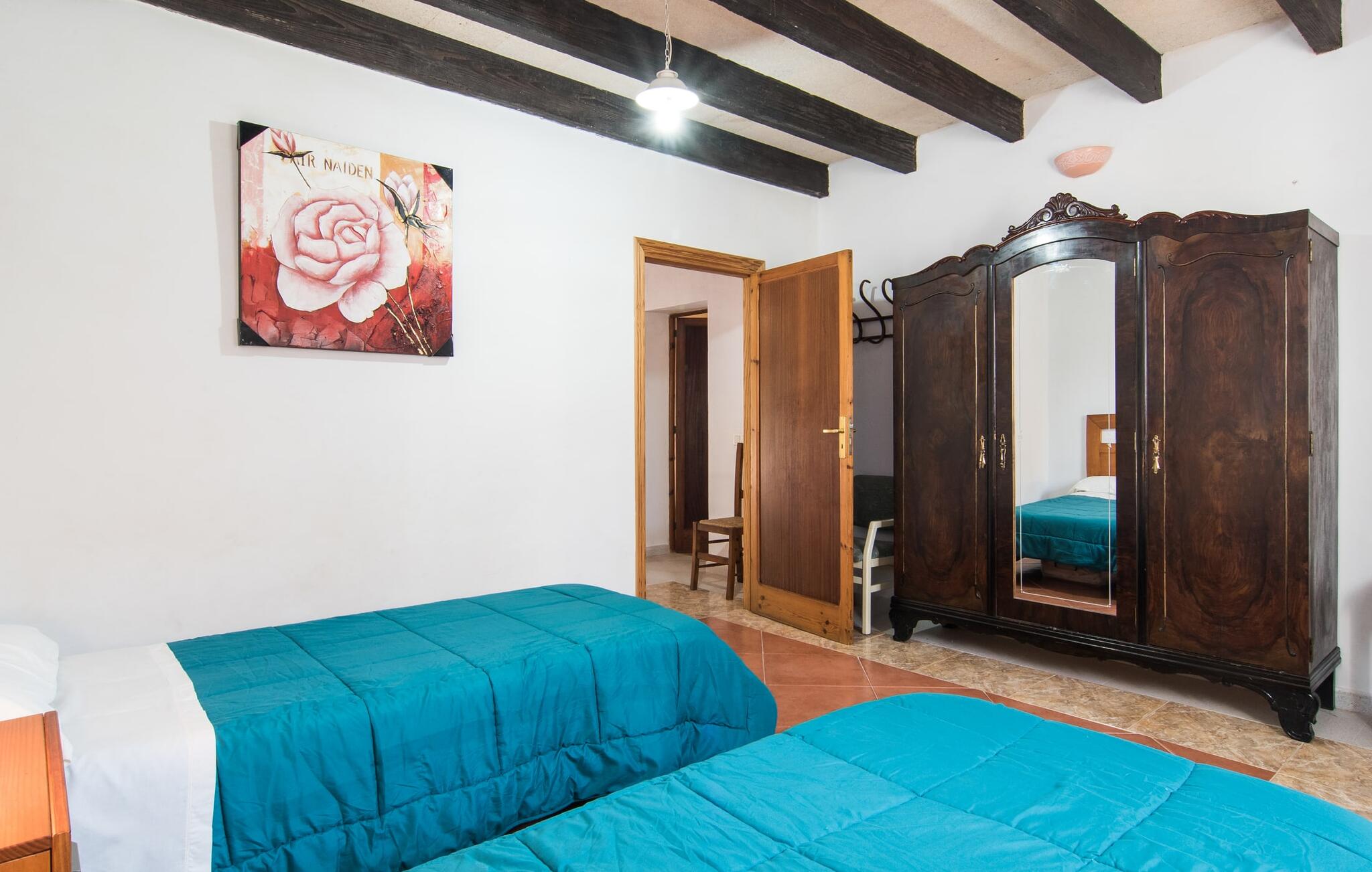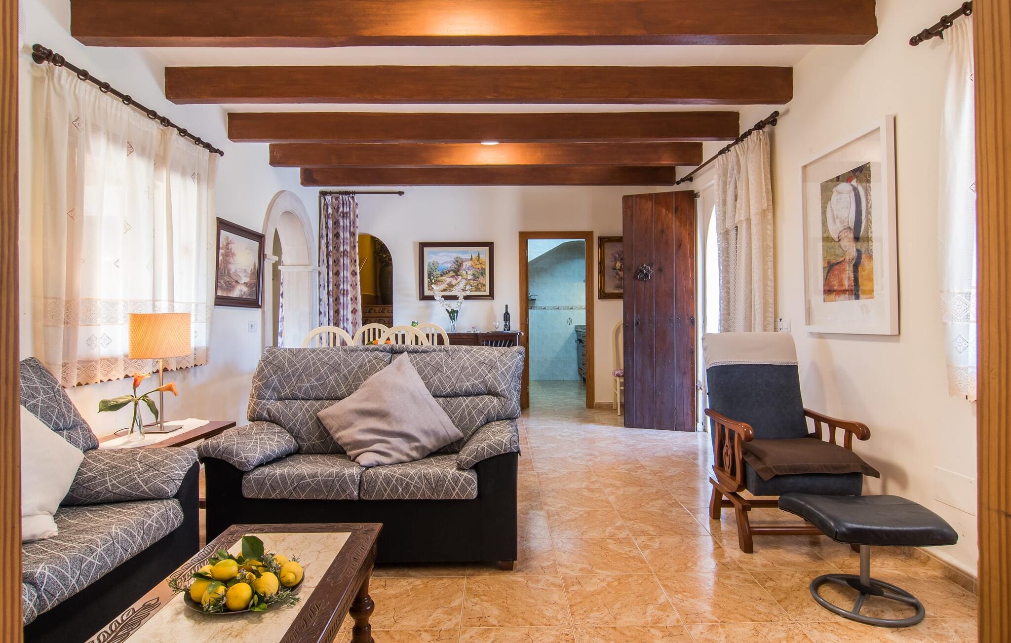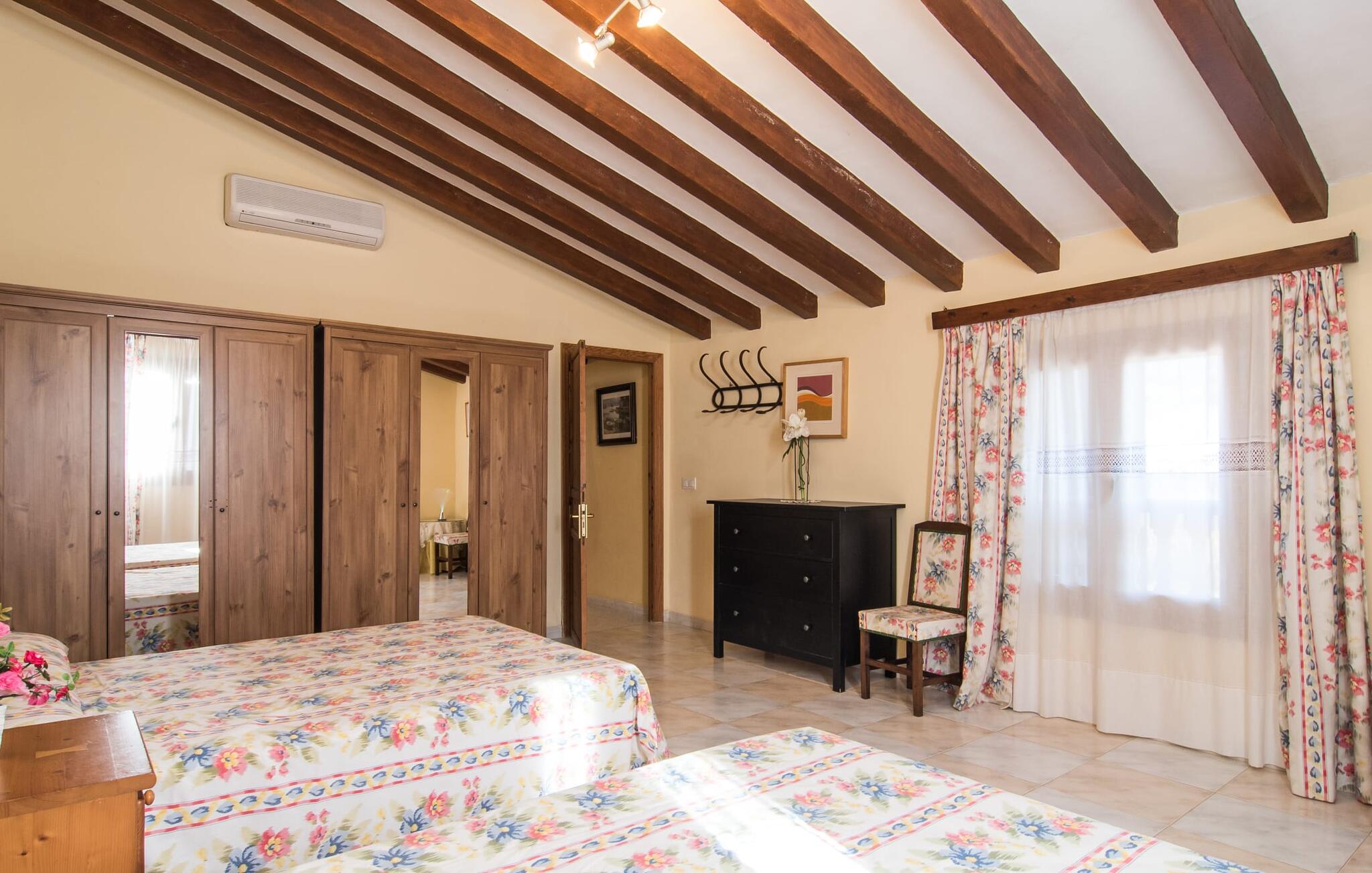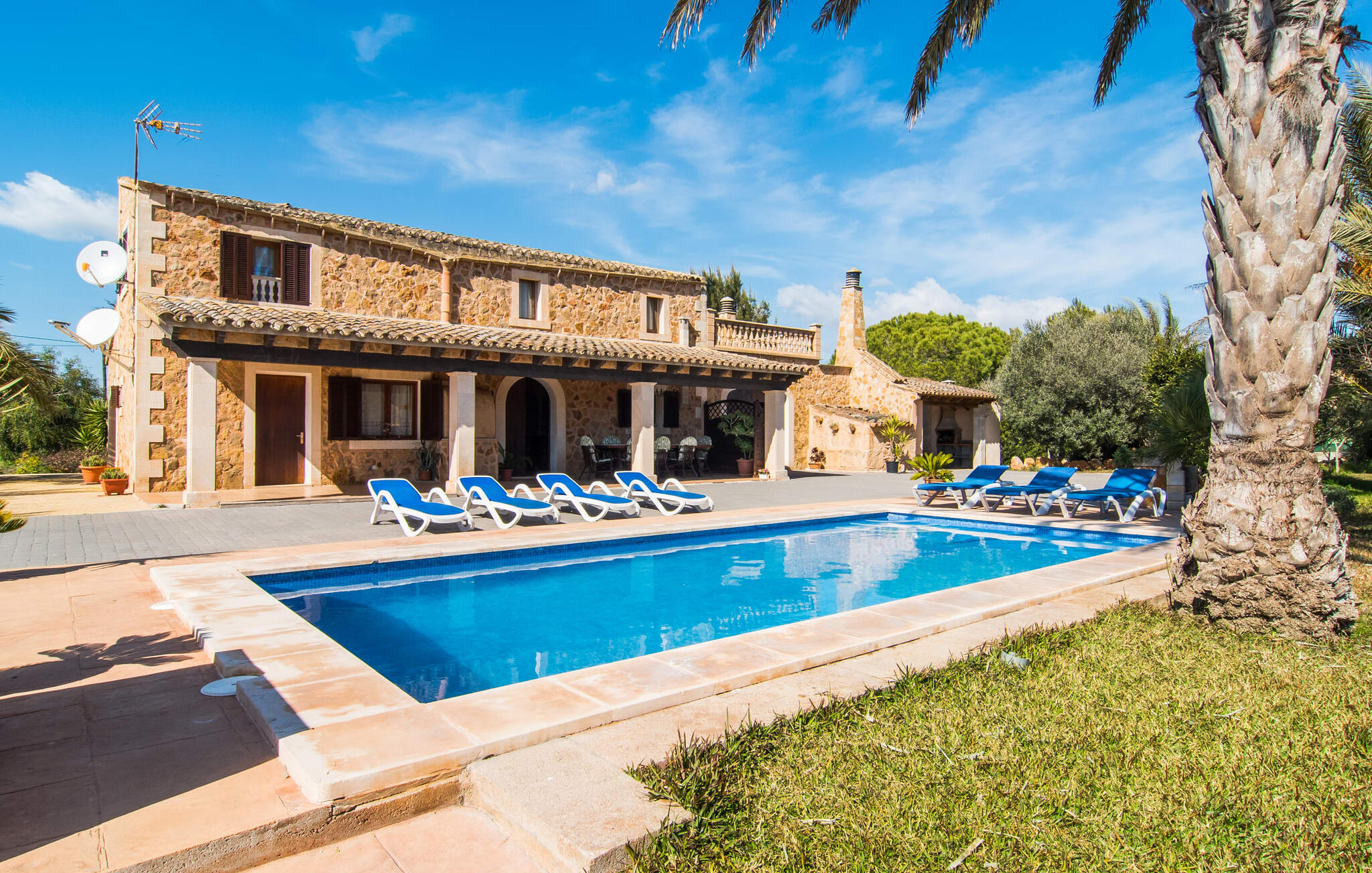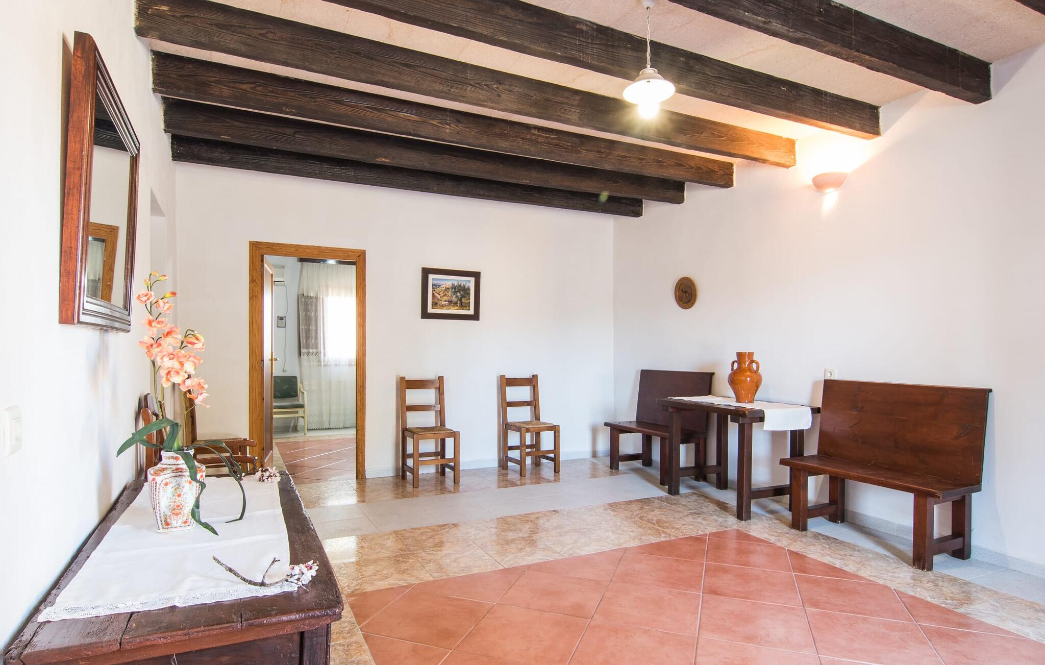 Als je kiest voor Villa Es Revolt de Sa Barrala, kun je een allround, down-to-earth huis verwachten met een zeer goed onderhouden, aantrekkelijke buitenruimte. Het zwembad naast de palmboom, dat tropische flair uitstraalt, is met 6 x 4 meter groot genoeg om een paar baantjes te trekken. Er ligt zelfs een voetbalveld vlak naast, dat niet alleen populair zal zijn bij de jongste reizigers. Het tuinontwerp maakt indruk met veel variatie - mediterrane bomen, struiken en gazons vormen een harmonieus geheel dat volop ontspanning biedt. De luchtfoto`s van de villa laten zien hoe groen de omgeving is. Dit gaat gepaard met veel privacy, waarvan je kunt genieten bij sfeervolle barbecues. De zijuitbouw is hier perfect voor, met een stevige gemetselde barbecue die volop ruimte biedt voor je lekkernijen. Die kun je vervolgens nuttigen op bijvoorbeeld het overdekte terras, waar een rustieke houten tafel uitnodigt om plaats te nemen. Het dakterras is bijzonder zonovergoten. Je kunt het bereiken vanaf de eerste verdieping. Er zijn ook ligstoelen bij het zwembad, zodat je kunt zonnebaden na je dagelijkse zwempartij.