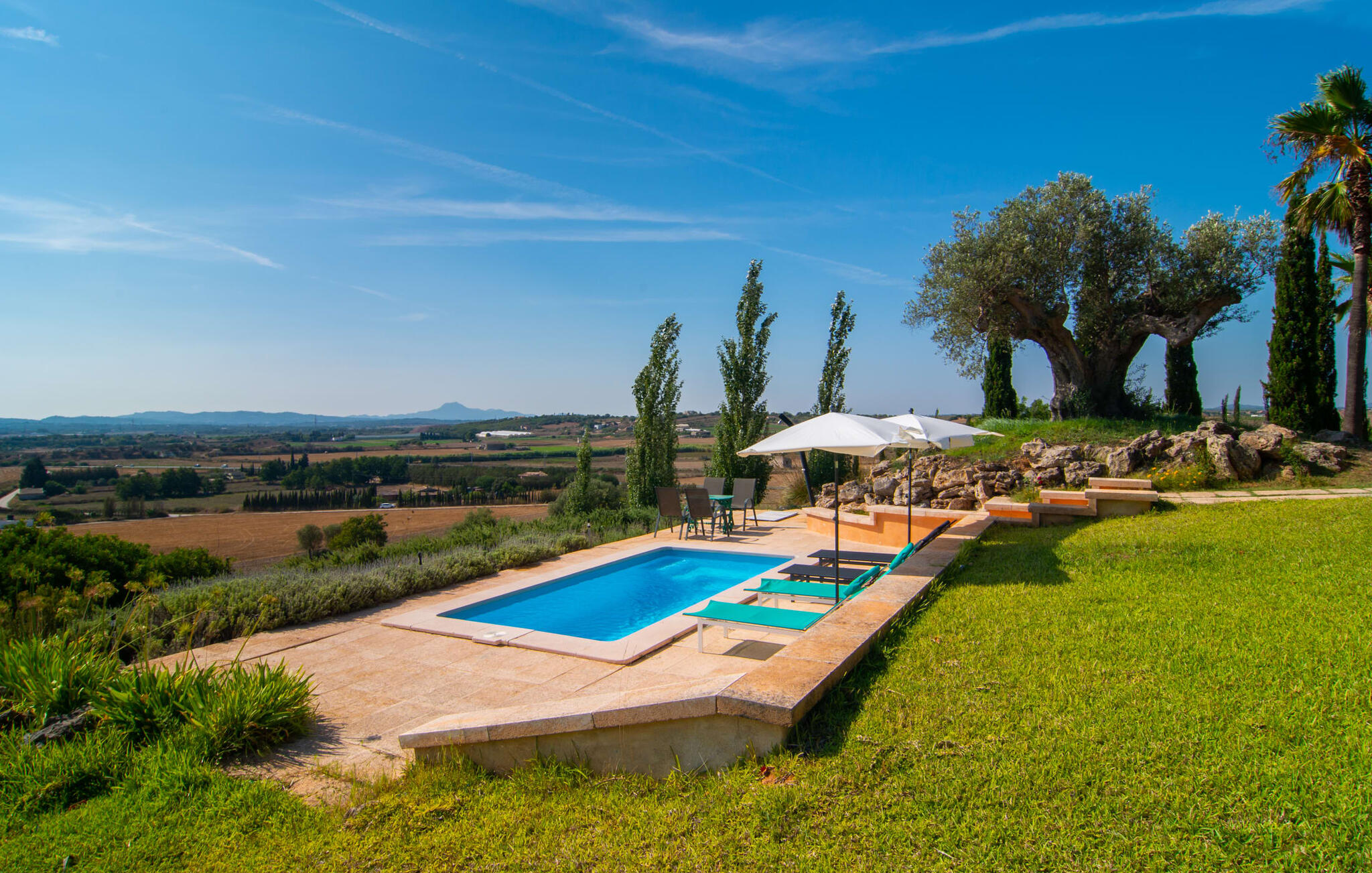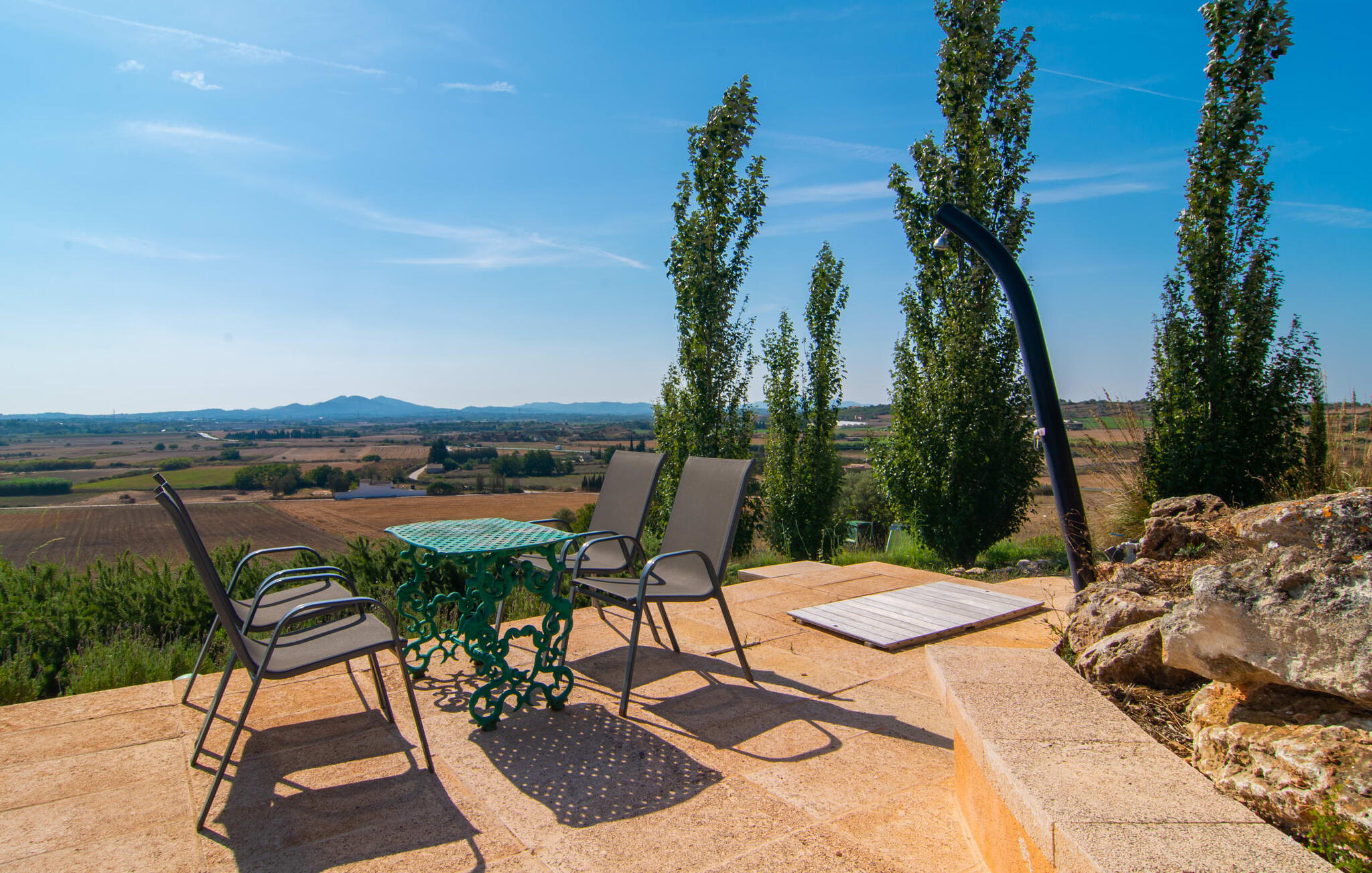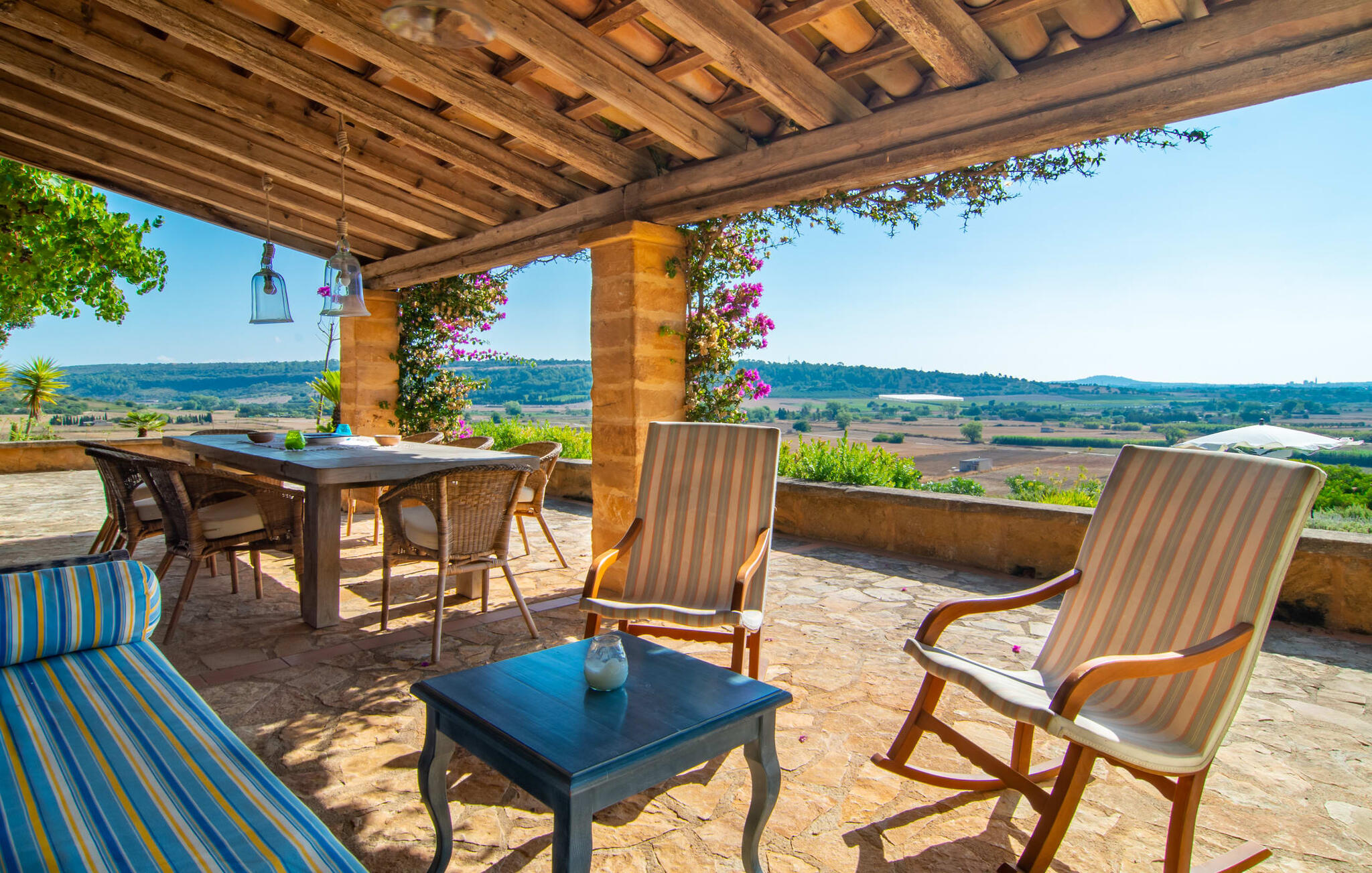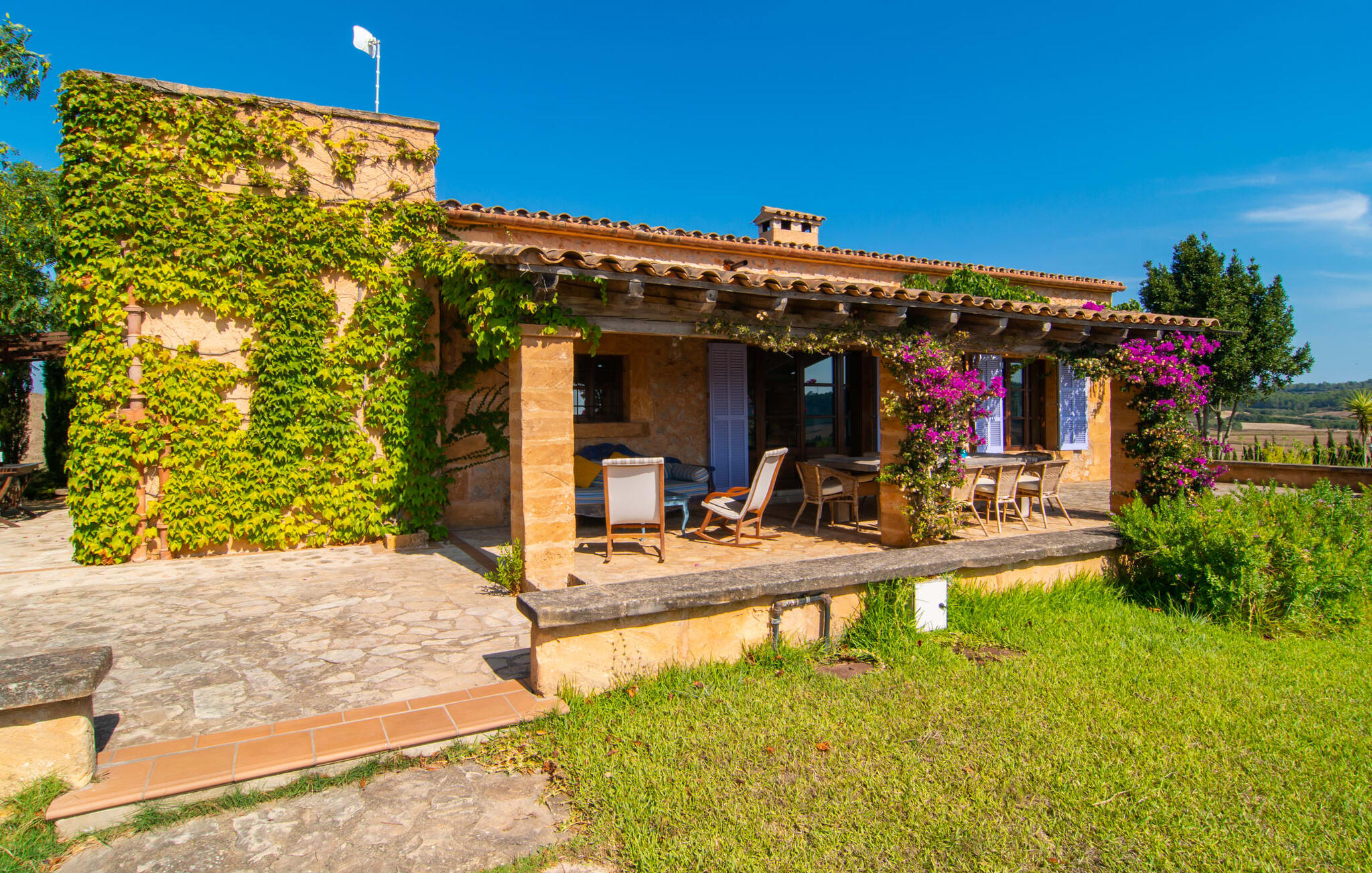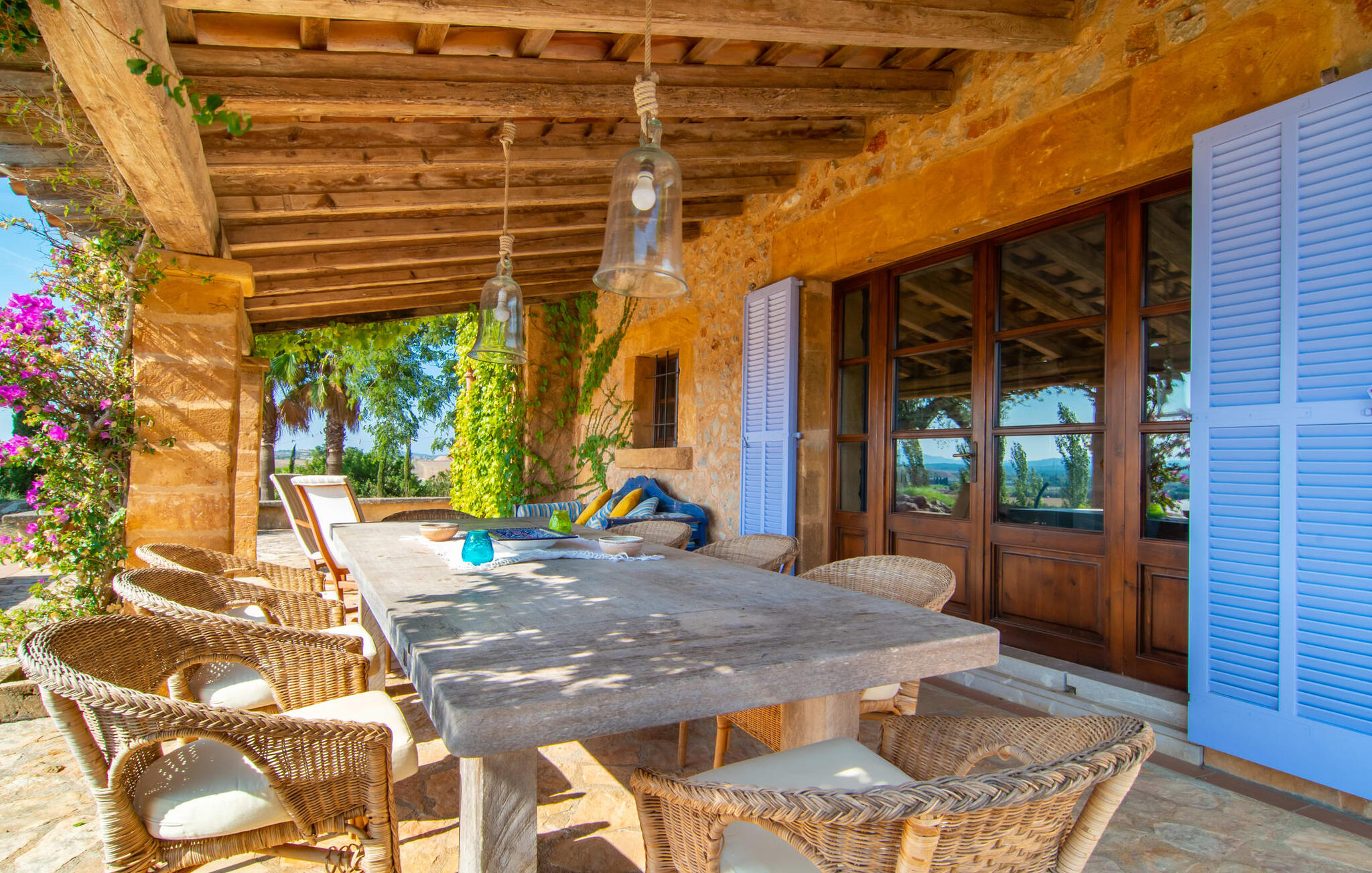 Es Turó ligt iets verhoogd en kijkt uit over de glooiende heuvels van het prachtige landschap in het midden van het eiland. Een paar treden leiden van de charmante natuurstenen villa naar het kleine terras bij het zwembad. Of je nu aan het spetteren bent, aan het zonnebaden op de ligstoelen of aan het ontbijten aan de kleine tafel, je kunt op elk moment genieten van het onbetaalbare uitzicht in de verte. Omringd door palmbomen en cipressen wordt automatisch de aangename mediterrane sfeer gecreëerd die je op vakantie wenst. Een ander fantastisch kenmerk is de rustieke buitenkeuken, omringd door kinderkopjes en een prachtige pergola. Met een paar verse ingrediënten van de nabijgelegen markt heb je alle culinaire hoogstandjes die je nodig hebt. Op het overdekte terras, gedecoreerd in uitnodigende groene en paarse tinten, kun je genieten van een koel drankje op rieten of schommelstoelen en de vrolijke blauwe bank of gewoon genieten van de vredige omgeving.