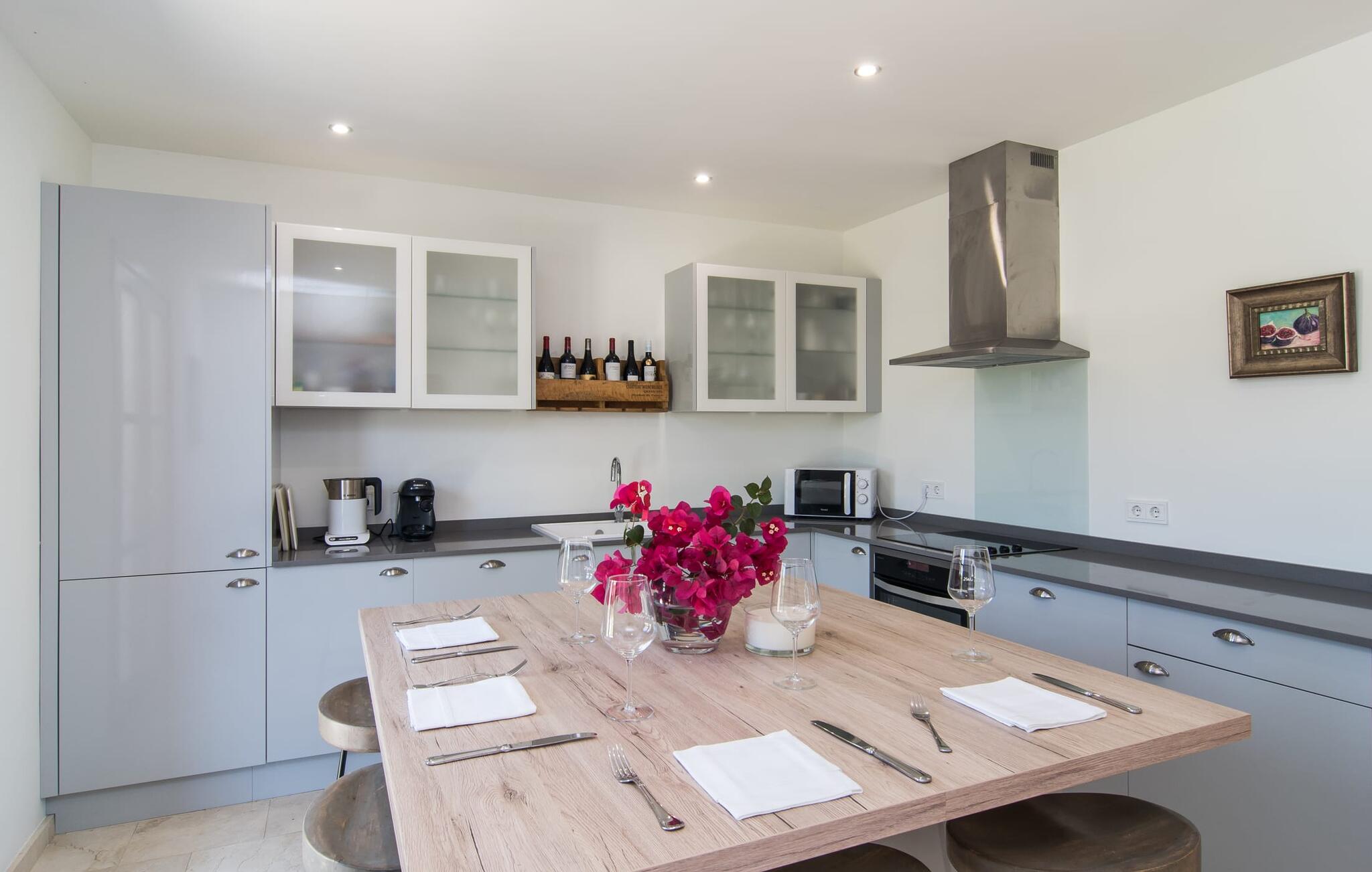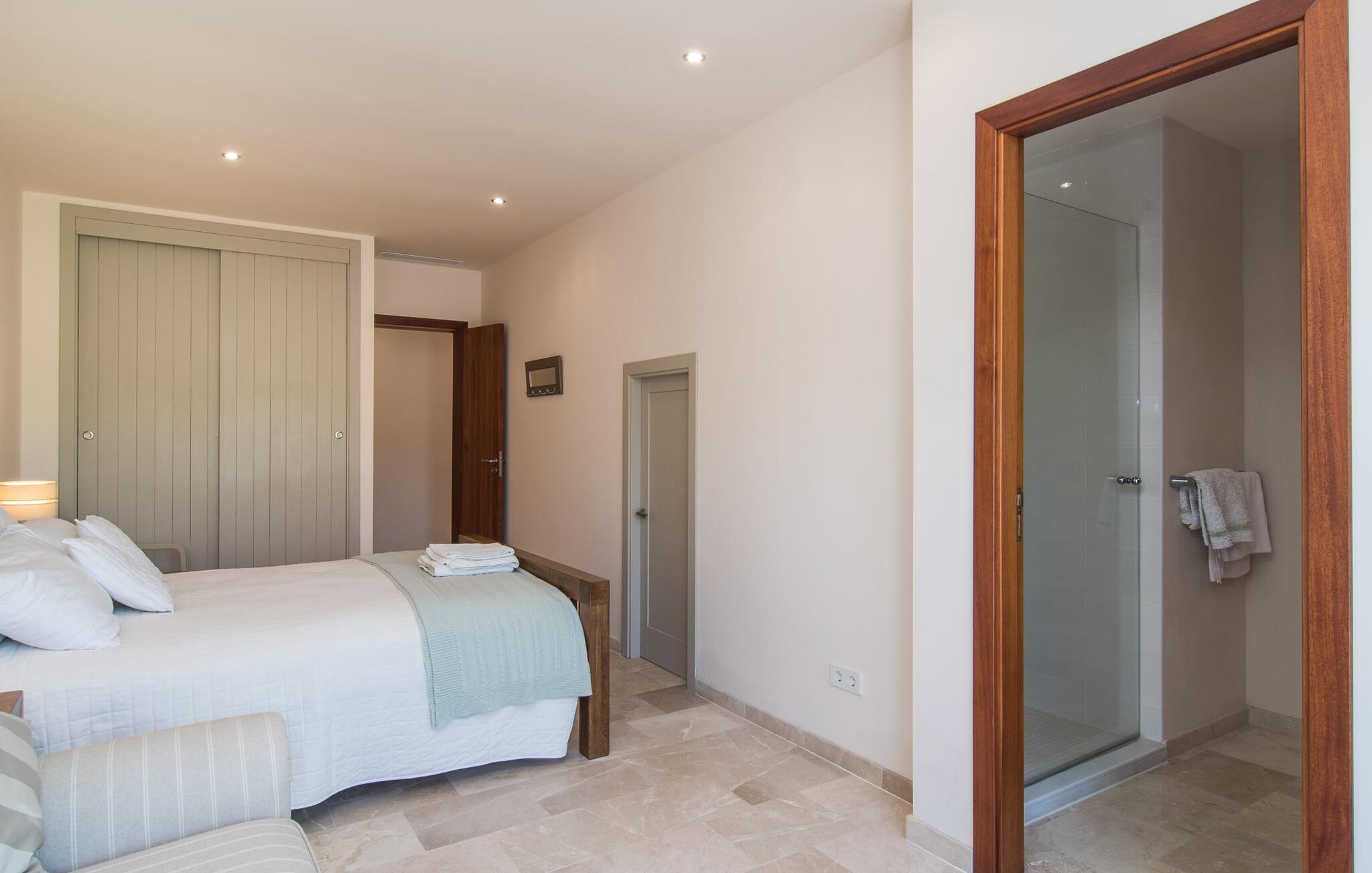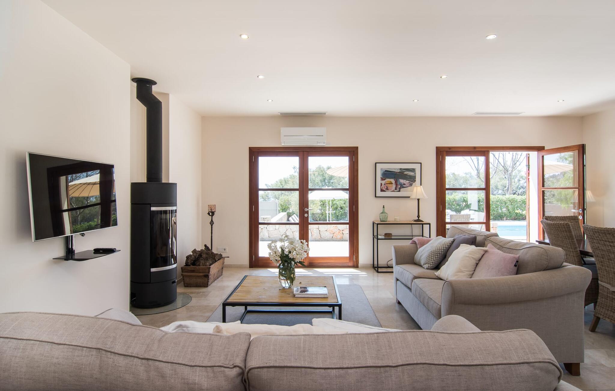 Een scherp gevoel voor stijl kenmerkt zowel het exterieur als het interieur van de villa, die het best kan worden omschreven als modern en elegant, maar toch ongelooflijk comfortabel. Samen met meubilair van hoge kwaliteit roepen crèmekleuren en natuurlijke tinten een heerlijke landhuissfeer op. Spotjes in het plafond zorgen voor een aangename lichtinval. De meeste kamers bevinden zich op de begane grond; er is alleen nog een woonkamer op de bovenverdieping. Op de begane grond vind je de entree, die je verwelkomt met een vriendelijk "Hola", een badkamer, een kleine woonkamer en de ruime, gecombineerde woon- en eetkamer met twee gezellige banken. Vanaf hier kun je tv kijken of je laten betoveren door de open haard, terwijl de chique eettafel met comfortabele rieten stoelen uitnodigt om samen te genieten van lange maaltijden. Over eten gesproken: Vlak ernaast ligt de prachtig uitgeruste designkeuken met een praktisch kookeiland en barkrukken. Alle vier de slaapkamers, elk met een eigen badkamer, zijn ingericht in een aangenaam ingetogen stijl met zorgvuldig geselecteerde woonaccessoires, zodat je je meteen thuis voelt.