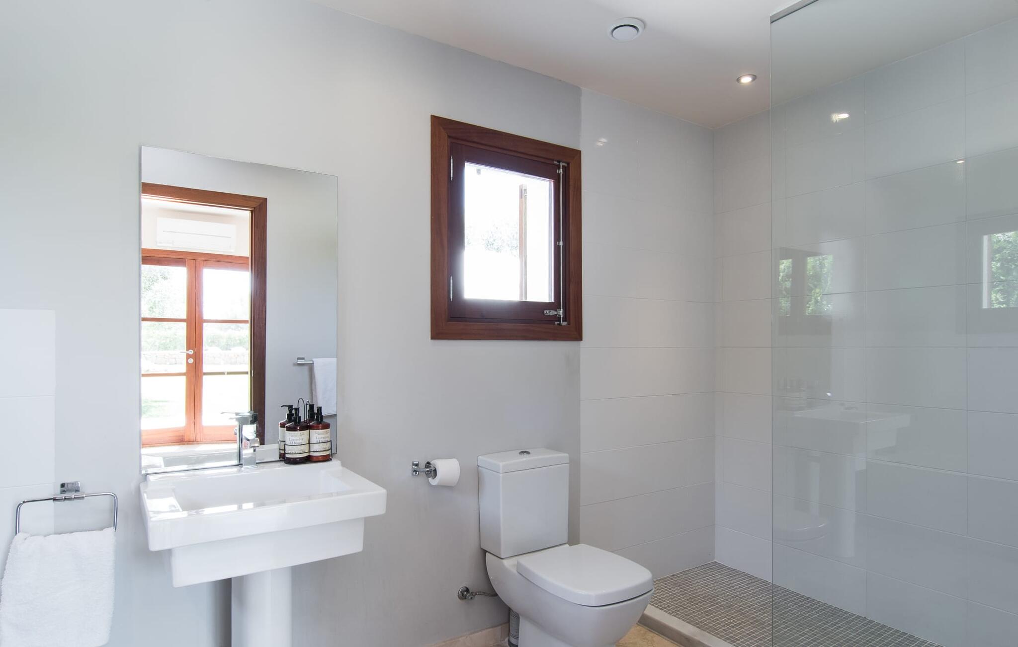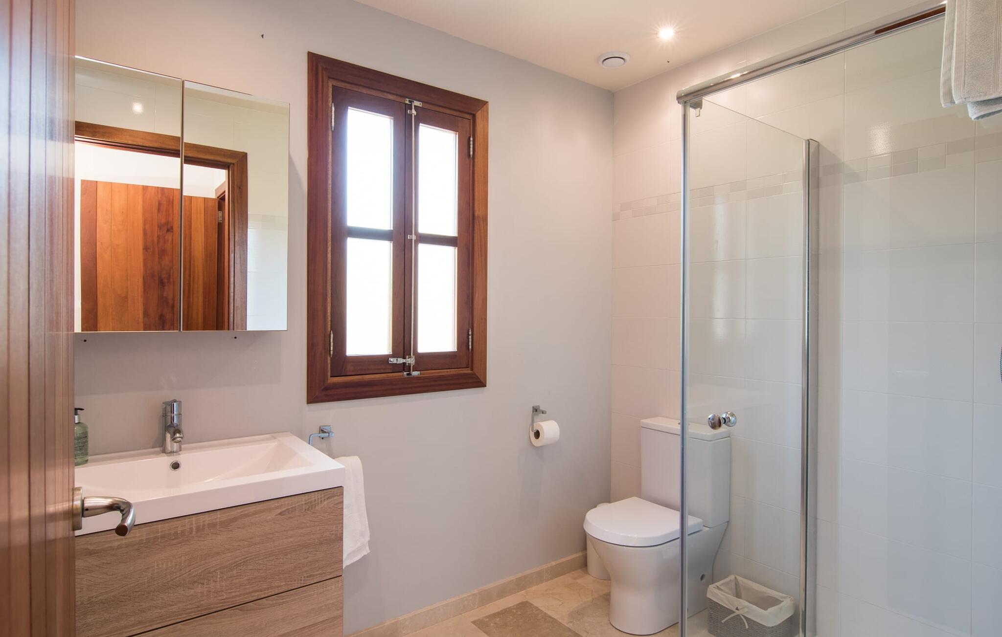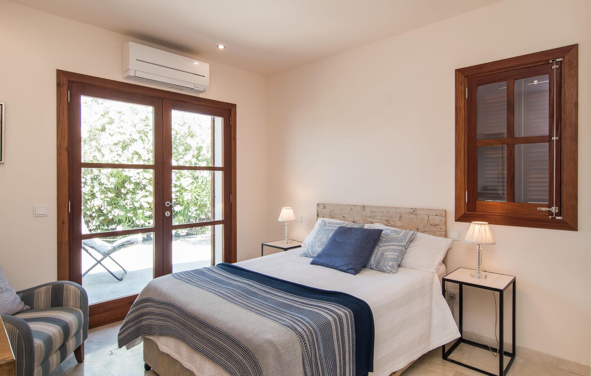 Een scherp gevoel voor stijl kenmerkt zowel het exterieur als het interieur van de villa, die het best kan worden omschreven als modern en elegant, maar toch ongelooflijk comfortabel. Samen met meubilair van hoge kwaliteit roepen crèmekleuren en natuurlijke tinten een heerlijke landhuissfeer op. Spotjes in het plafond zorgen voor een aangename lichtinval. De meeste kamers bevinden zich op de begane grond; er is alleen nog een woonkamer op de bovenverdieping. Op de begane grond vind je de entree, die je verwelkomt met een vriendelijk "Hola", een badkamer, een kleine woonkamer en de ruime, gecombineerde woon- en eetkamer met twee gezellige banken. Vanaf hier kun je tv kijken of je laten betoveren door de open haard, terwijl de chique eettafel met comfortabele rieten stoelen uitnodigt om samen te genieten van lange maaltijden. Over eten gesproken: Vlak ernaast ligt de prachtig uitgeruste designkeuken met een praktisch kookeiland en barkrukken. Alle vier de slaapkamers, elk met een eigen badkamer, zijn ingericht in een aangenaam ingetogen stijl met zorgvuldig geselecteerde woonaccessoires, zodat je je meteen thuis voelt.