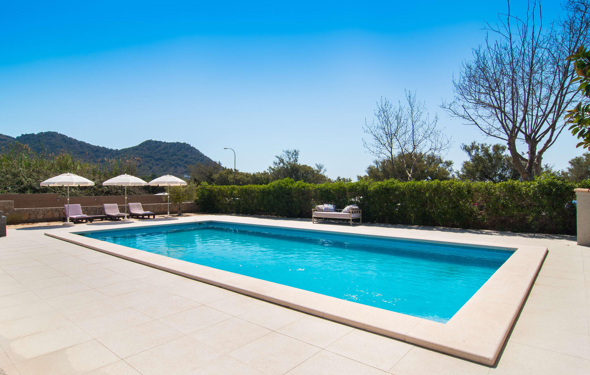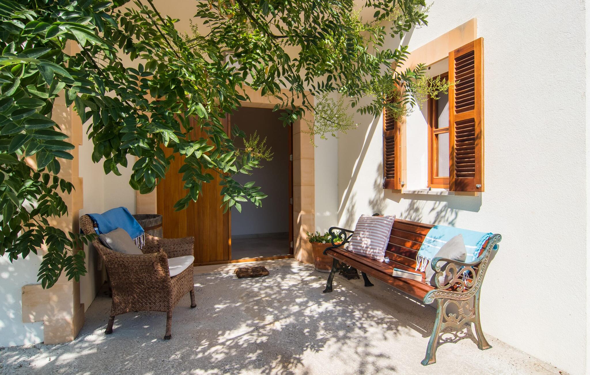 Gelegen op een perceel van 1.200 m² in de exclusieve urbanisatie Costa dels Pins in het oosten van het eiland, ligt Villa Luz del Sol, wat betekent zonlicht, niet alleen direct aan zee, maar biedt ook een fantastisch uitzicht op de groene bergen aan de andere kant. Het huis met bruine houten luiken is smaakvol ontworpen in een traditionele villastijl en wordt bijna volledig omringd door betegelde terrassen. Talrijke zitjes met schaduwrijke parasols nodigen uit tot een paar welverdiende pauzes. Als je van elke zonnestraal wilt genieten, kun je je terugtrekken op het ruime dakterras en in alle rust genieten van het uitzicht op het glinsterende blauwe water. Niet alleen de nabijgelegen zee is ideaal om te zwemmen en te spetteren, maar ook het ruime, aflopende zwembad, omringd door indrukwekkend hoge palmbomen en geurige lavendelstruiken: Dankzij de aanzienlijke lengte van het zwembad is het een heerlijke plek om baantjes te trekken of gewoon te ontspannen op de lilo met een cocktail in de hand.