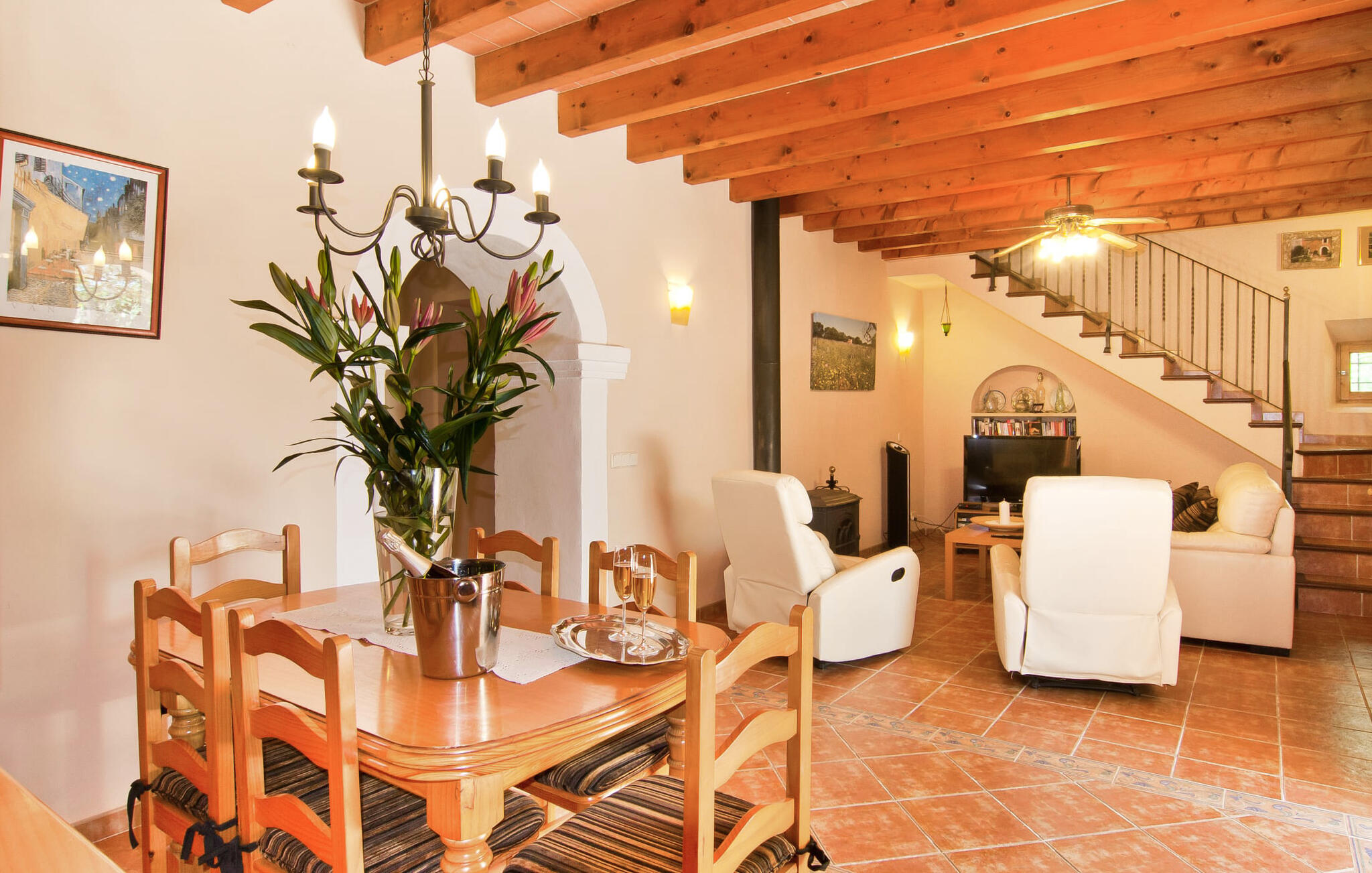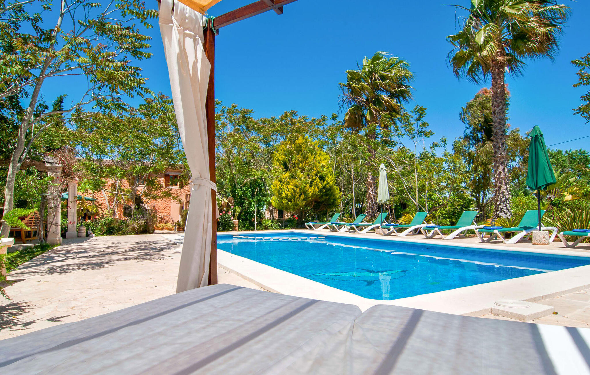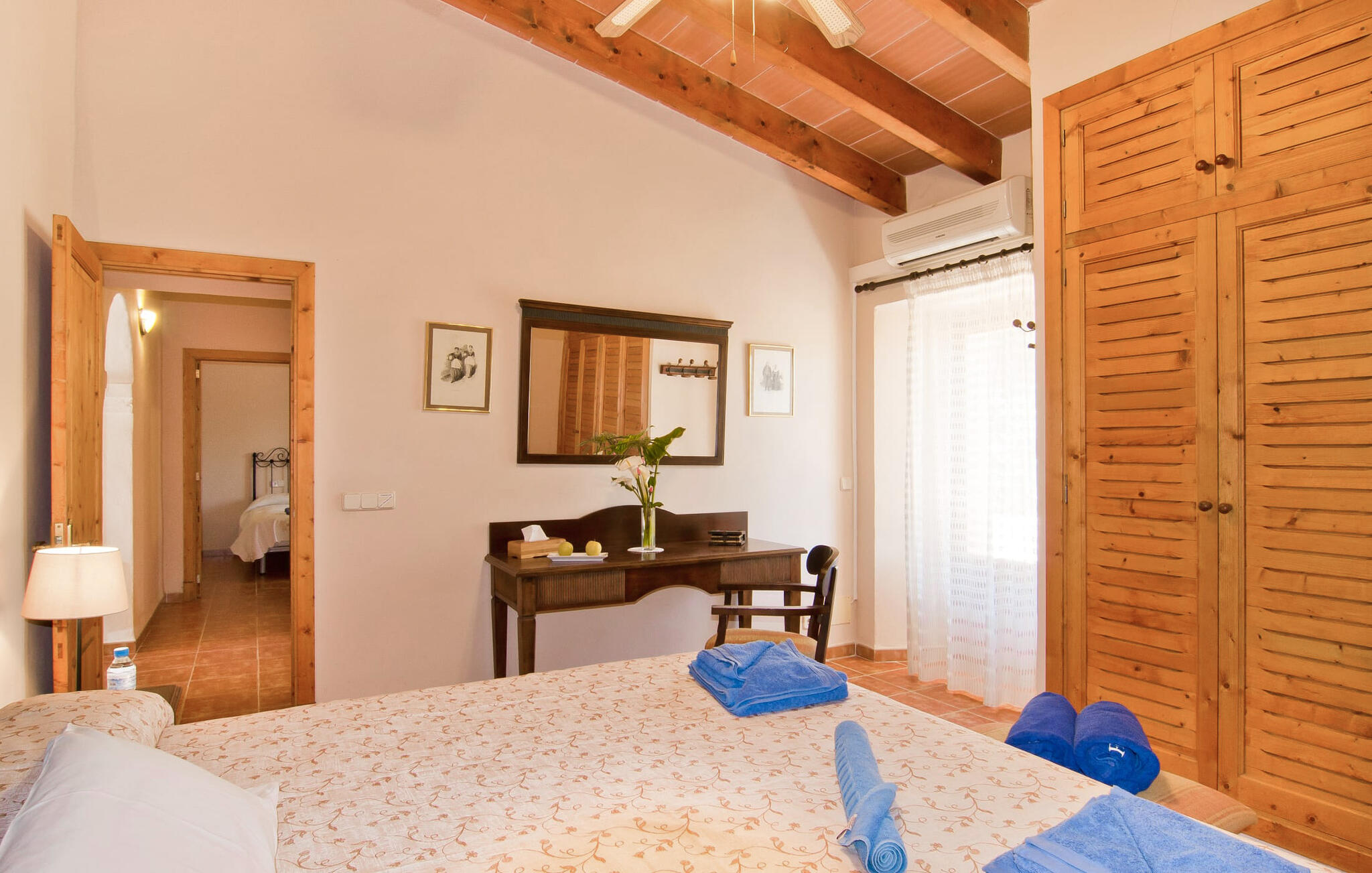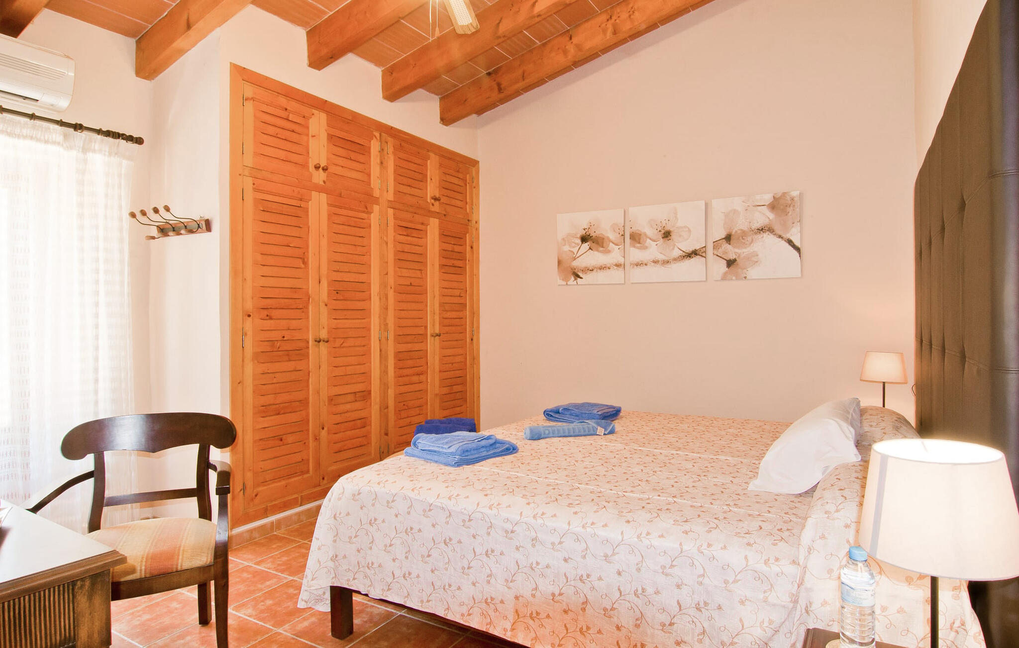 Het huis ligt op het zuiden en is aan de buitenkant bekleed met de traditionele steen uit de streek. Bijna alle kamers hebben zichtbare balken aan het plafond, typisch voor het eiland, die perfect worden gecompenseerd door prachtige tegelvloeren. Het terras leidt direct naar de woon/eetkamer op de begane grond. In de hoek van de kamer, waar de bank en fauteuil staan, is ook de open haard, in wiens warme gloed je uren kunt ontspannen, vooral in de koelere maanden. Samen met de centrale verwarming, die ook in de kelder is geïnstalleerd, zorgt de open haard ervoor dat de temperatuur hier aangenaam blijft, zelfs als het buiten koeler wordt. Als je voorbij de eettafel en de kast in de woonkamer kijkt, zie je de keuken, die volledig is uitgerust met alles wat je nodig hebt om je vakantiehuishouden te runnen. Als je van koken houdt, zul je het hier geweldig vinden. Er zijn ook twee slaapkamers en twee badkamers op de begane grond, waarvan één en-suite. Boven vind je nog twee slaapkamers en de derde badkamer. Alle slaapkamers zijn voorzien van airconditioning/verwarming en zijn mooi, praktisch en natuurlijk comfortabel ingericht. De kledingkasten bieden voldoende ruimte om de meegebrachte kleding op te bergen. En de kamers zijn uitgerust met comfortabele bedden, zodat je alles hebt voor een goede nachtrust. De badkamers zijn modern ingericht en even praktisch als elegant. Een van de badkamers heeft een hydromassagebad. In een klein bijgebouw vind je de sauna, waar je kunt ontspannen en je lichaam en geest kunt verwennen. Er staan twee mountainbikes tot je beschikking, waarmee je energie kunt verbranden terwijl je de nabije en verre omgeving verkent. De goed uitgeruste Villa Pambola ligt afgelegen op een landelijk landgoed in het oosten van het eiland, op ongeveer drie kilometer van Cas Concos des Cavaller. Stranden en steden in het oosten van het eiland zijn vanaf hier gemakkelijk te bereiken. Er is genoeg te doen in Manacor, dat niet ver van hier ligt, en het officiële naaktstrand Es Trenc ligt op slechts een klein eindje rijden. Enkele prachtige stranden in het zuiden van het eiland liggen op slechts een paar minuten rijden, waaronder de stranden van Portopetro en Cala Llombards.