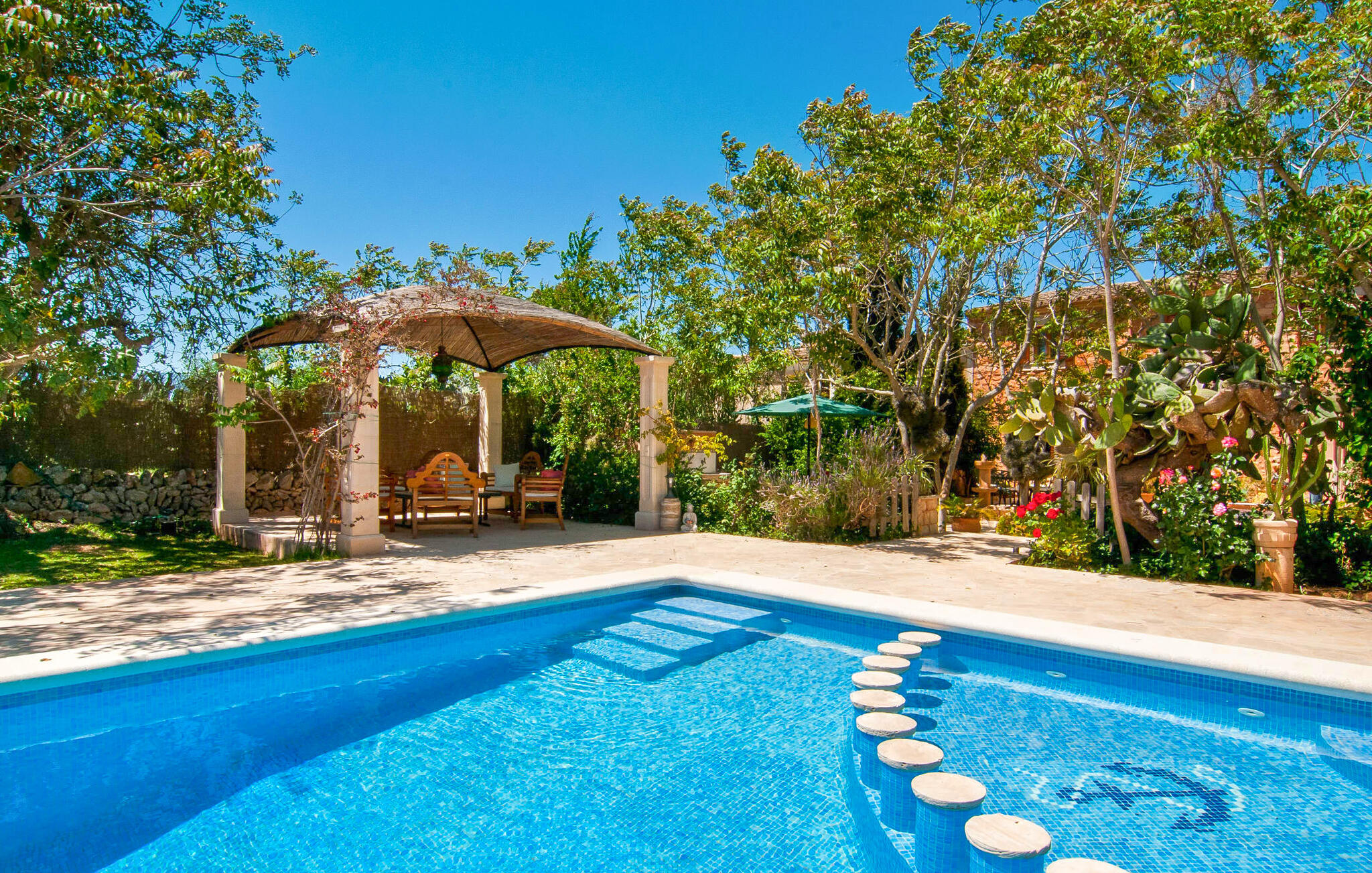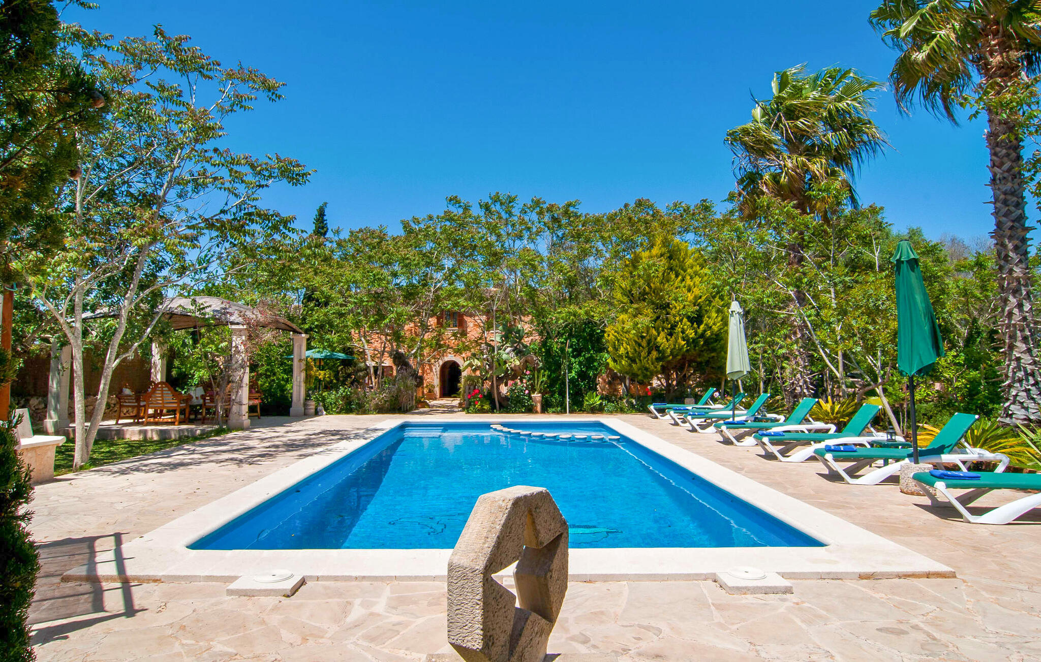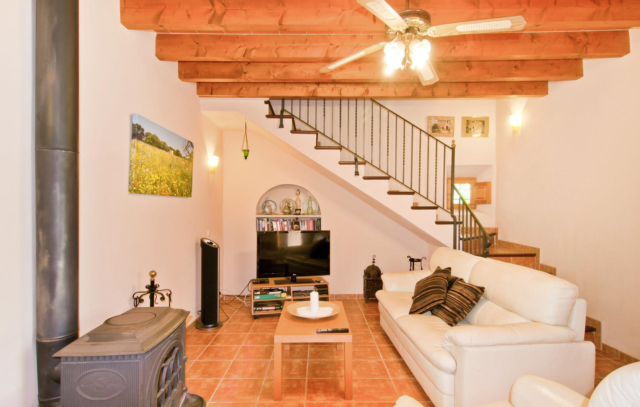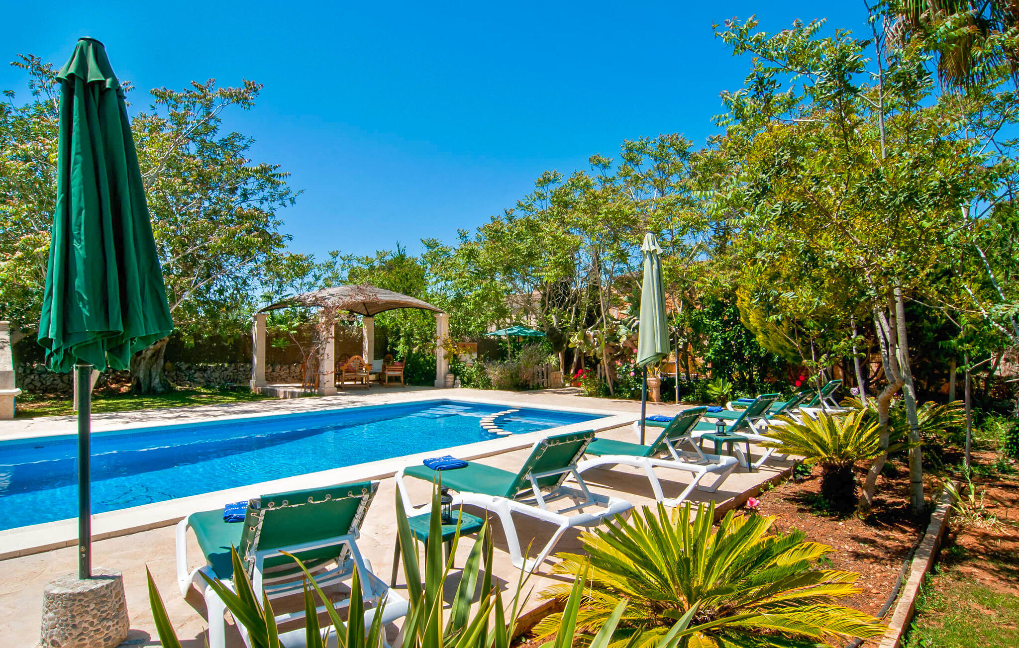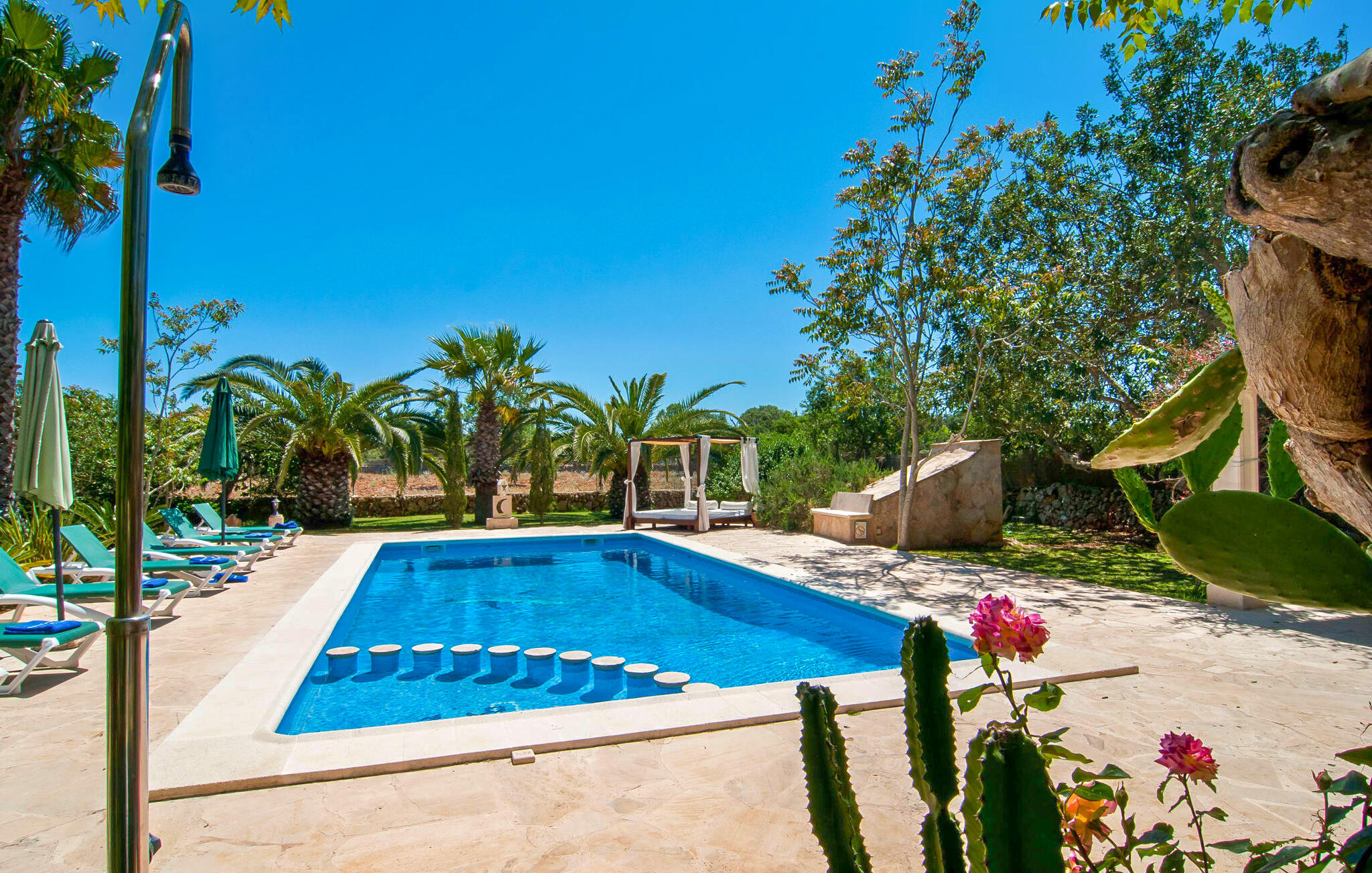 Het huis ligt op het zuiden en is aan de buitenkant bekleed met de traditionele steen uit de streek. Bijna alle kamers hebben zichtbare balken aan het plafond, typisch voor het eiland, die perfect worden gecompenseerd door prachtige tegelvloeren. Het terras leidt direct naar de woon/eetkamer op de begane grond. In de hoek van de kamer, waar de bank en fauteuil staan, is ook de open haard, in wiens warme gloed je uren kunt ontspannen, vooral in de koelere maanden. Samen met de centrale verwarming, die ook in de kelder is geïnstalleerd, zorgt de open haard ervoor dat de temperatuur hier aangenaam blijft, zelfs als het buiten koeler wordt. Als je voorbij de eettafel en de kast in de woonkamer kijkt, zie je de keuken, die volledig is uitgerust met alles wat je nodig hebt om je vakantiehuishouden te runnen. Als je van koken houdt, zul je het hier geweldig vinden. Er zijn ook twee slaapkamers en twee badkamers op de begane grond, waarvan één en-suite. Boven vind je nog twee slaapkamers en de derde badkamer. Alle slaapkamers zijn voorzien van airconditioning/verwarming en zijn mooi, praktisch en natuurlijk comfortabel ingericht. De kledingkasten bieden voldoende ruimte om de meegebrachte kleding op te bergen. En de kamers zijn uitgerust met comfortabele bedden, zodat je alles hebt voor een goede nachtrust. De badkamers zijn modern ingericht en even praktisch als elegant. Een van de badkamers heeft een hydromassagebad. In een klein bijgebouw vind je de sauna, waar je kunt ontspannen en je lichaam en geest kunt verwennen. Er staan twee mountainbikes tot je beschikking, waarmee je energie kunt verbranden terwijl je de nabije en verre omgeving verkent. De goed uitgeruste Villa Pambola ligt afgelegen op een landelijk landgoed in het oosten van het eiland, op ongeveer drie kilometer van Cas Concos des Cavaller. Stranden en steden in het oosten van het eiland zijn vanaf hier gemakkelijk te bereiken. Er is genoeg te doen in Manacor, dat niet ver van hier ligt, en het officiële naaktstrand Es Trenc ligt op slechts een klein eindje rijden. Enkele prachtige stranden in het zuiden van het eiland liggen op slechts een paar minuten rijden, waaronder de stranden van Portopetro en Cala Llombards.