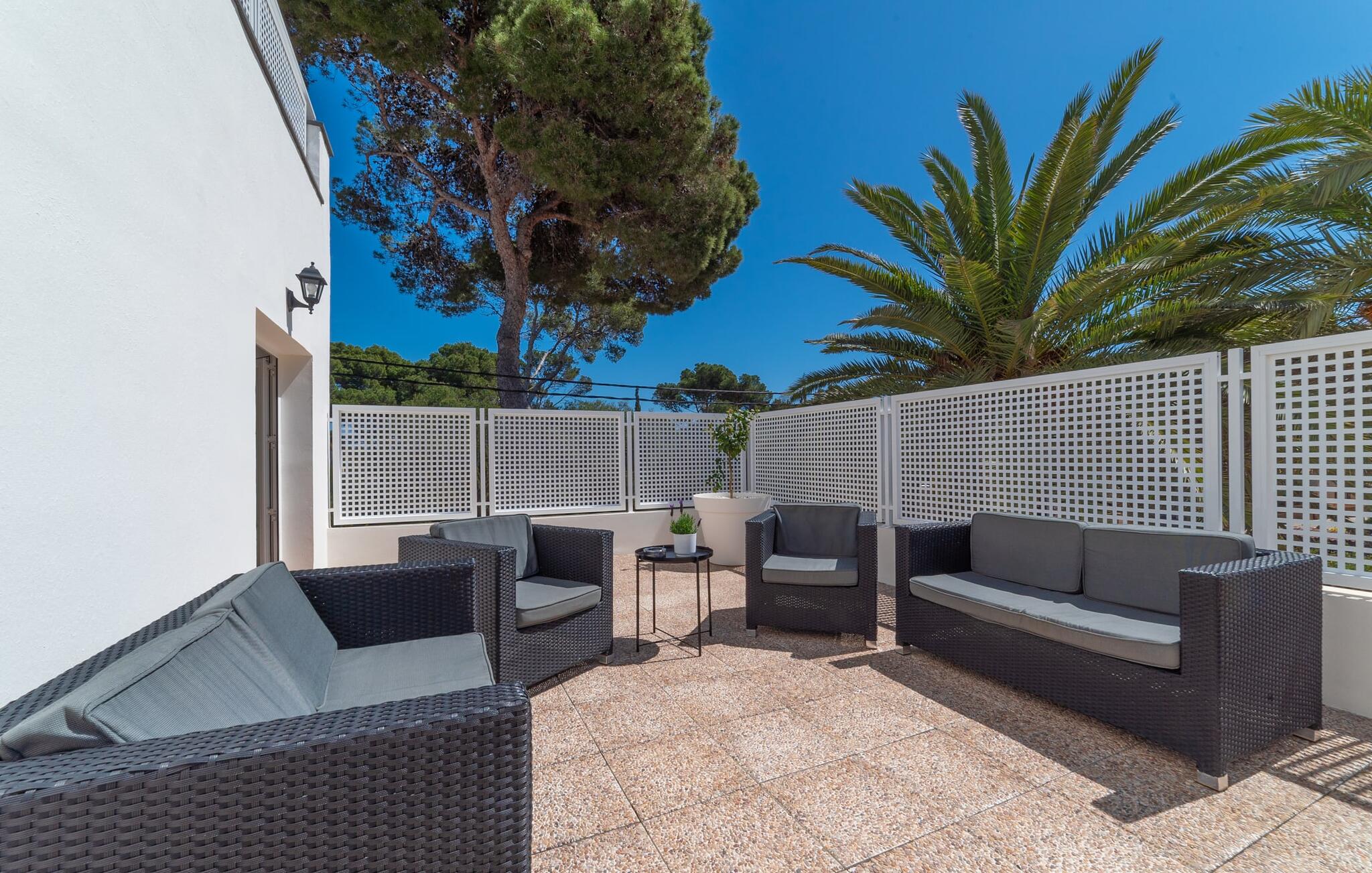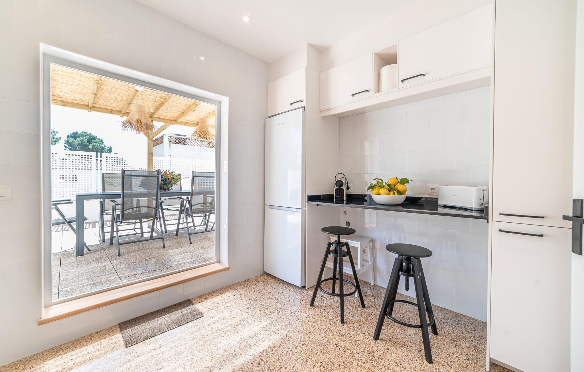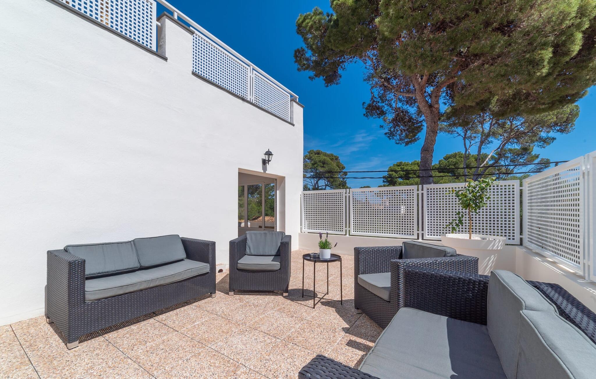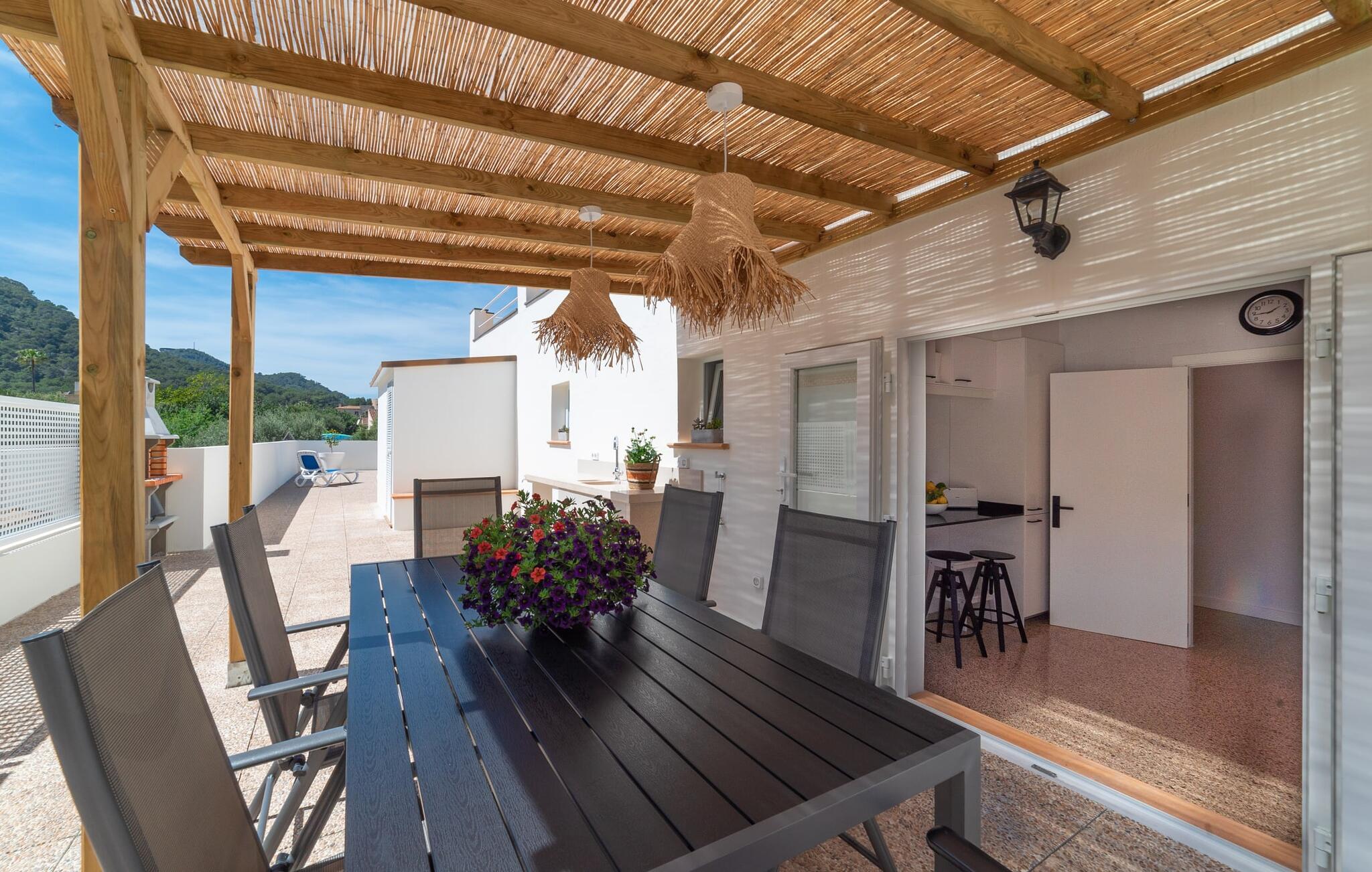 Het ruime, weelderige en uitnodigende balkon is perfect voor het buitenleven. Of je je nu koestert in de Mallorcaanse zon of geniet van de schaduw, van comfortabele ligstoelen tot een eettafel of zithoek, je vindt er genoeg ruimte om te ontspannen. Met een buitenkeuken en een gemetselde barbecue kun je genieten van je maaltijden in de frisse lucht en volop genieten van het zonnige klimaat. Als het tijd is om af te koelen, liggen de prachtige stranden op slechts enkele minuten afstand.