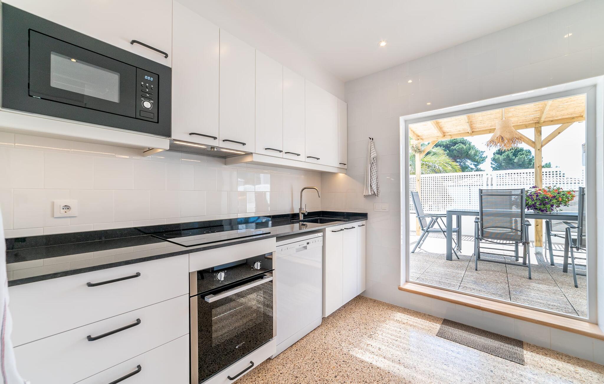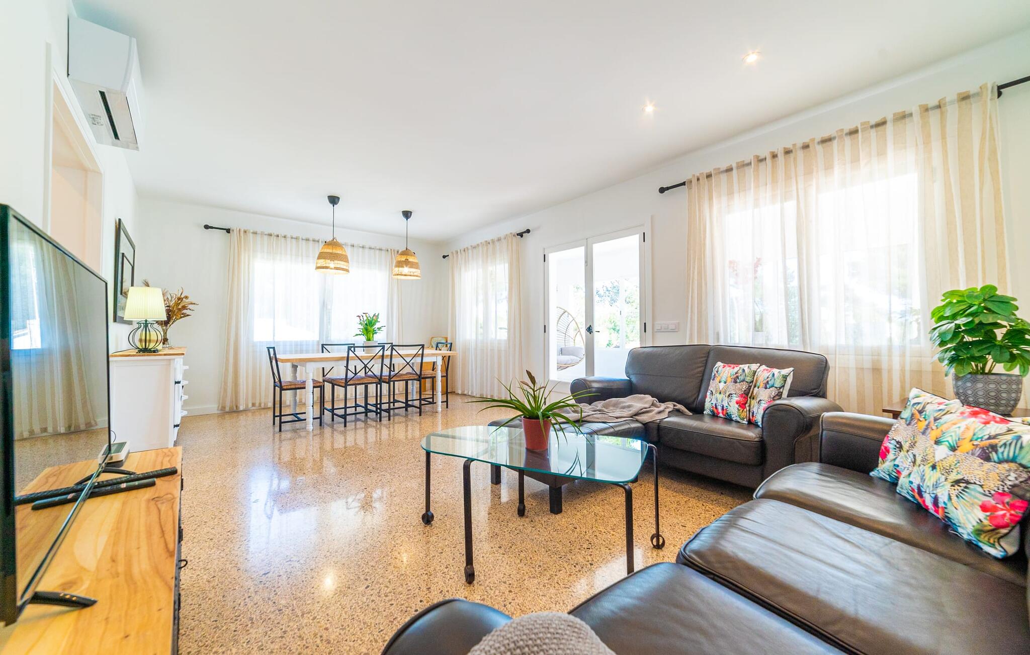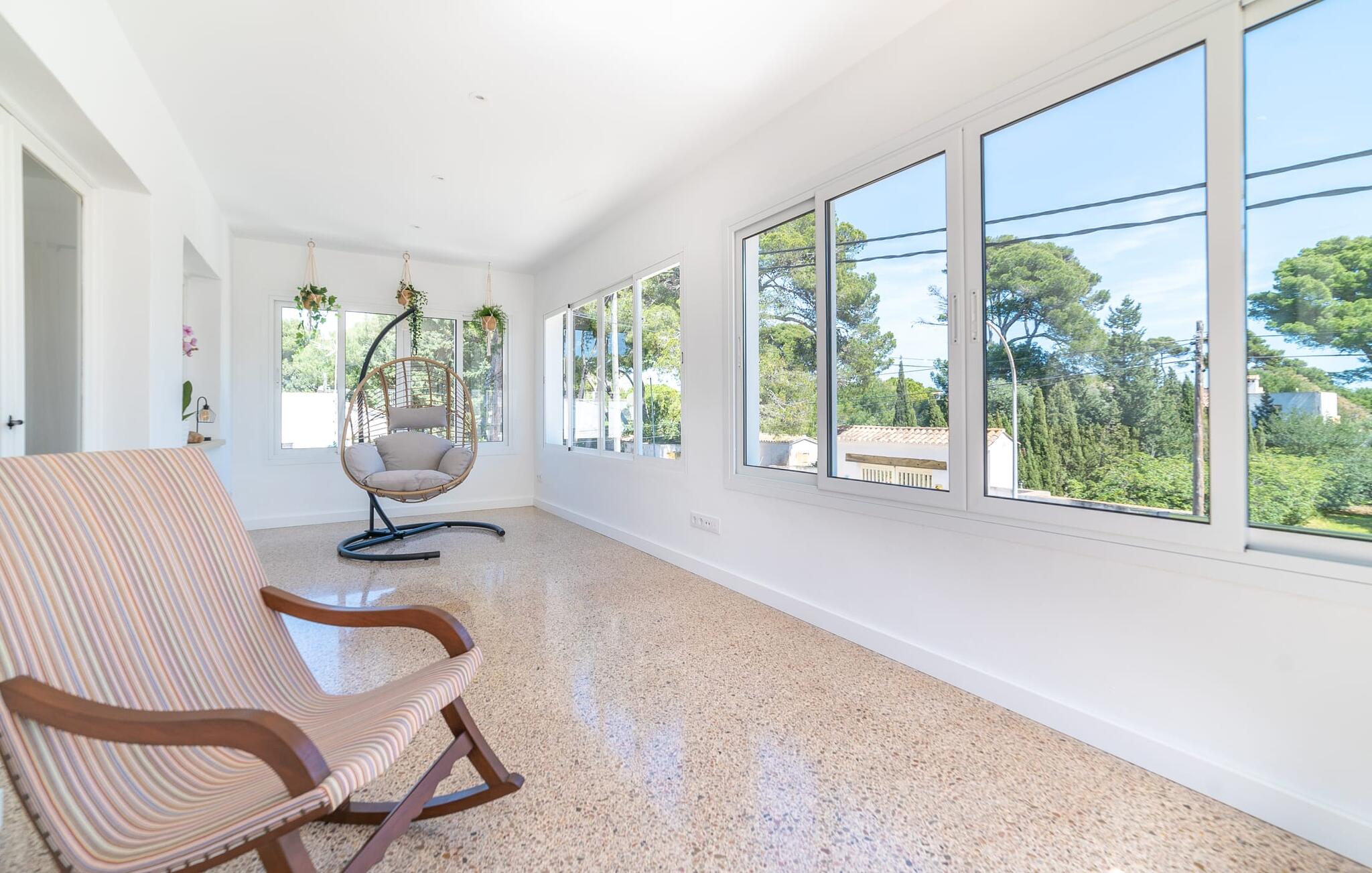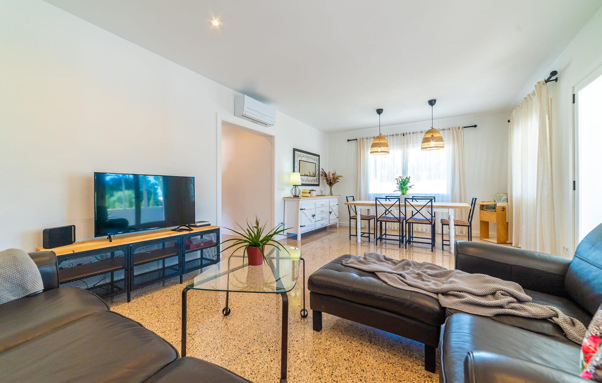 Binnen biedt het appartement een koele, gezellige sfeer. De open woon-eetkamer is ideaal om samen te ontspannen, met kleurrijke meubels die een relaxte sfeer creëren. Geniet van een verscheidenheid aan entertainmentopties en geniet van het uitzicht op het omliggende groen vanaf het omheinde terras. De moderne, lichte keuken is volledig uitgerust voor al je culinaire behoeften, met een kleine bartafel perfect voor een café con leche. Drie slaapkamers, met veel witte en houten details, bieden een rustgevend toevluchtsoord. Twee chique, moderne badkamers ronden deze perfecte vakantiewoning op Mallorca af.