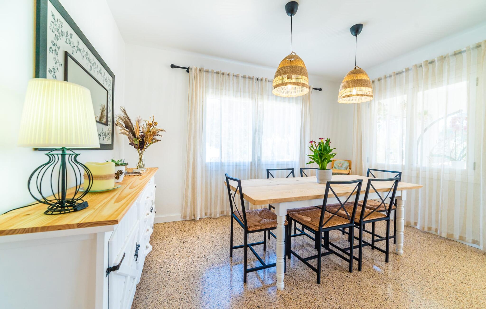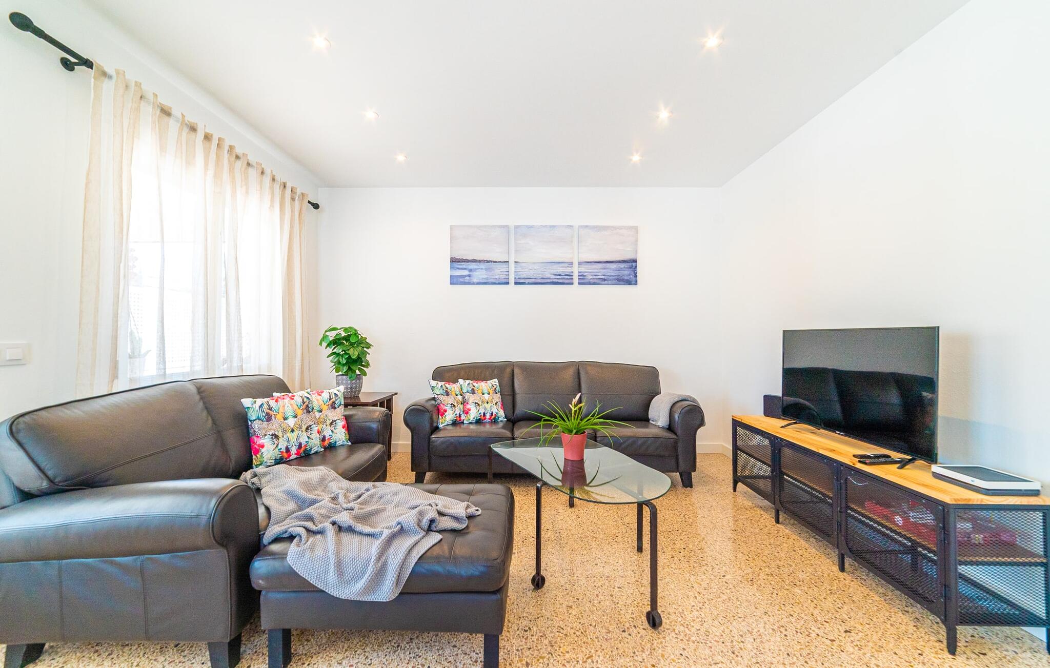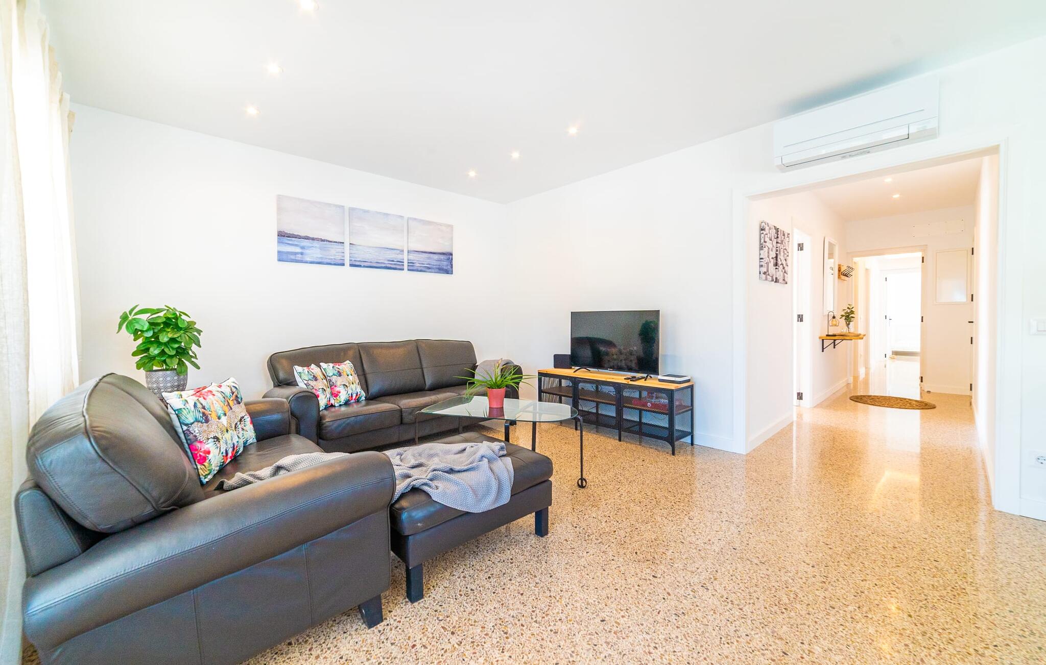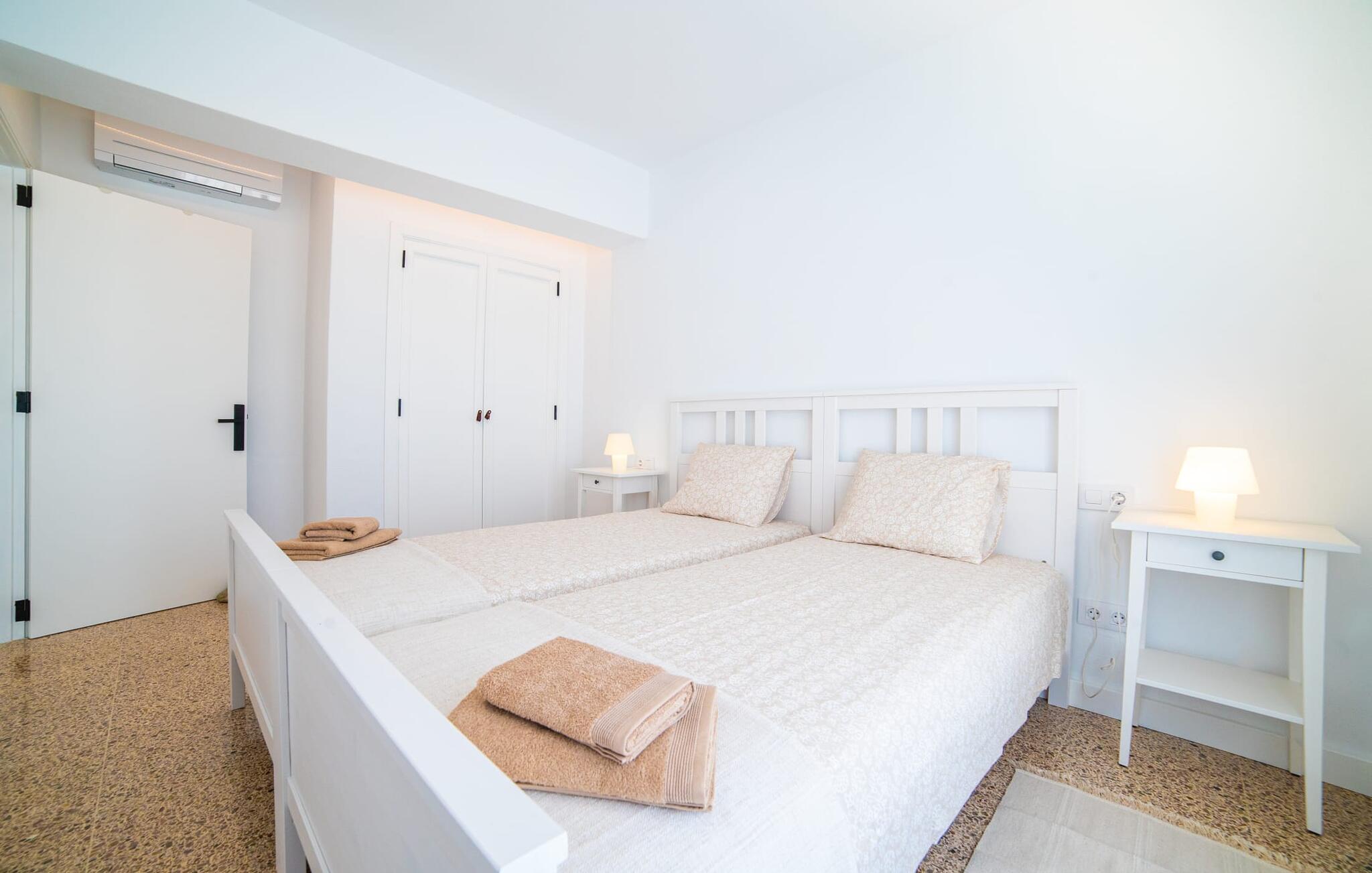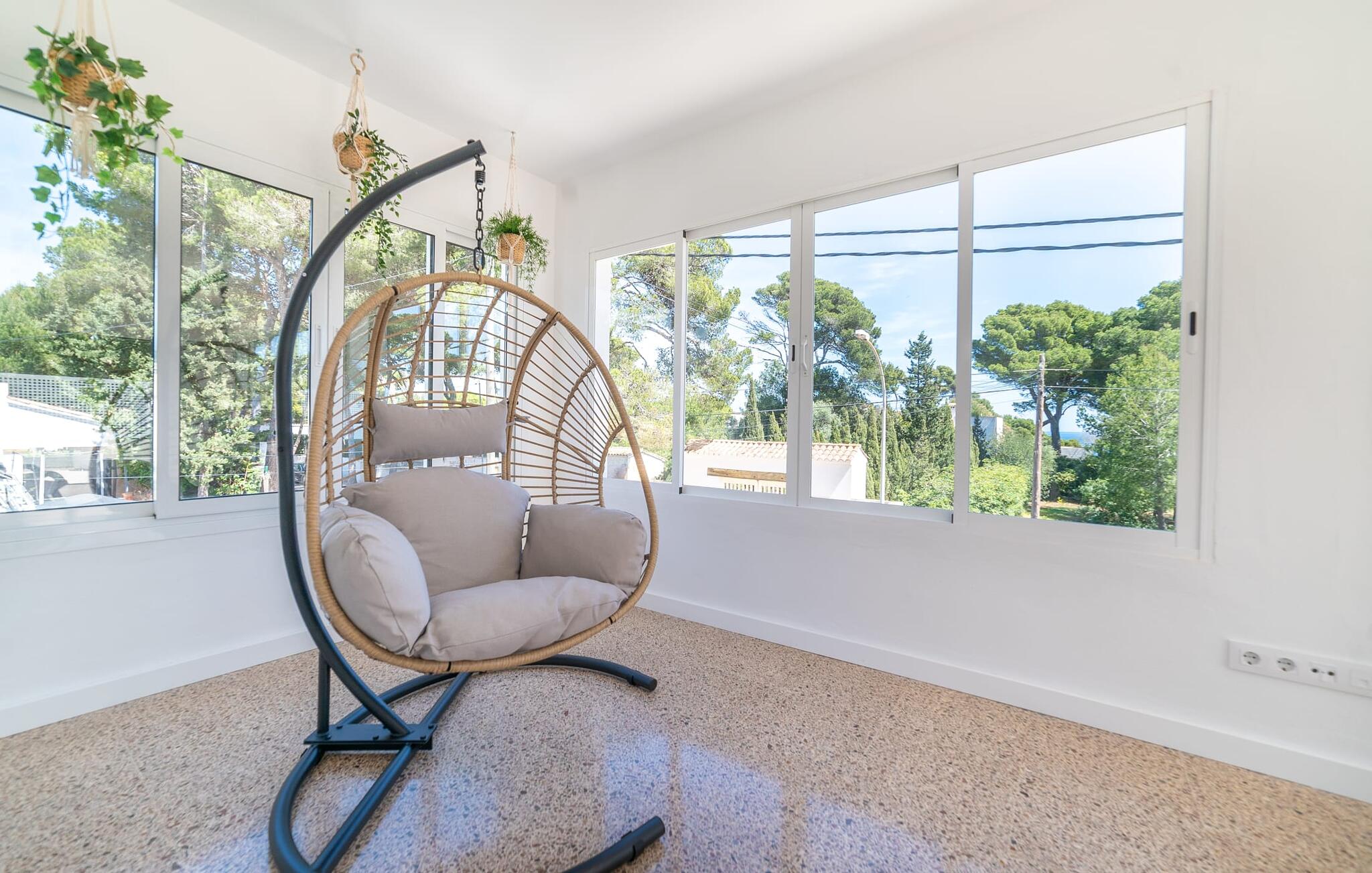 Binnen biedt het appartement een koele, gezellige sfeer. De open woon-eetkamer is ideaal om samen te ontspannen, met kleurrijke meubels die een relaxte sfeer creëren. Geniet van een verscheidenheid aan entertainmentopties en geniet van het uitzicht op het omliggende groen vanaf het omheinde terras. De moderne, lichte keuken is volledig uitgerust voor al je culinaire behoeften, met een kleine bartafel perfect voor een café con leche. Drie slaapkamers, met veel witte en houten details, bieden een rustgevend toevluchtsoord. Twee chique, moderne badkamers ronden deze perfecte vakantiewoning op Mallorca af.