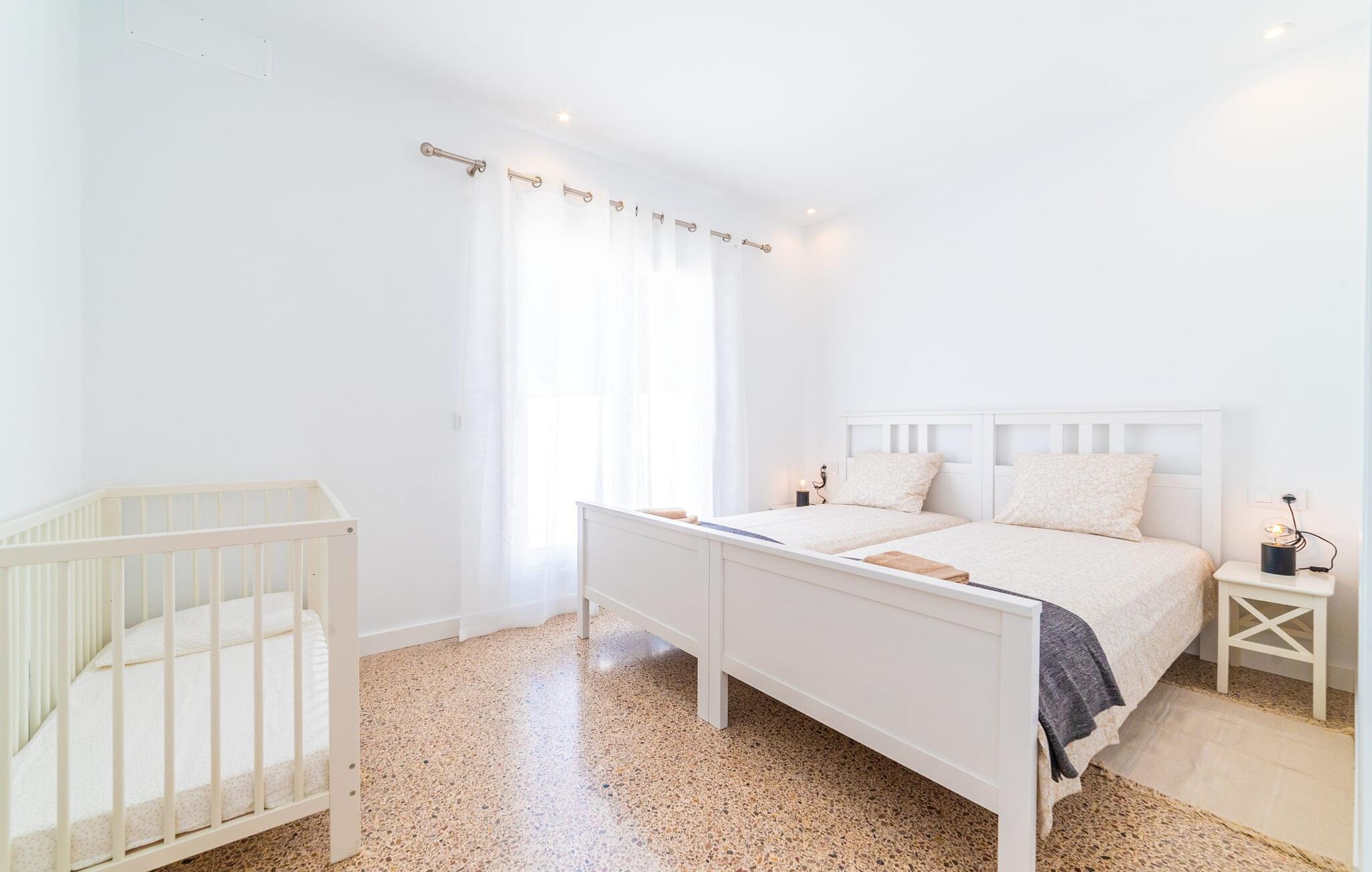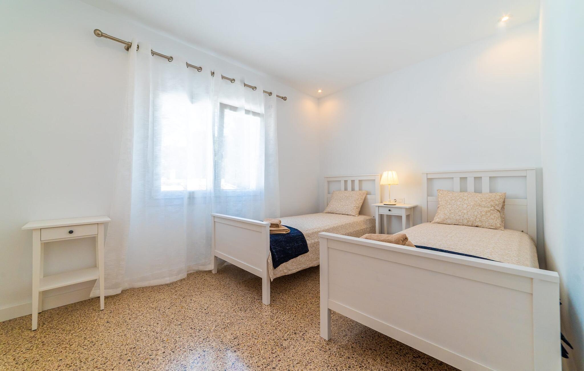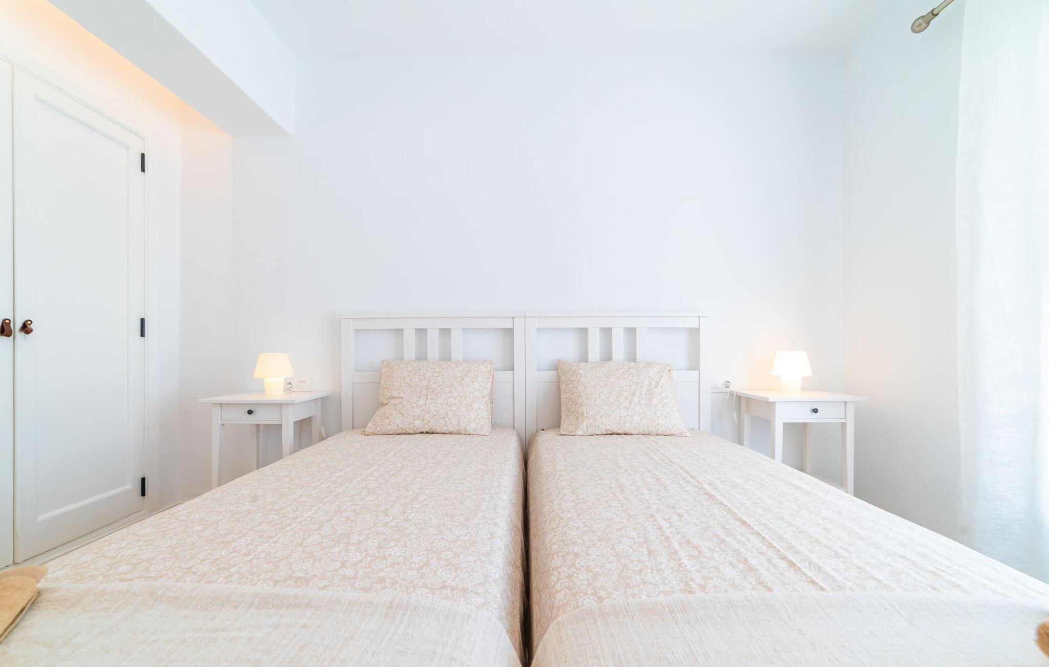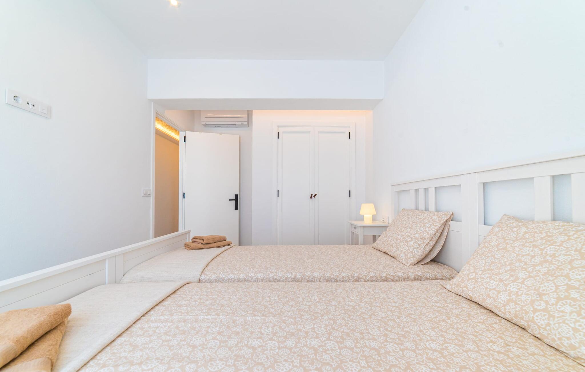 Binnen biedt het appartement een koele, gezellige sfeer. De open woon-eetkamer is ideaal om samen te ontspannen, met kleurrijke meubels die een relaxte sfeer creëren. Geniet van een verscheidenheid aan entertainmentopties en geniet van het uitzicht op het omliggende groen vanaf het omheinde terras. De moderne, lichte keuken is volledig uitgerust voor al je culinaire behoeften, met een kleine bartafel perfect voor een café con leche. Drie slaapkamers, met veel witte en houten details, bieden een rustgevend toevluchtsoord. Twee chique, moderne badkamers ronden deze perfecte vakantiewoning op Mallorca af.