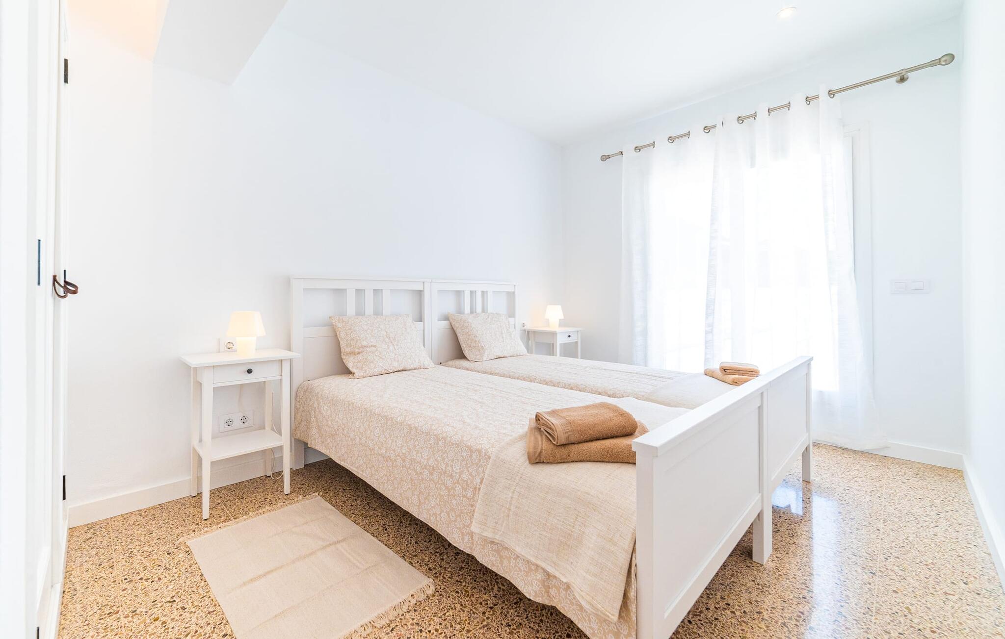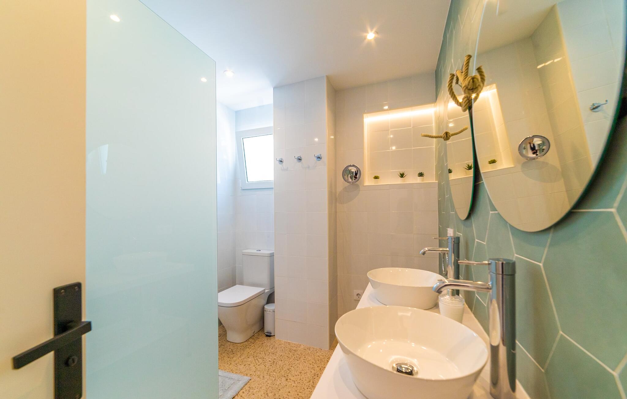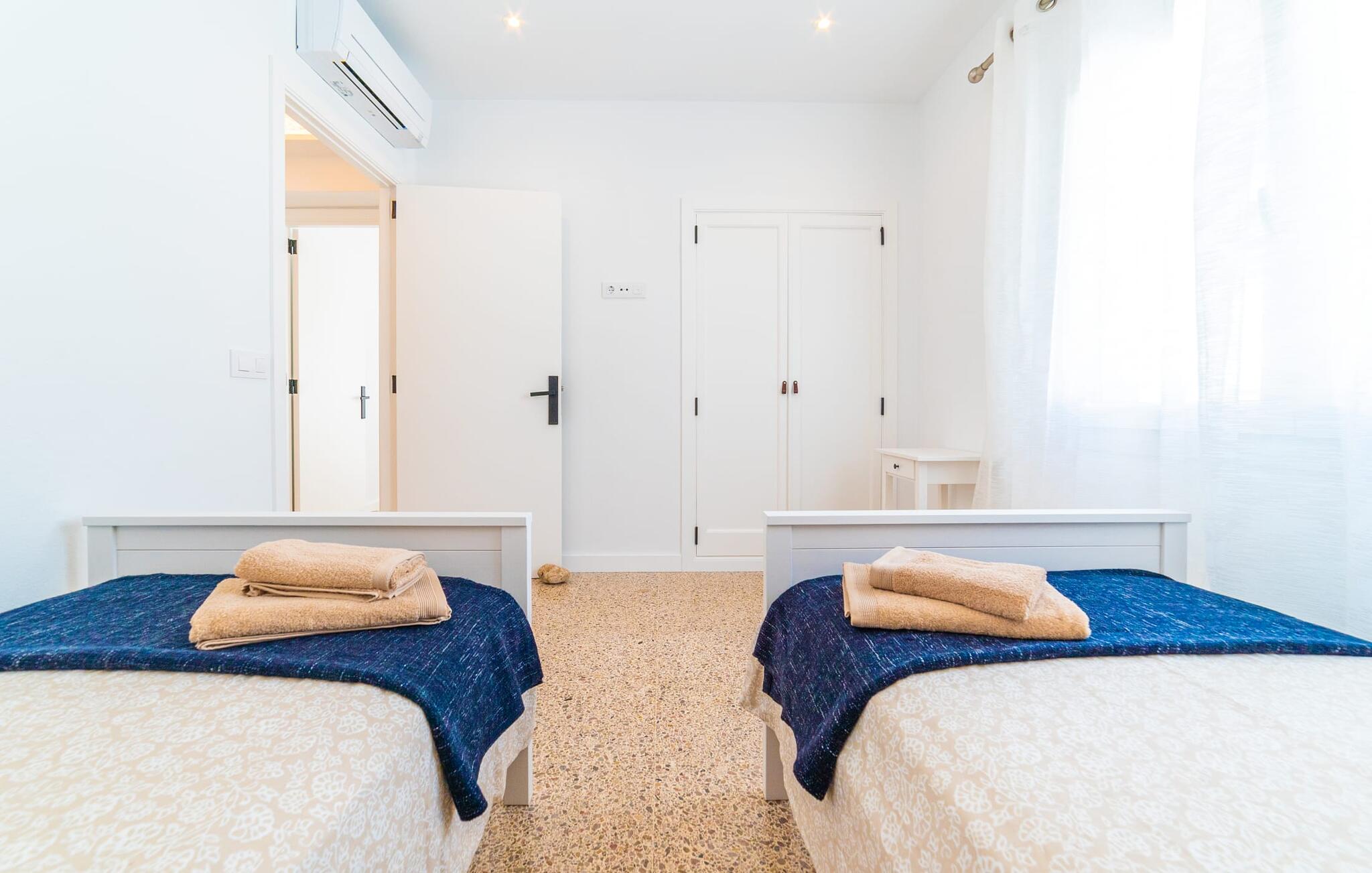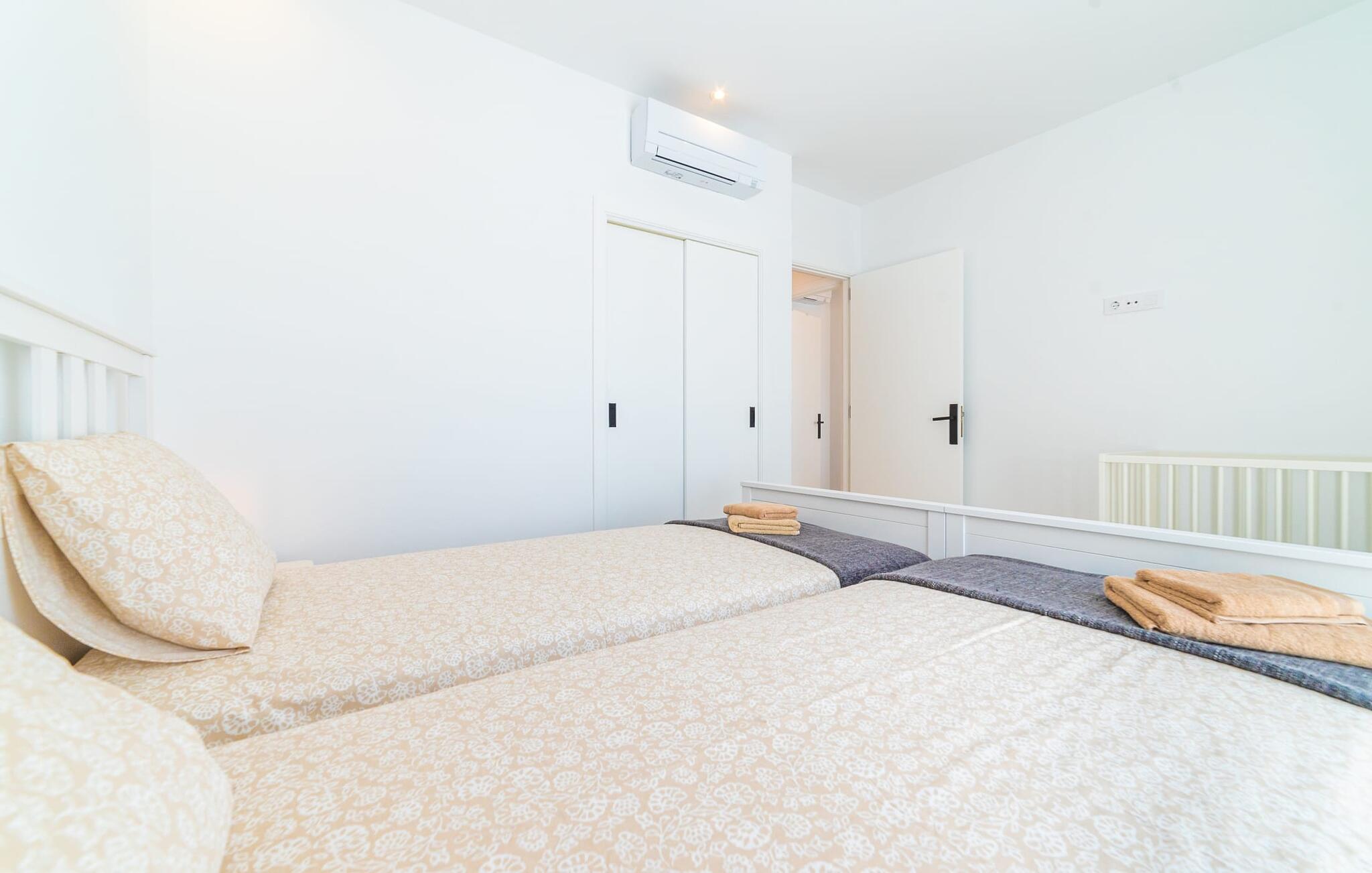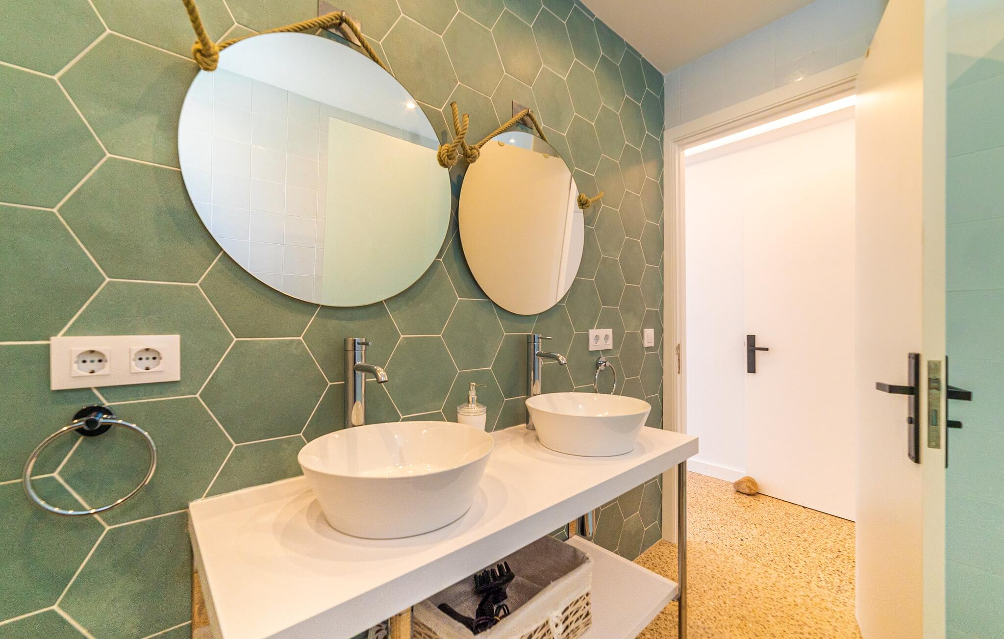 Binnen biedt het appartement een koele, gezellige sfeer. De open woon-eetkamer is ideaal om samen te ontspannen, met kleurrijke meubels die een relaxte sfeer creëren. Geniet van een verscheidenheid aan entertainmentopties en geniet van het uitzicht op het omliggende groen vanaf het omheinde terras. De moderne, lichte keuken is volledig uitgerust voor al je culinaire behoeften, met een kleine bartafel perfect voor een café con leche. Drie slaapkamers, met veel witte en houten details, bieden een rustgevend toevluchtsoord. Twee chique, moderne badkamers ronden deze perfecte vakantiewoning op Mallorca af.