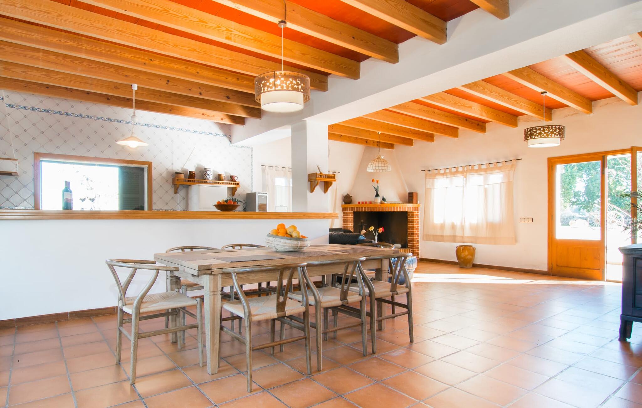 Binnen combineert de villa traditionele charme met modern comfort. De open woonkamer is smaakvol ingericht en heeft een open haard. Er zijn zes slaapkamers voor maximaal twaalf gasten, waarvan vijf met airconditioning en één met een ventilator. Met vier stijlvolle badkamers en ruime woonruimtes is deze villa ideaal voor gezinnen.
