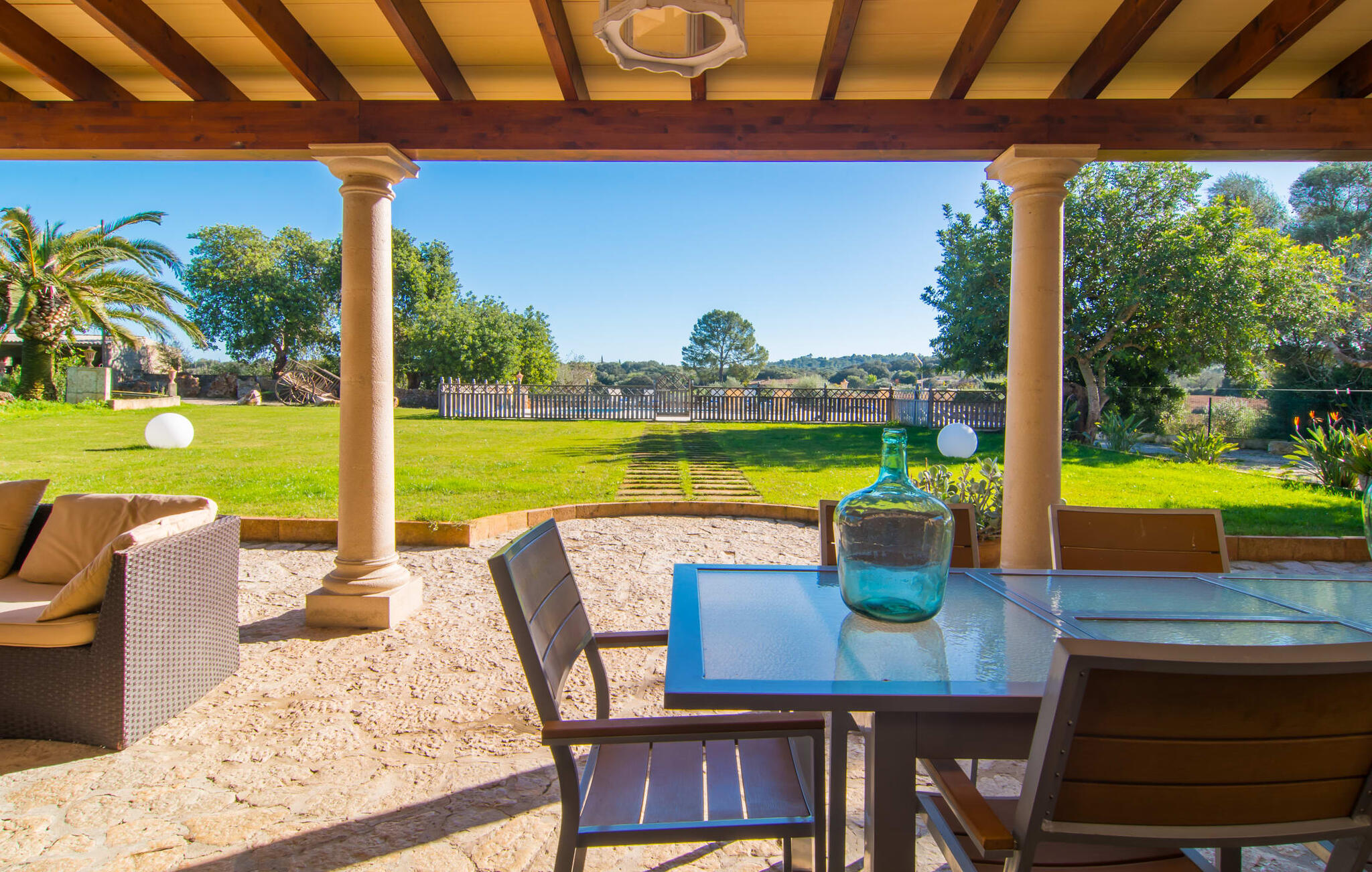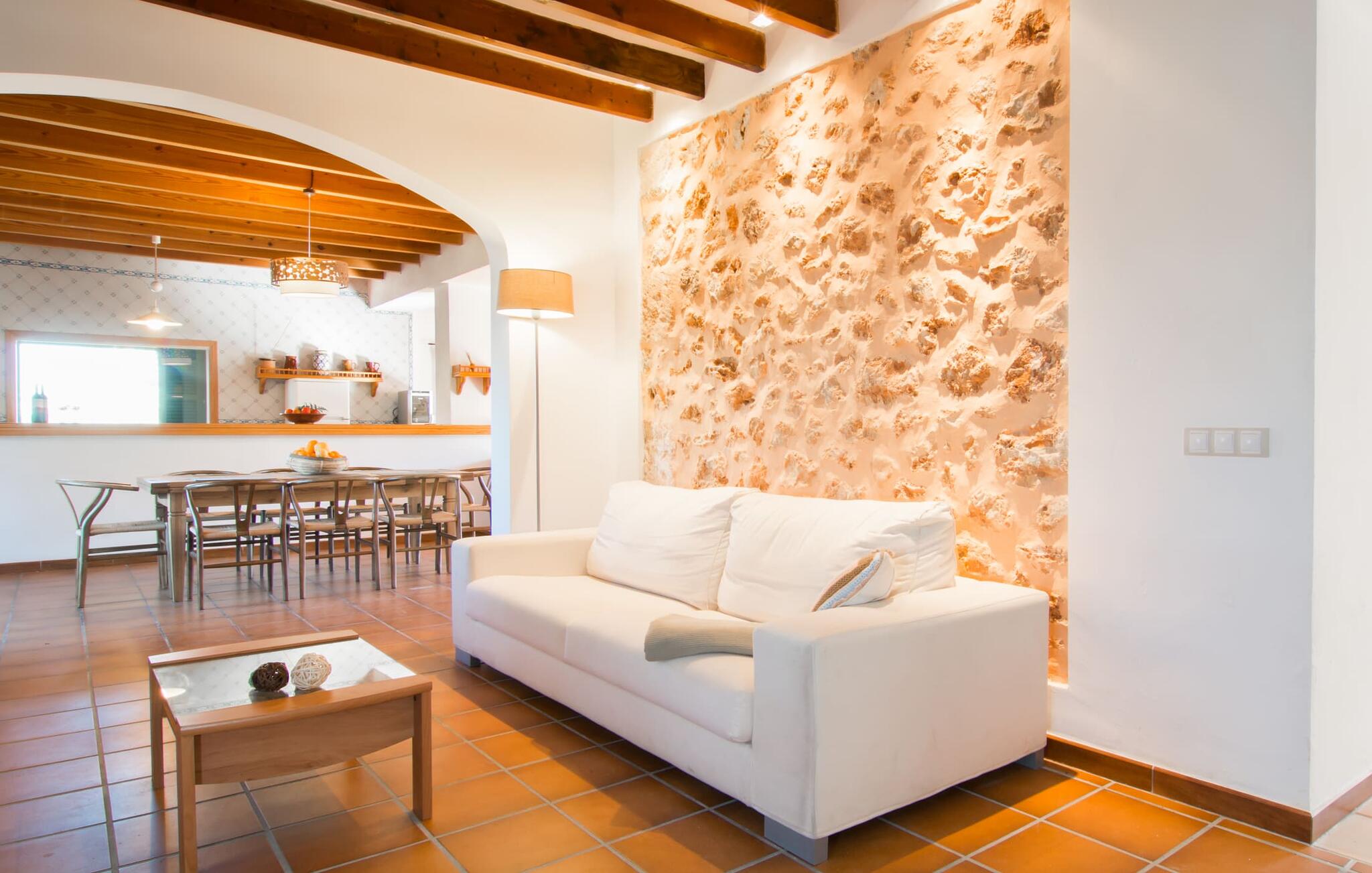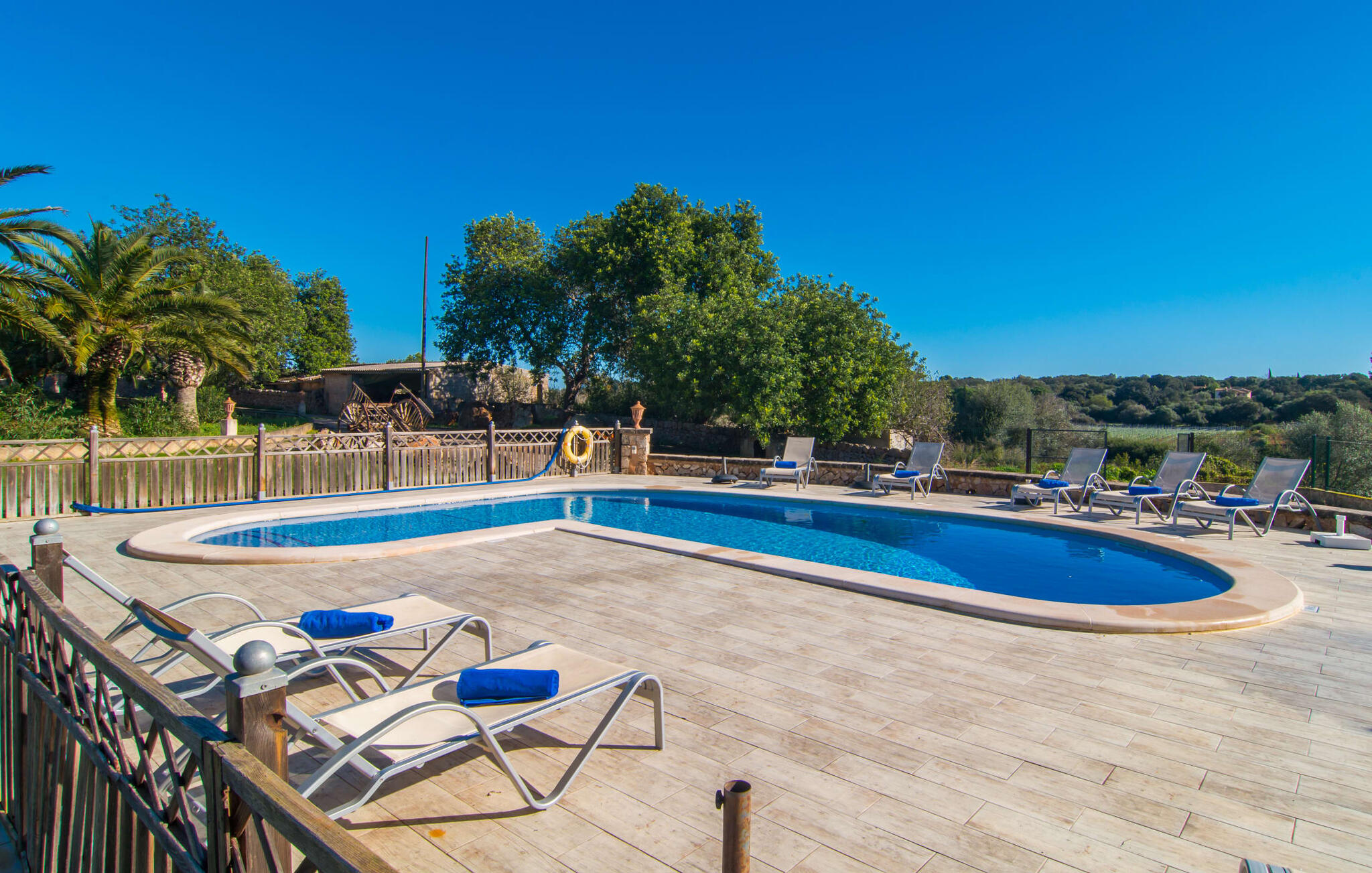 Als de muren van de verfijnd gerenoveerde villa "Son Nadal" konden spreken, zouden ze de rijke geschiedenis van het "oude" Mallorca onthullen. Dit indrukwekkende landgoed van 80.000 m² heeft overblijfselen uit het agrarische verleden, zoals een waterput en een houten ploeg, te midden van oude palmbomen en olijfbomen. Een geplaveid pad leidt van het schaduwrijke terras naar het prachtige zwembadgedeelte, omringd door een stenen zonneterras waar je kunt ontspannen onder grote parasols. Op het overdekte terras staat een lange eettafel waar je kunt genieten van zomerse gerechten, misschien wel bereid op de barbecue.