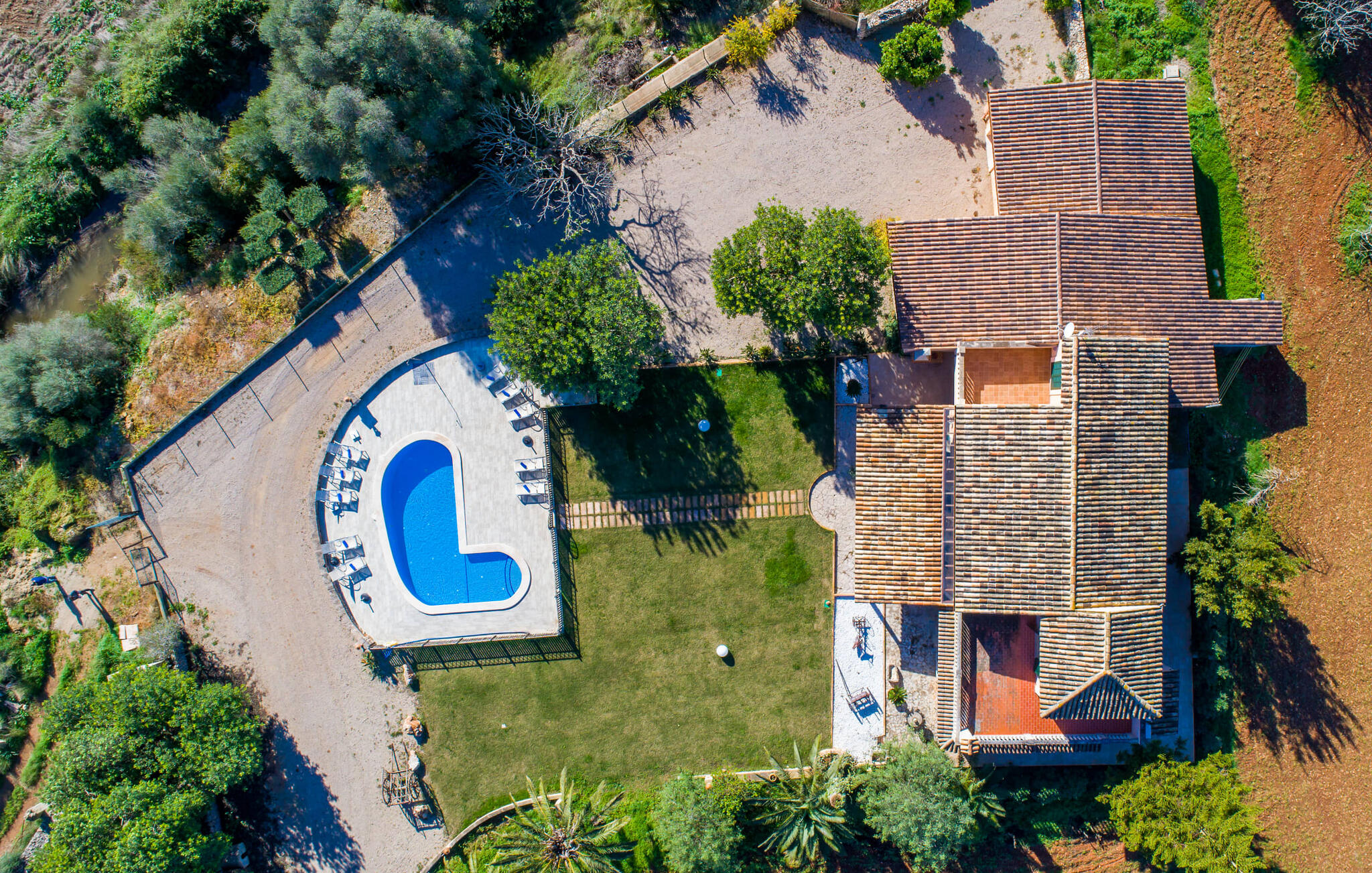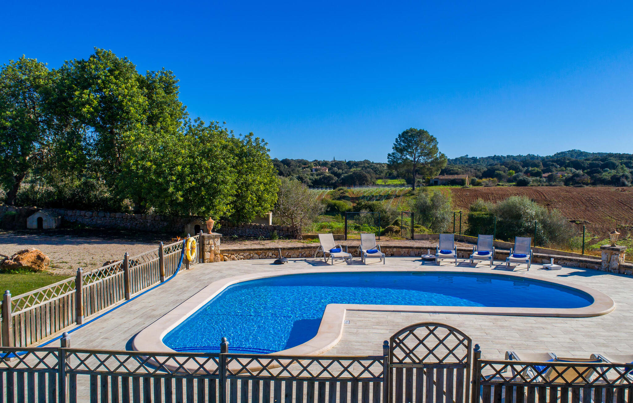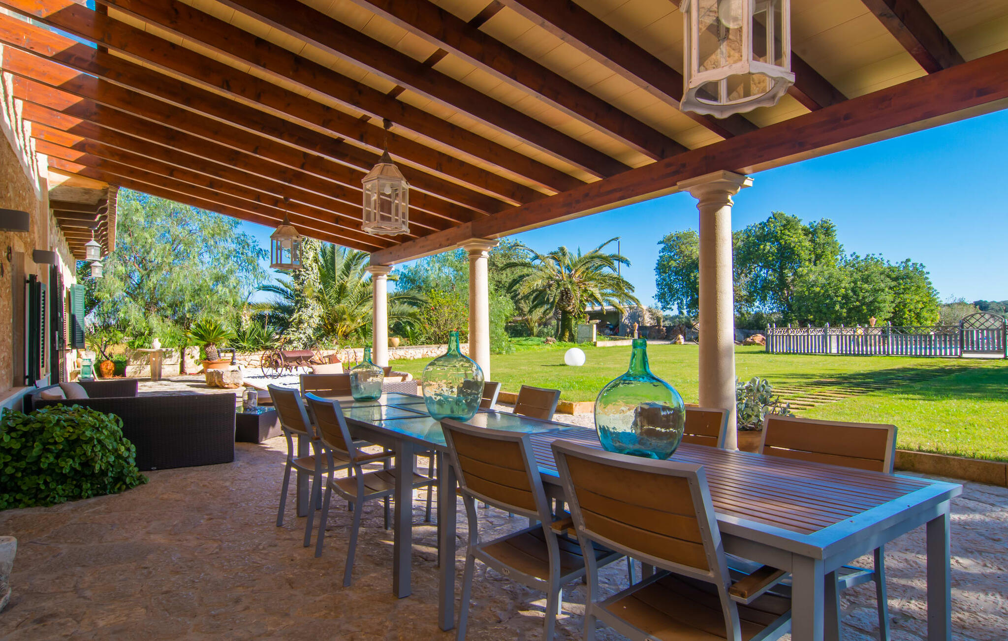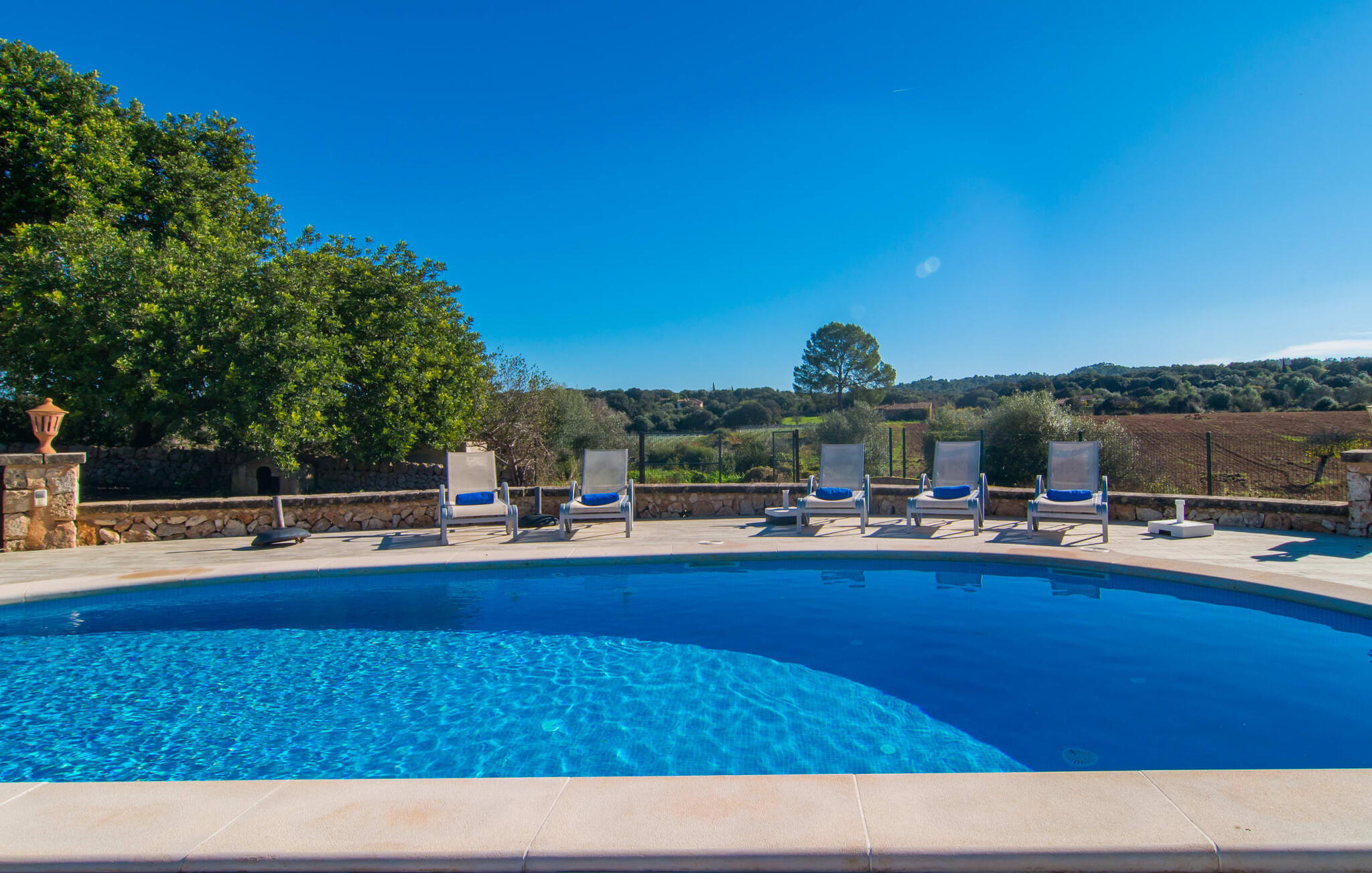 Als de muren van de verfijnd gerenoveerde villa "Son Nadal" konden spreken, zouden ze de rijke geschiedenis van het "oude" Mallorca onthullen. Dit indrukwekkende landgoed van 80.000 m² heeft overblijfselen uit het agrarische verleden, zoals een waterput en een houten ploeg, te midden van oude palmbomen en olijfbomen. Een geplaveid pad leidt van het schaduwrijke terras naar het prachtige zwembadgedeelte, omringd door een stenen zonneterras waar je kunt ontspannen onder grote parasols. Op het overdekte terras staat een lange eettafel waar je kunt genieten van zomerse gerechten, misschien wel bereid op de barbecue.